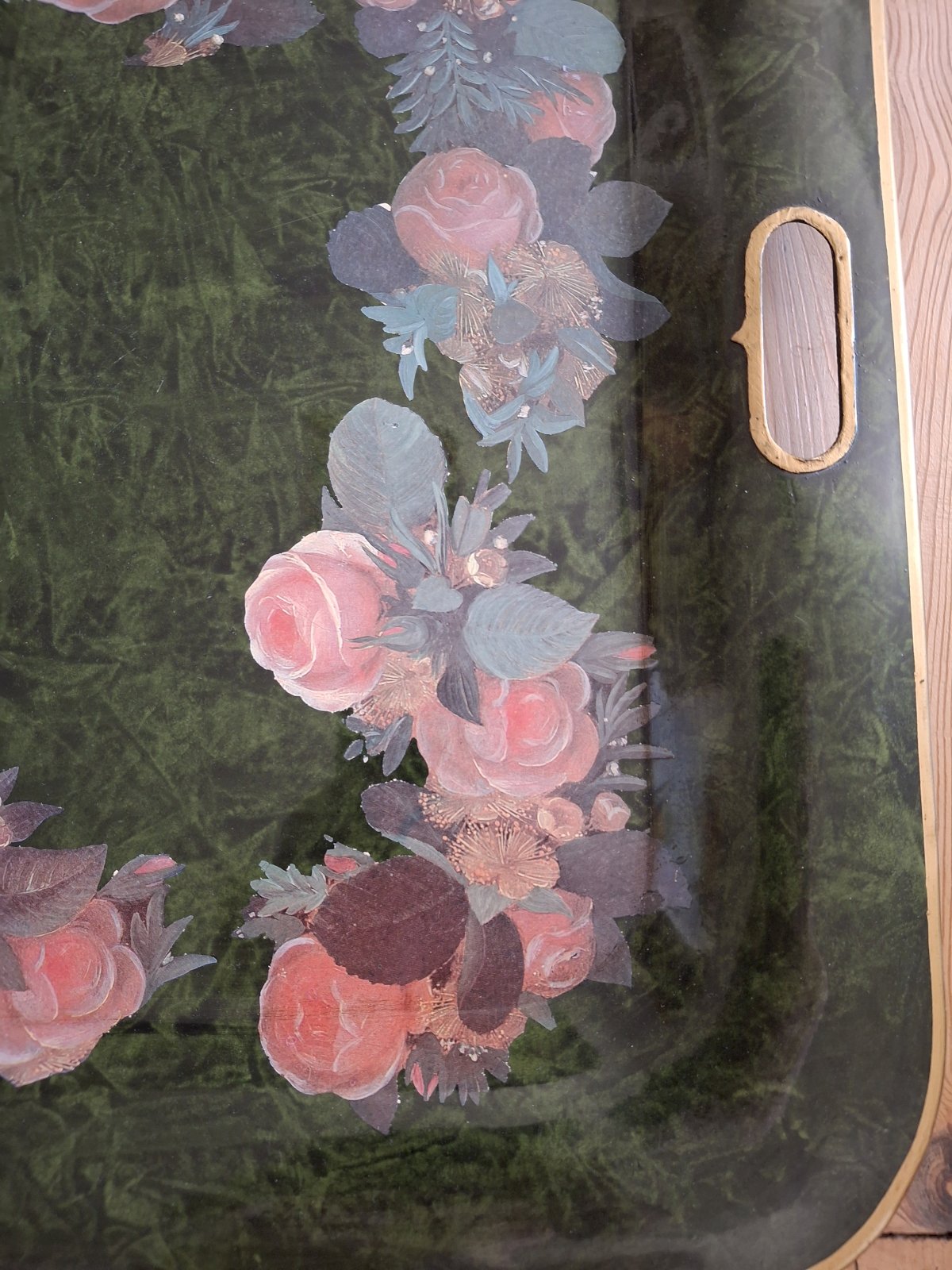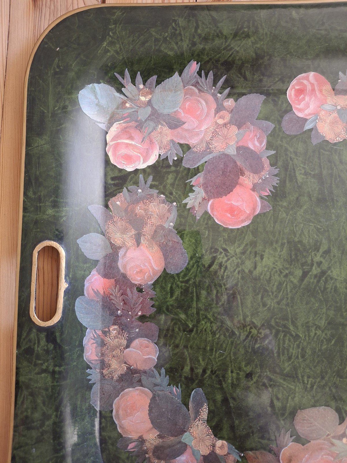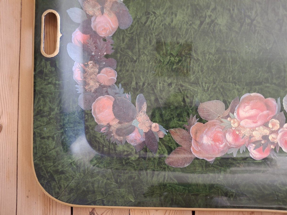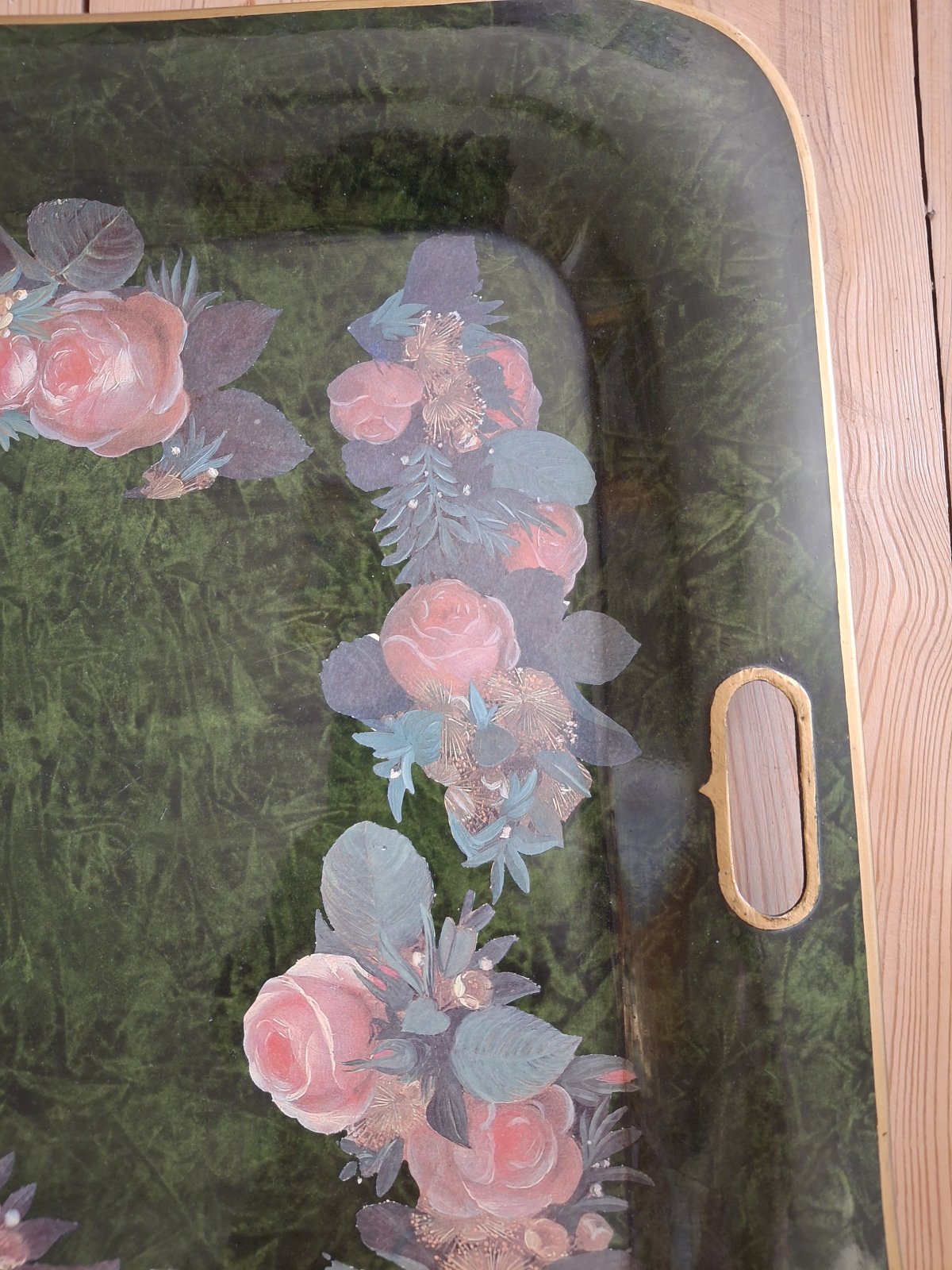 Large painted metal serving tray with handles 74.7 X 55.5 cm.