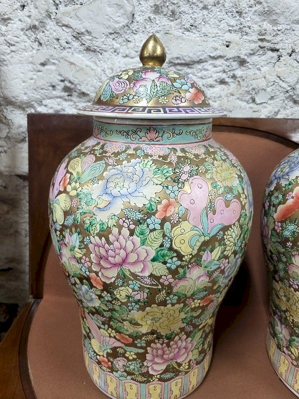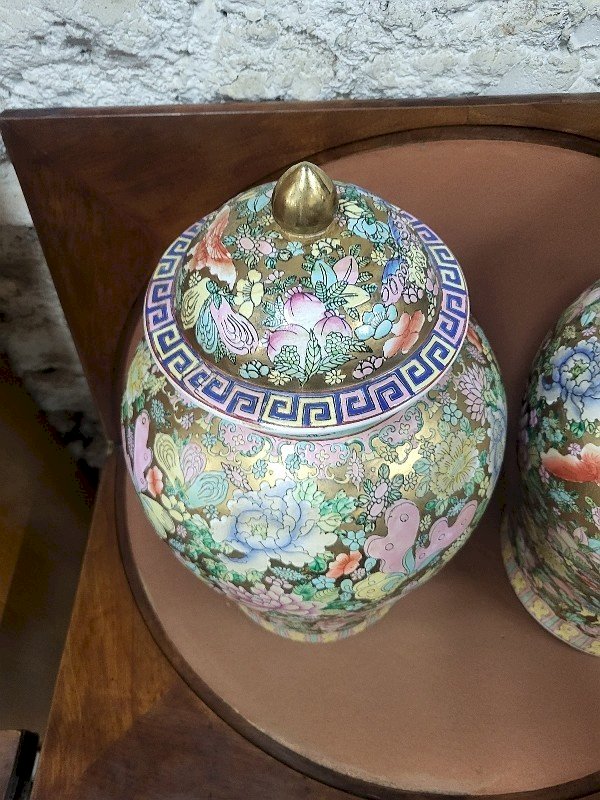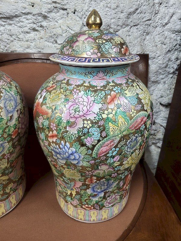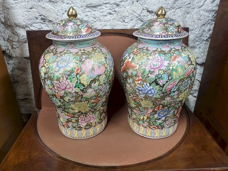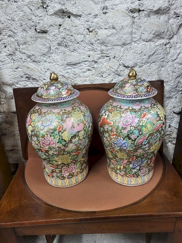 Magnificent and large pair of Asian vases with lids, they are in perfect condition. There are felt pads that have been glued under the feet and inside to prevent the lids from moving (see photos). It is a very beautiful model of great quality, measuring 50 cm high with the lids and 40 cm high without, and 28 cm in diameter.