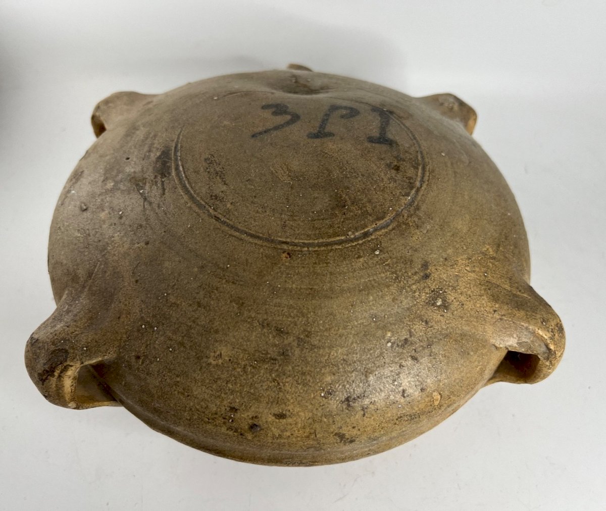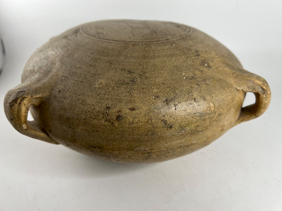 Ancient pilgrim flask made of terracotta, large size, with a beautiful flattened lenticular body. The piece features six small handles around the perimeter, which once allowed a cord to be passed through for carrying it crossbody. The side neck is broken, as seen in the photos: a wound of time that tells its journey. Likely Mediterranean work, 19th–early 20th century, in the style of canteens/pilgrim flasks inspired by antique models. Under the base, an old inventory number indicates a provenance from a collection. Dimensions (approx.): Diameter: 29 cm (≈ 11.4 in) Height: 10 cm (≈ 3.9 in) An ideal piece for collectors of ancient ceramics, decorators, or archaeology enthusiasts. Very careful and secure shipping. terracotta pilgrim flask, terracotta canteen, water flask, Mediterranean pottery, antique style flask, pilgrim flask, archaeological style pottery, rustic terracotta, collectors canteen, vintage pottery flask Type: Flask / pilgrim flask Origin: France Country of origin: France Material: Terracotta
