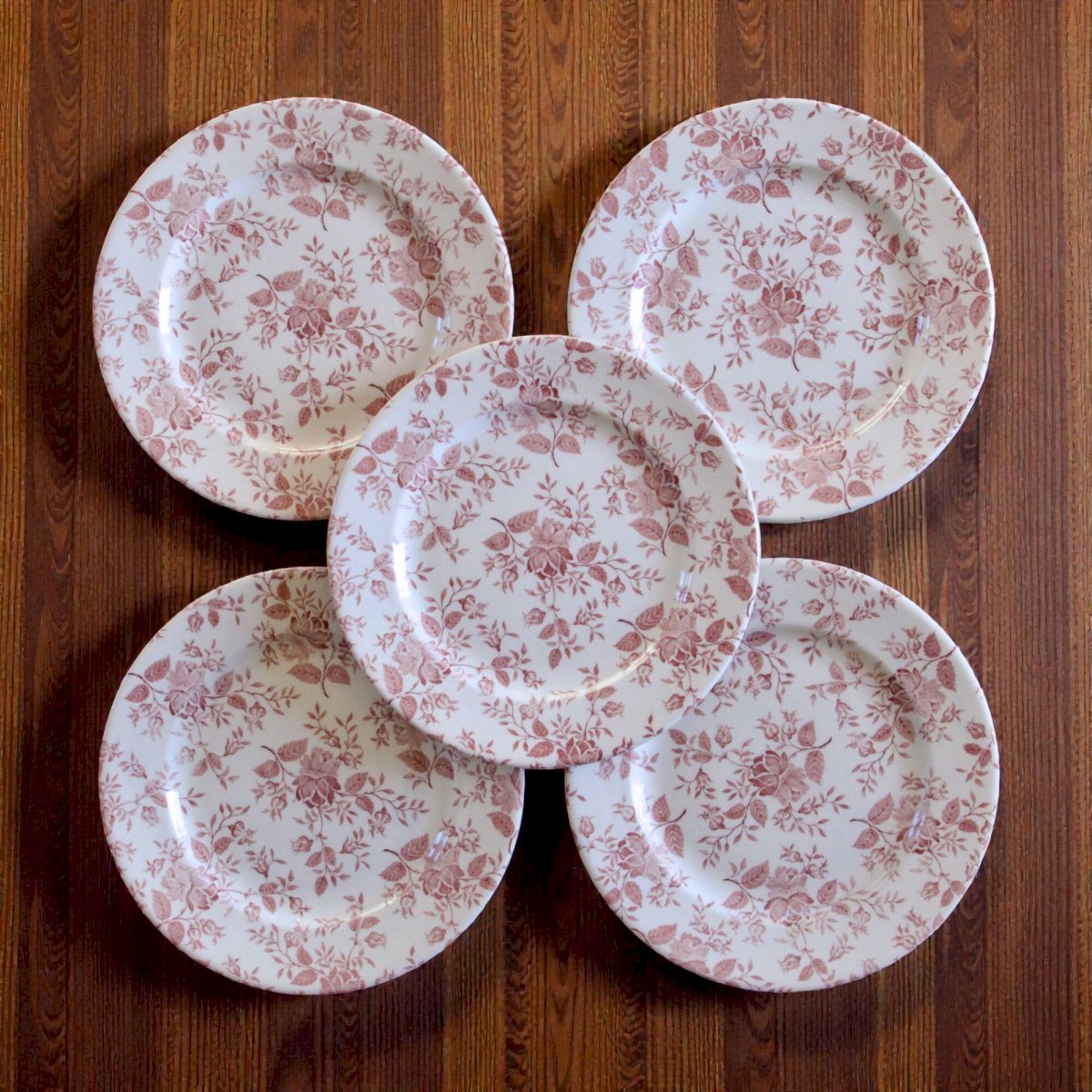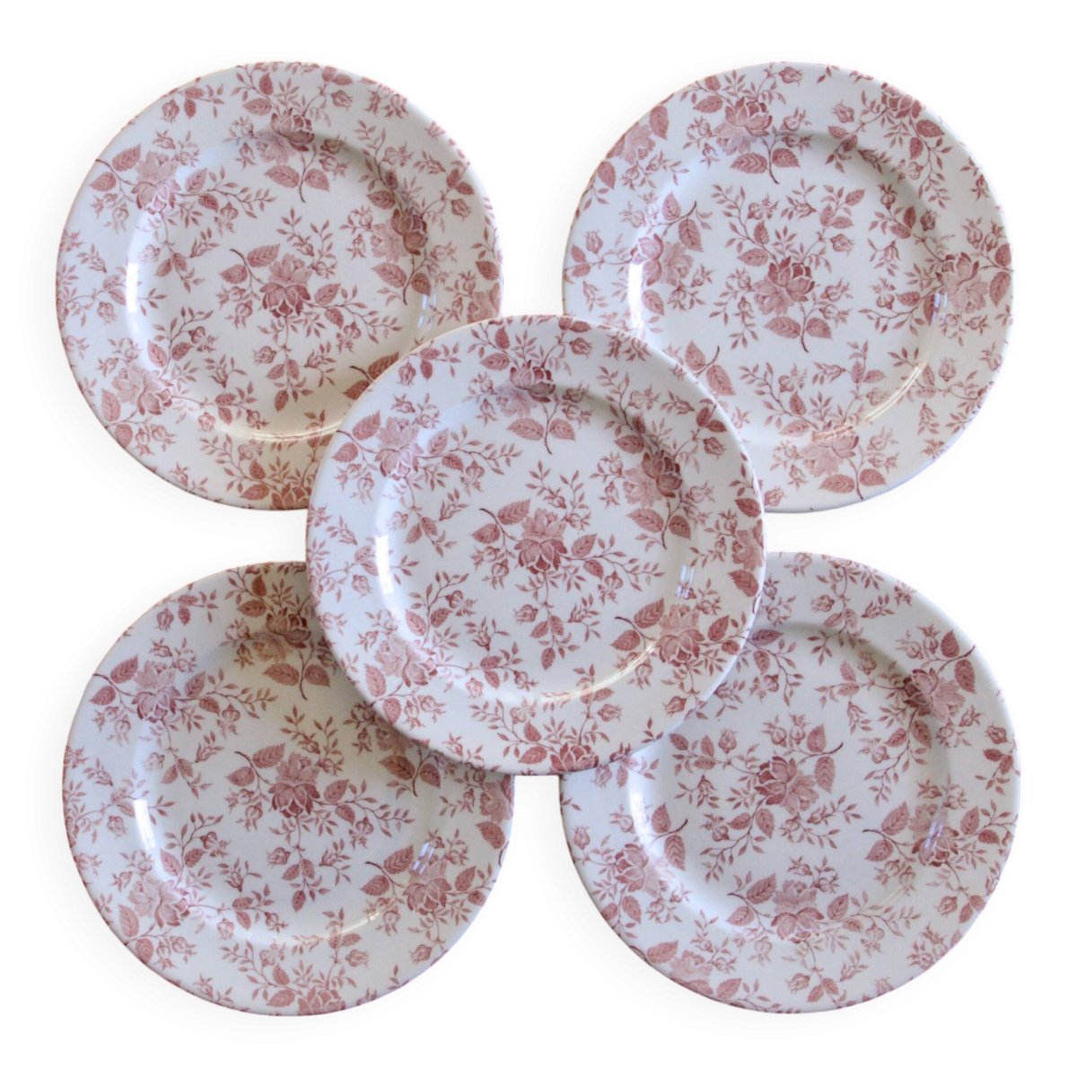 Set of 5 large flat plates in English earthenware signed EIT England. Beautiful decor of a multitude of blooming and bud pink flowers, finely inspired by the fabrics of Jouy and floral chintz very popular in England, in romantic Victorian style. Soft powder pink and old rose color. They are large in size. They are in very good condition, with a nice shine, no chips. €13 per plate. The dessert plates from the same collection are also available. See our other listings. ? 25 cm in diameter. ✨ Very careful shipping. ✨ We have other listings online, feel free to take a look. 12/25 Enoch Wedgwood Churchill Spode. L: 25 l: 25 H: 25