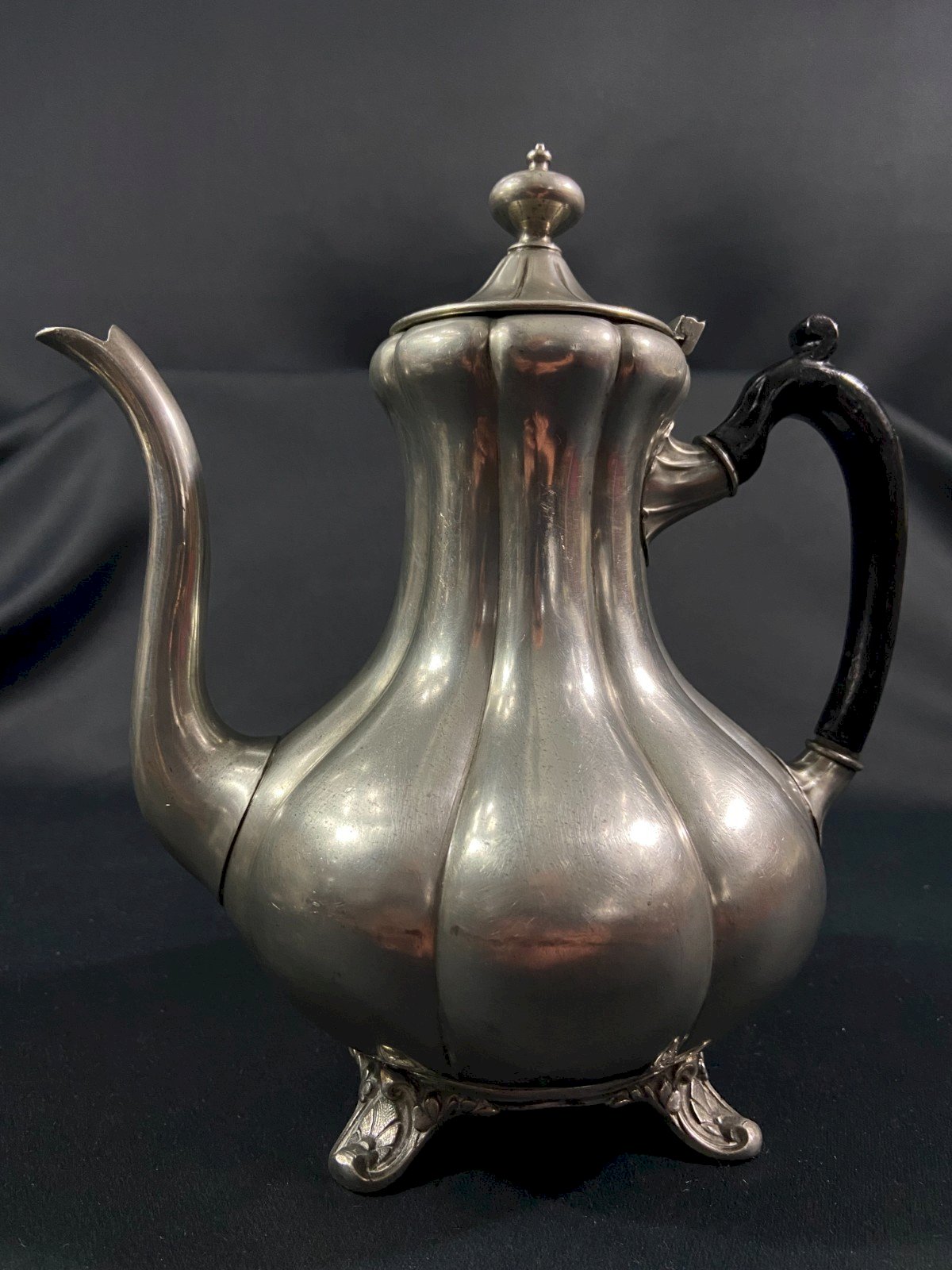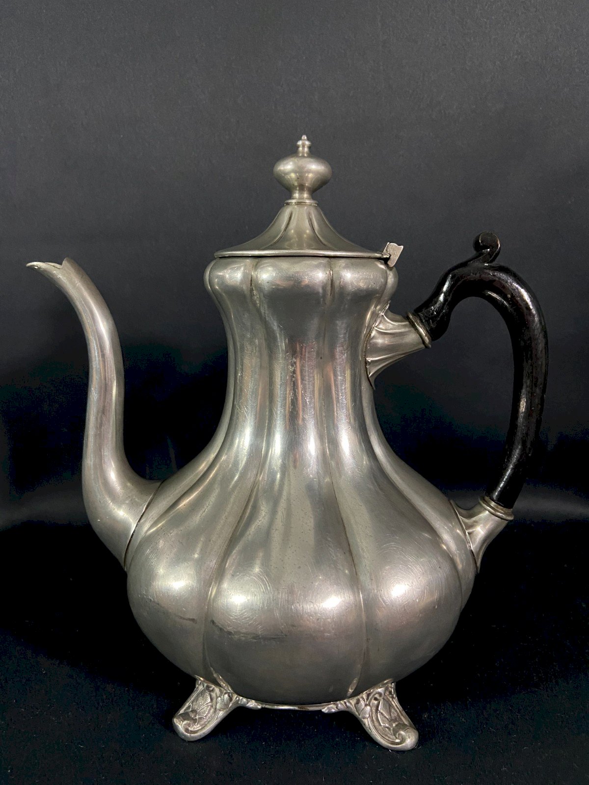 Large ribbed English Sheffield pewter teapot Very beautiful proportions Maximum dimensions: Height 25.8 x 23.5 x 16.2 cm Weight: 1005 grams I will only note small usual details Shipping VERY worldwide Authenticity: Original Brand: Sheffield Type: Tableware, Kitchen Origin: England Subtype: Teapot Material: Pewter