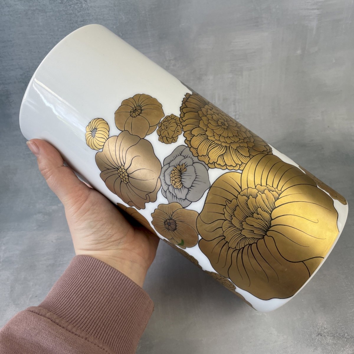 Large German porcelain cylindrical vase, Rosenthal Germany, gilt floral decoration, signed Alain Le Foll. Height ~ 25 cm, base diameter ~ 12 cm, total weight ~ 1.1 kg. Very good condition, slight signs of age on the decoration, one felt mark, see photos. Remember to combine your purchases to reduce shipping costs! Country of origin: Germany.