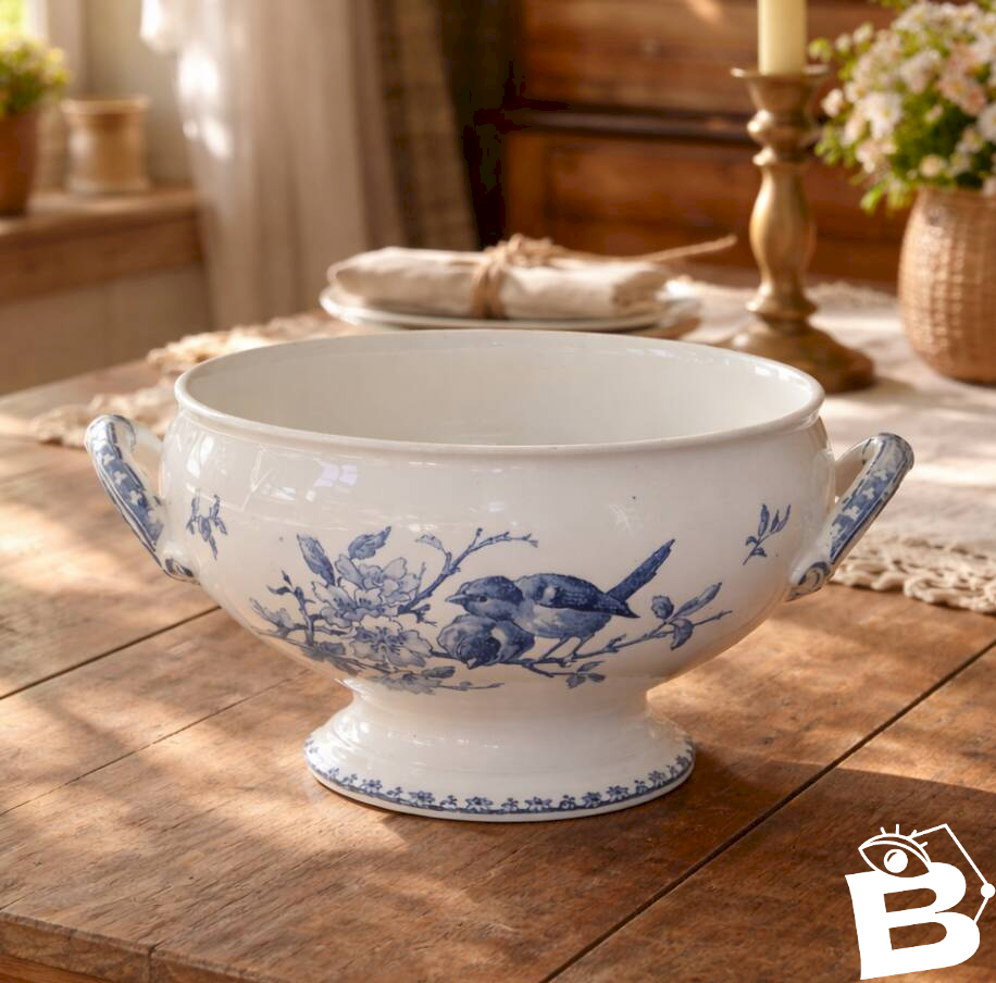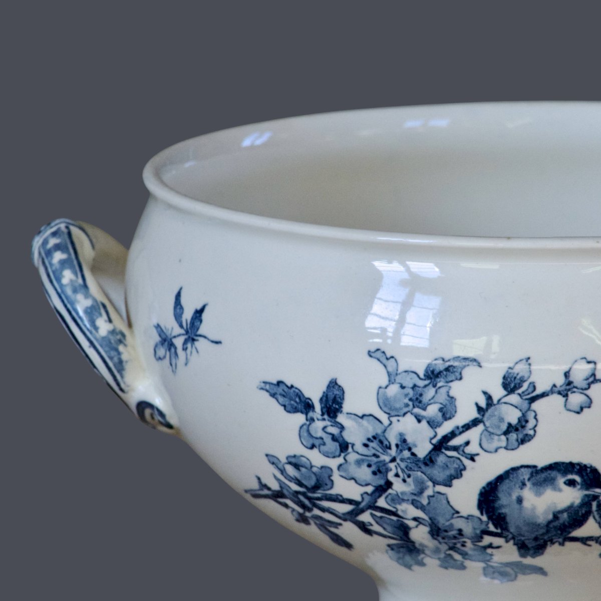 Wonderful and large antique salad bowl / vegetable dish (soup tureen) from the 19th century, stamped Sarreguemines, Favori collection, blue stoneware. Iconic decoration featuring several birds perched on flowering branches or flying through a vegetal decor. Beautiful openwork handles. In very nice condition, shiny earthenware, no cracks, no chips. ? 28 cm wide including handles, 23 cm wide without, 14.5 cm high. ✨ Very careful shipping. ✨ Professional shop. ✨ You will receive an invoice and benefit from after-sales service after each purchase. ✨ We have other listings online, feel free to take a look 1kg.01/26. L: 28 W: 23 H: 14