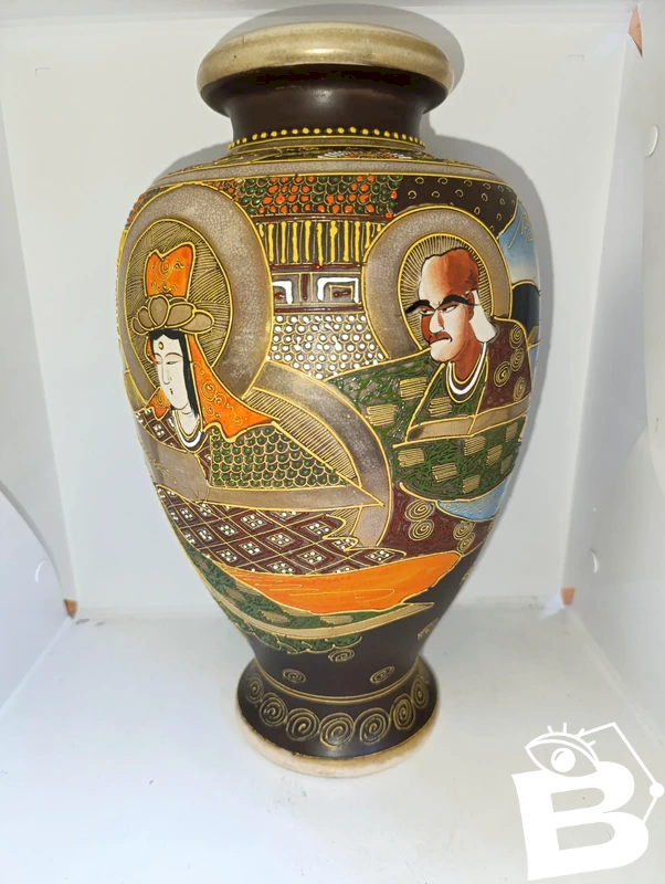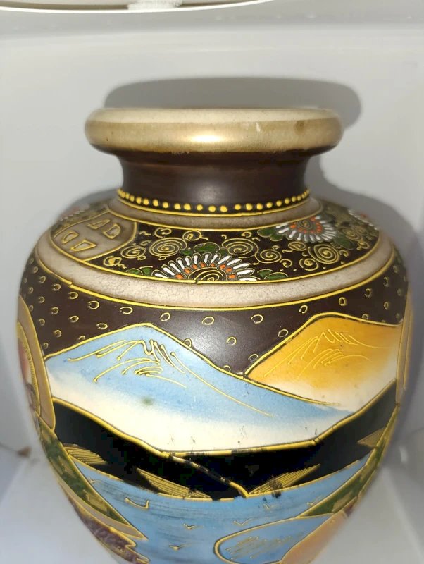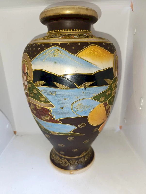 large Satsuma vase decorated with figures and a mountain in good condition, height 37cm, just wear on the gilded parts, very decorative and beautiful size