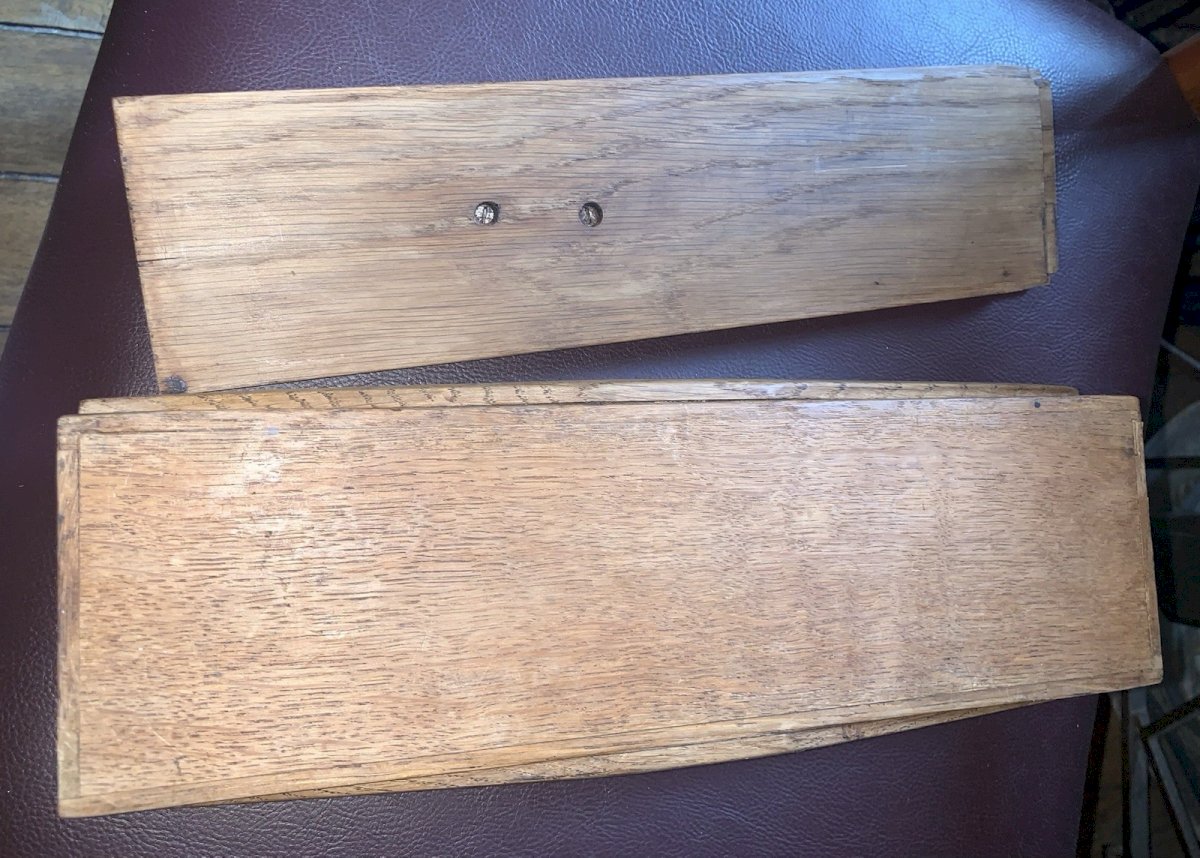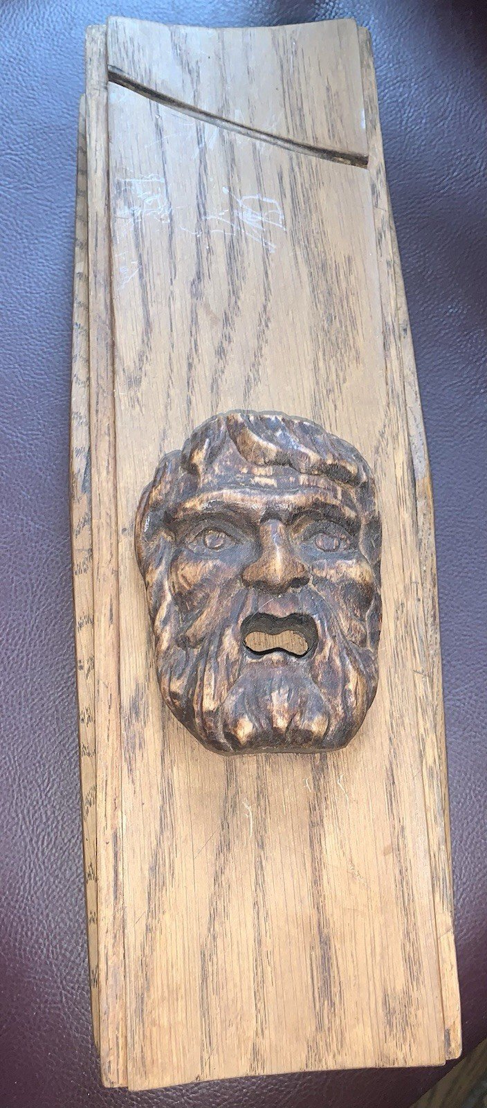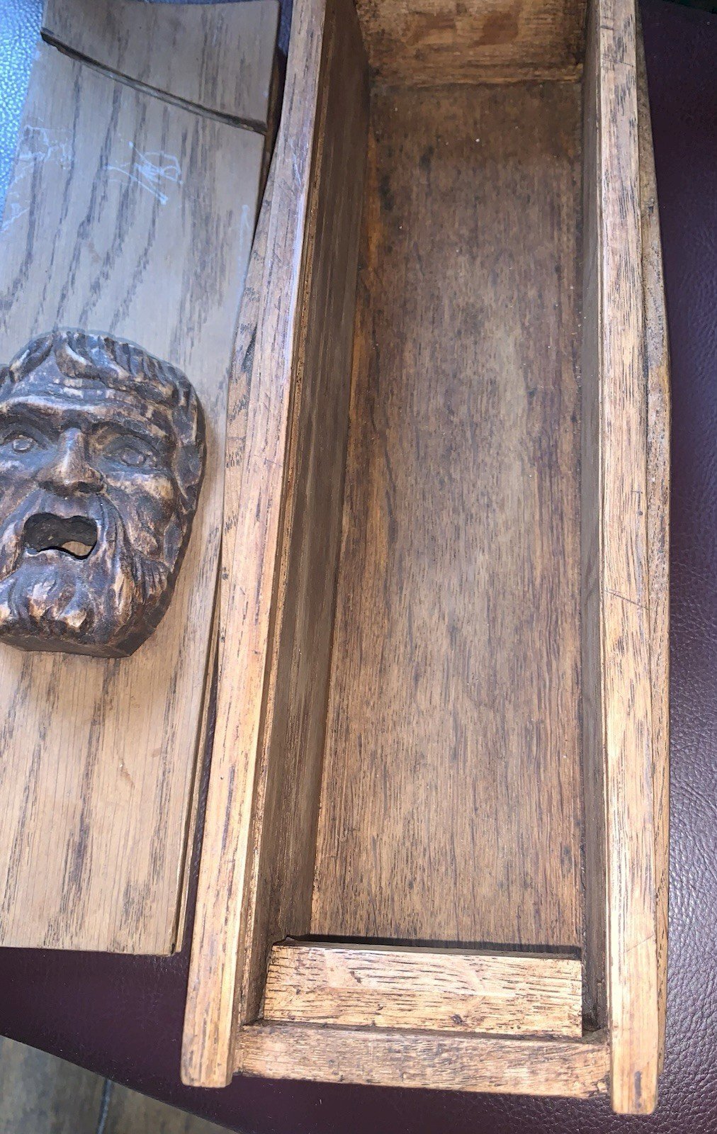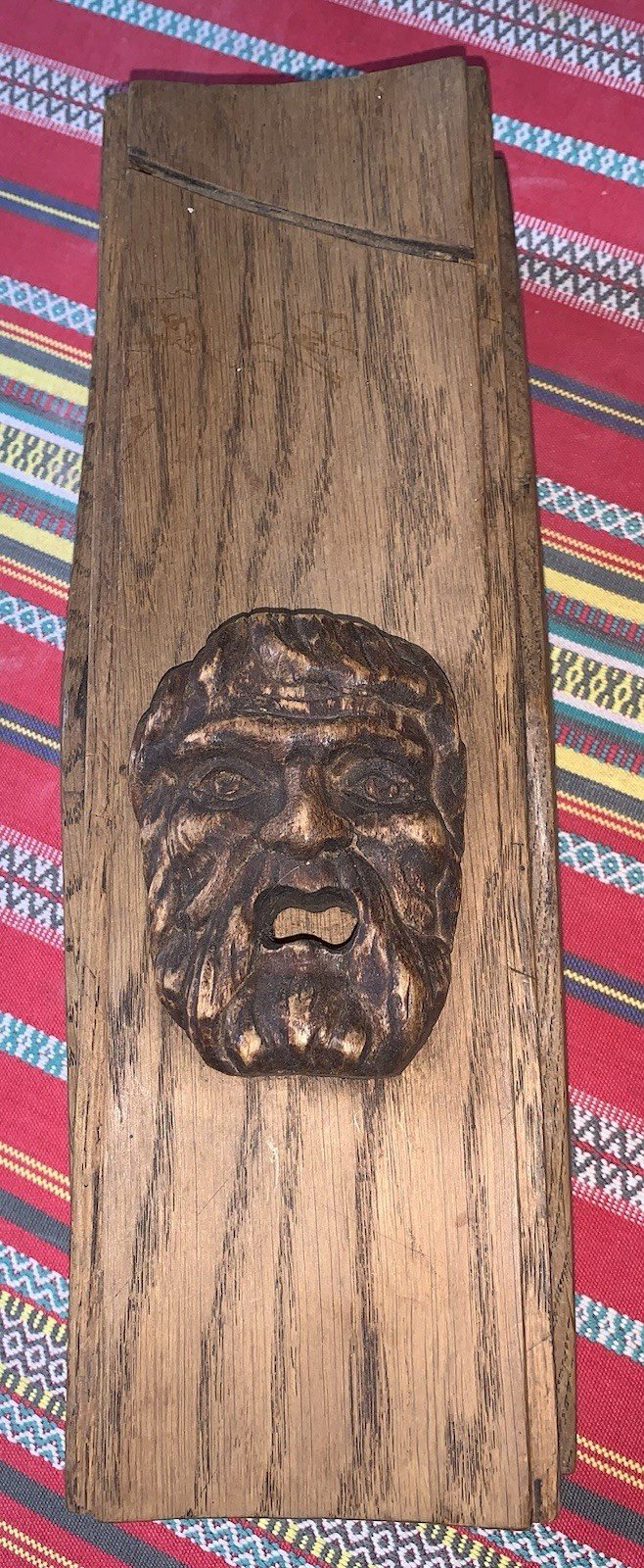 Large and ancient box for sculptors or painters Sliding lid Oak Decorated with a head of Bacchus In nice condition Length: 32.5 cm Width: 11 cm Height: 10.5 cm Weight: 890 g Authenticity: Original Type: Professional object Period: Art Nouveau Origin: France Subtype: Box Material: Wood