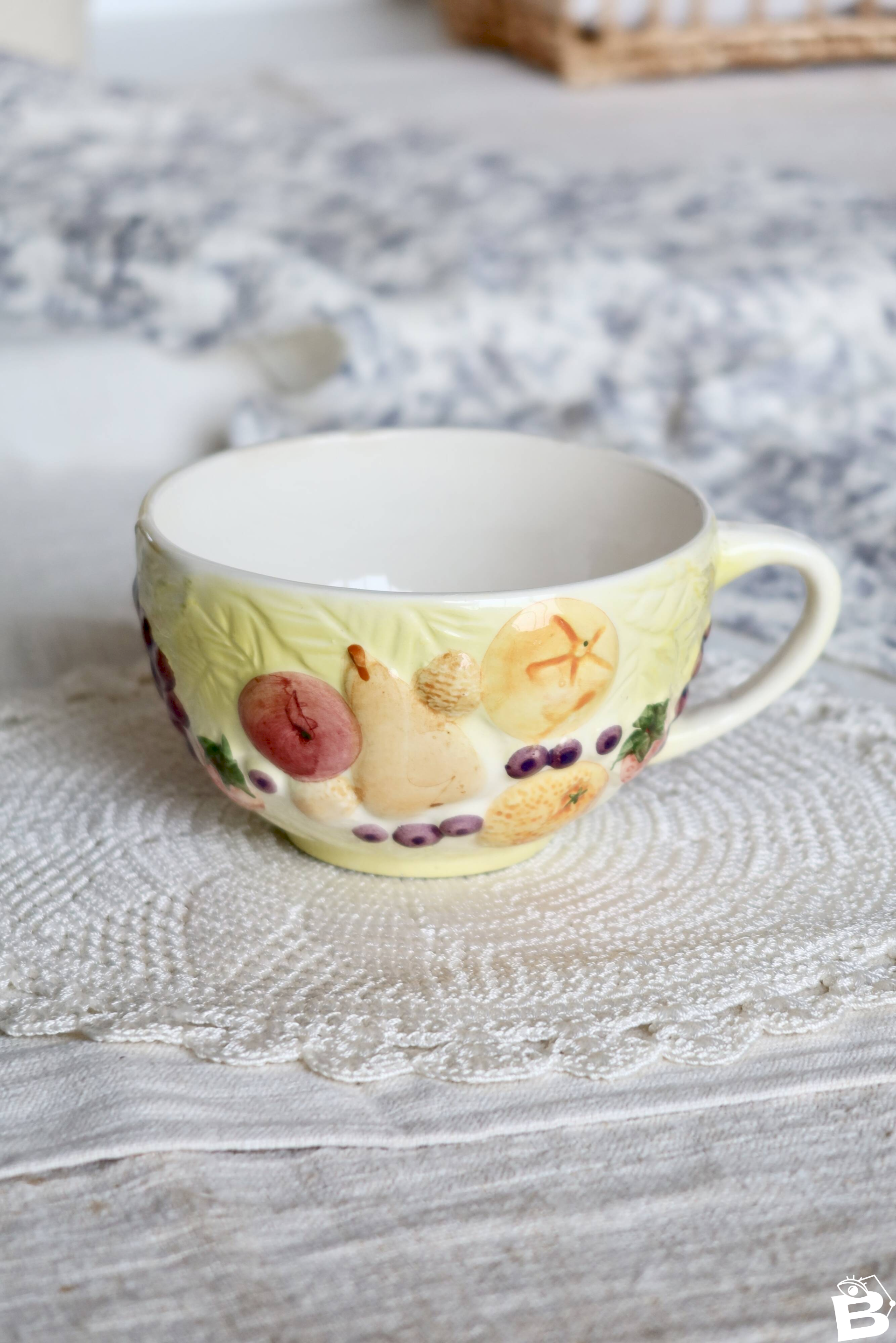 Large vintage earthenware cup with slip-decorated fruit pattern.