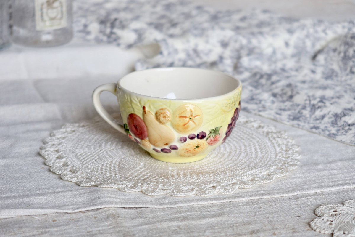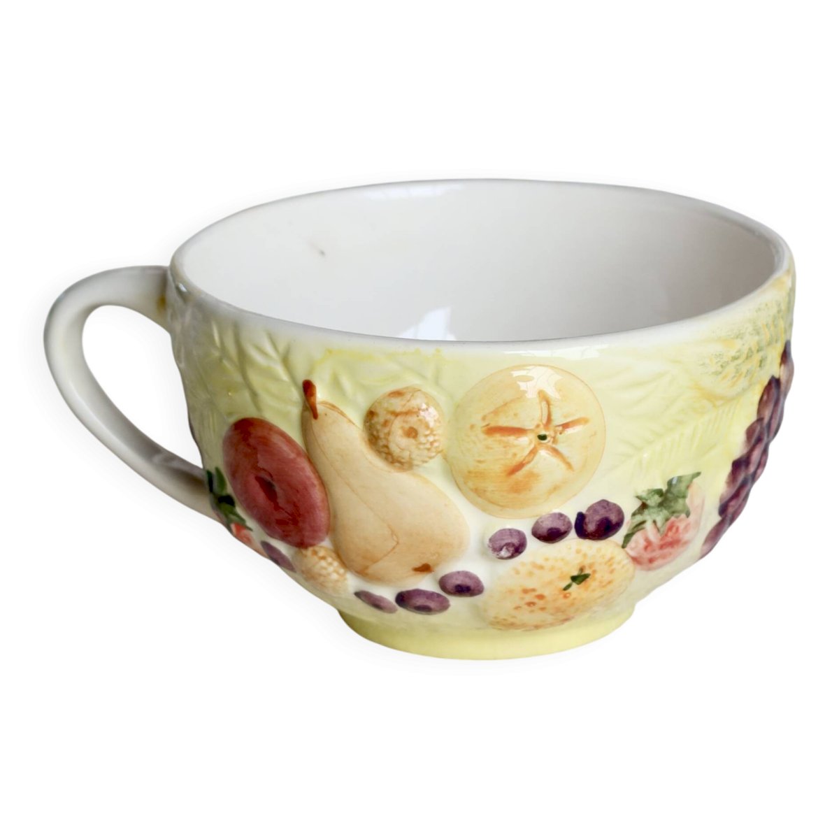 Large earthenware mug in the barbotine style, featuring a relief decoration of fruits on a pale yellow background and a white interior.