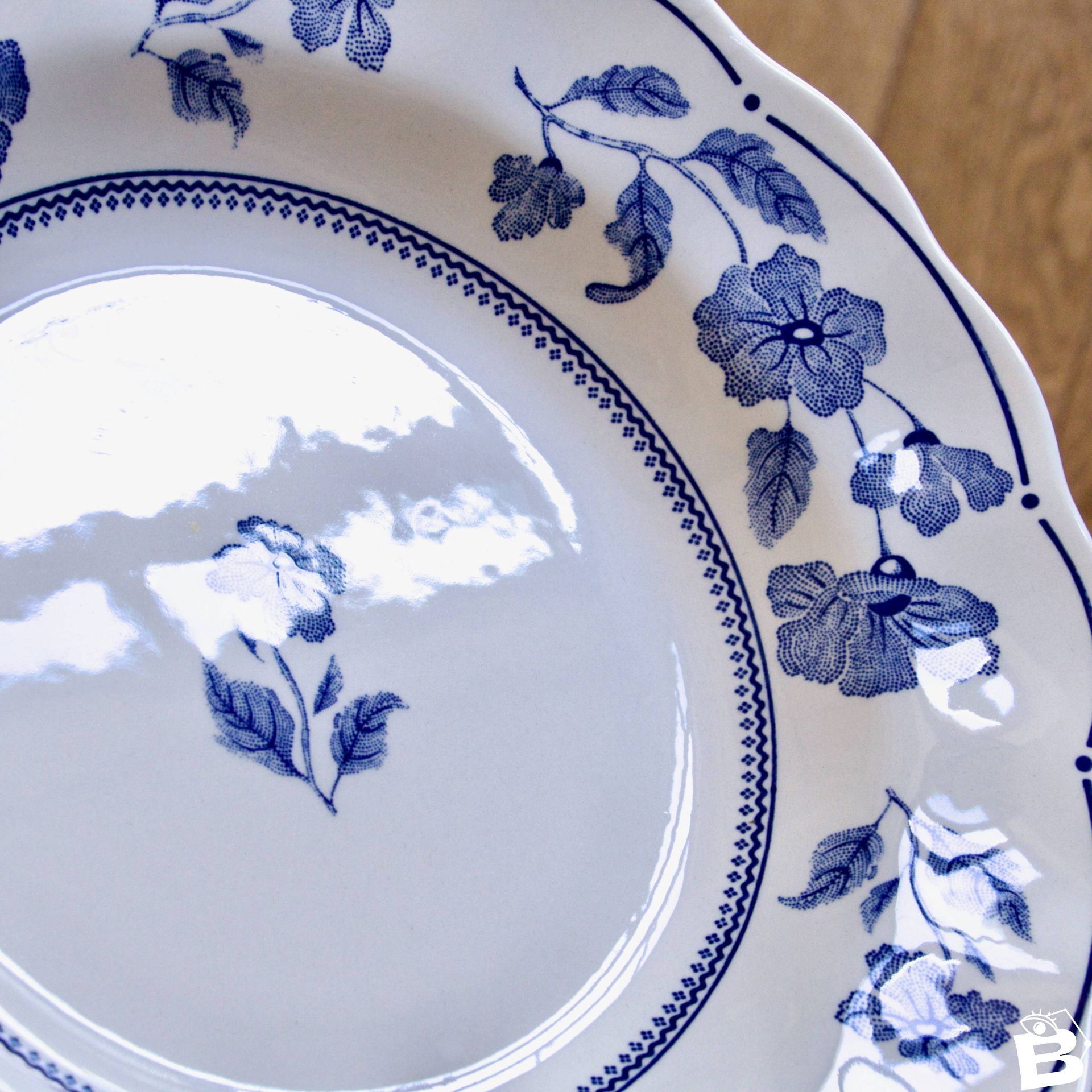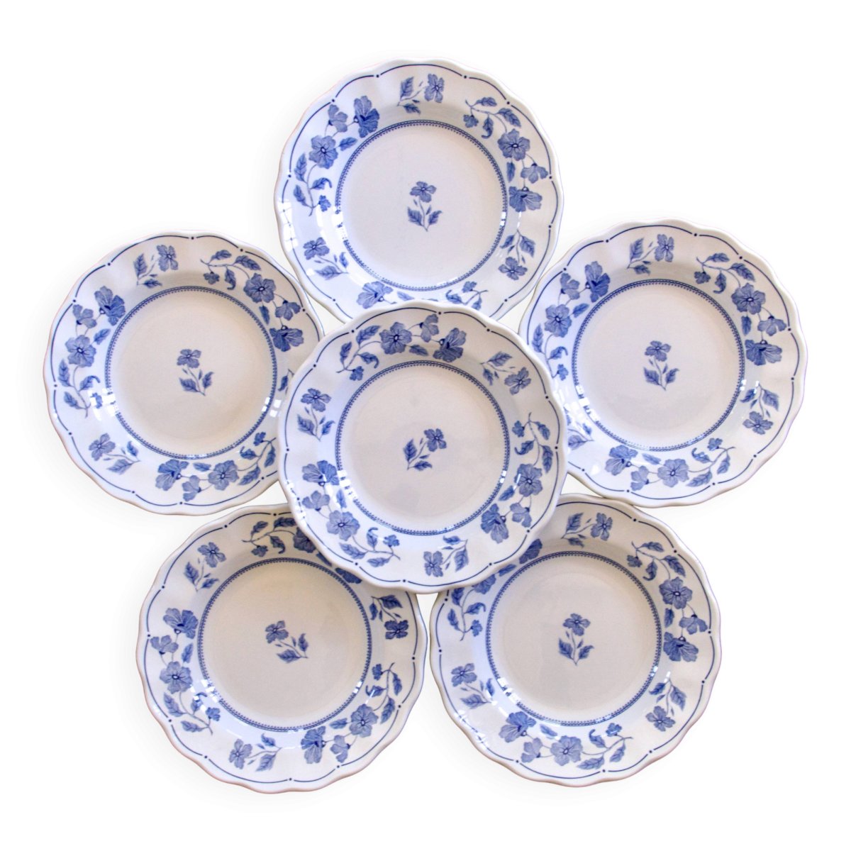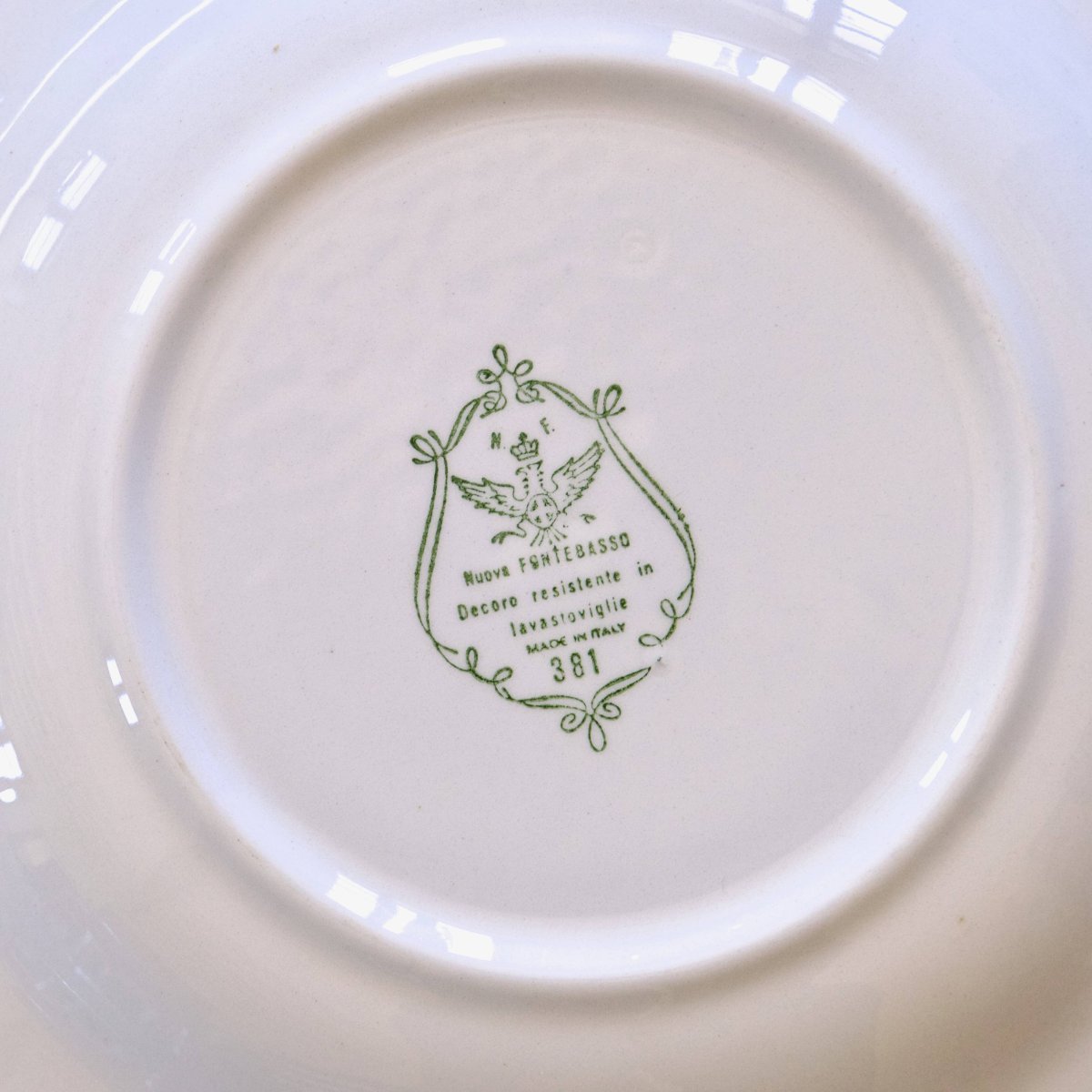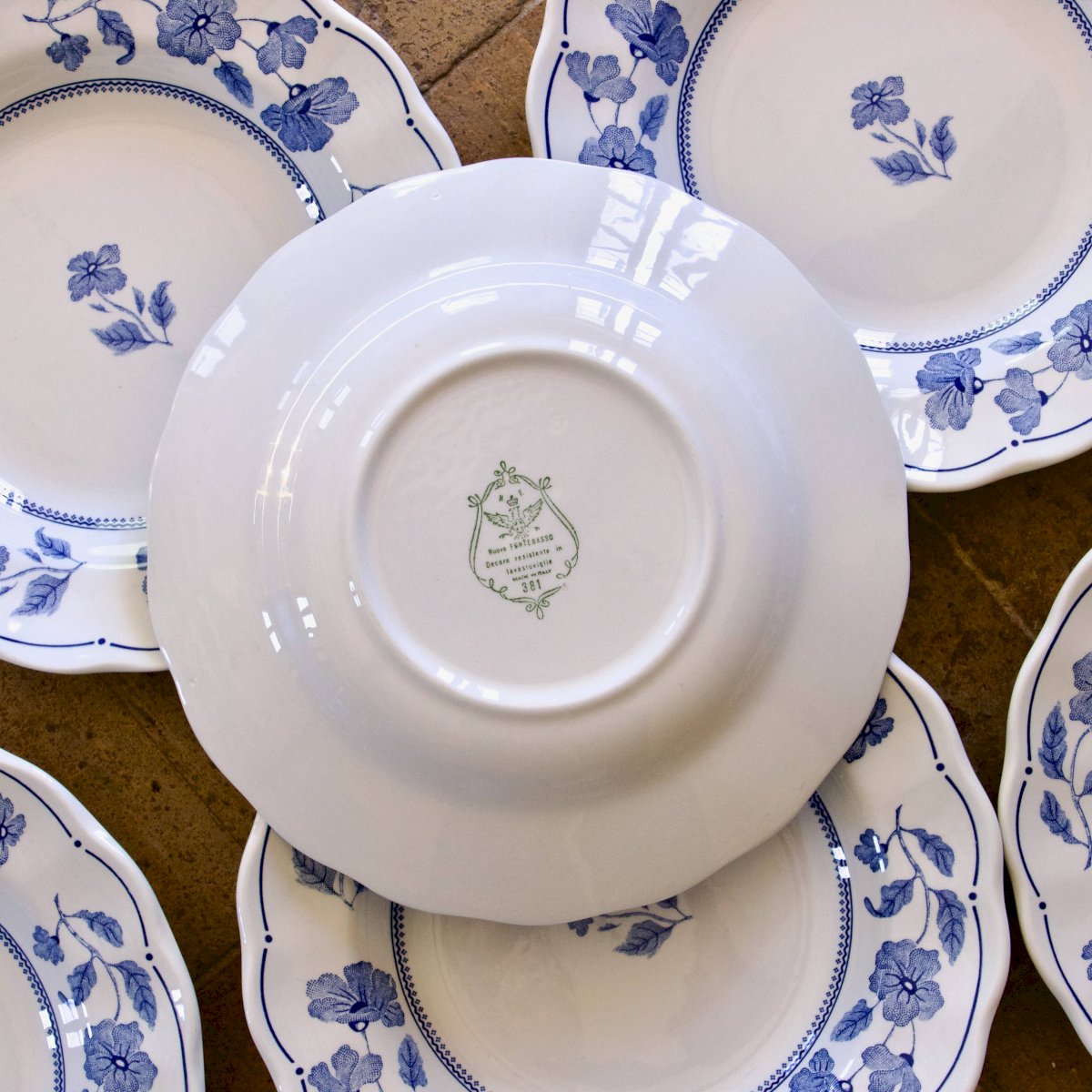 Magnificent set of 6 large vintage Italian plates stamped Nuova Fontebasso. For a touch of dolce vita at your table, they have a lovely wavy shape reminiscent of petals and are finely decorated with an engraved floral pattern in a soft blue color. Geometric inner trim. The decoration is guaranteed to be unalterable. They are in perfect condition. Deep plates ideal for all types of dishes, from summer pastas to autumn soups. ? 24 cm in diameter. ✨ Very careful shipping. ✨ We have other listings online, feel free to take a look! 11/25. L: 24 W: 24 H: 24