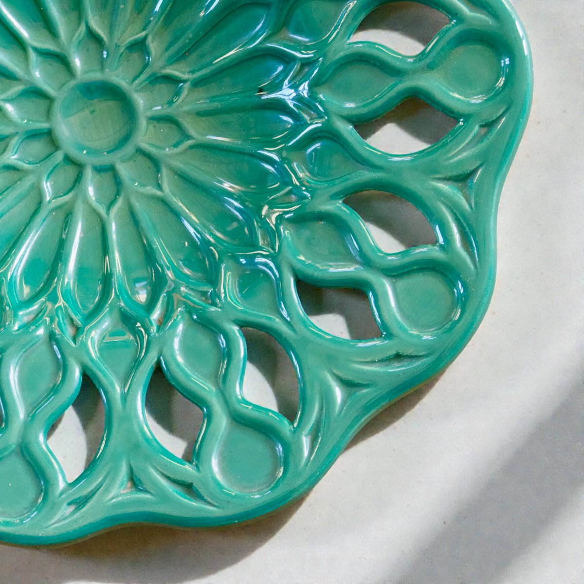 Large and beautiful vintage ceramic fruit bowl with openwork design, dark green color. Geometric mandala relief pattern. A decorative piece as much as a functional one, ideal for a beautiful vintage table or buffet. Typical aesthetic of the 1950s - 1960s. It can also serve as a very large entrance catchall. Large size. It is in very good condition. ? 35 X 7 cm. ✨ Carefully packaged for shipping. ✨ Professional shop. ✨ You will receive an invoice and benefit from after-sales service after each purchase. ✨ We have other listings online, feel free to take a look. 12/25. L: 35 W: 35 H: 7