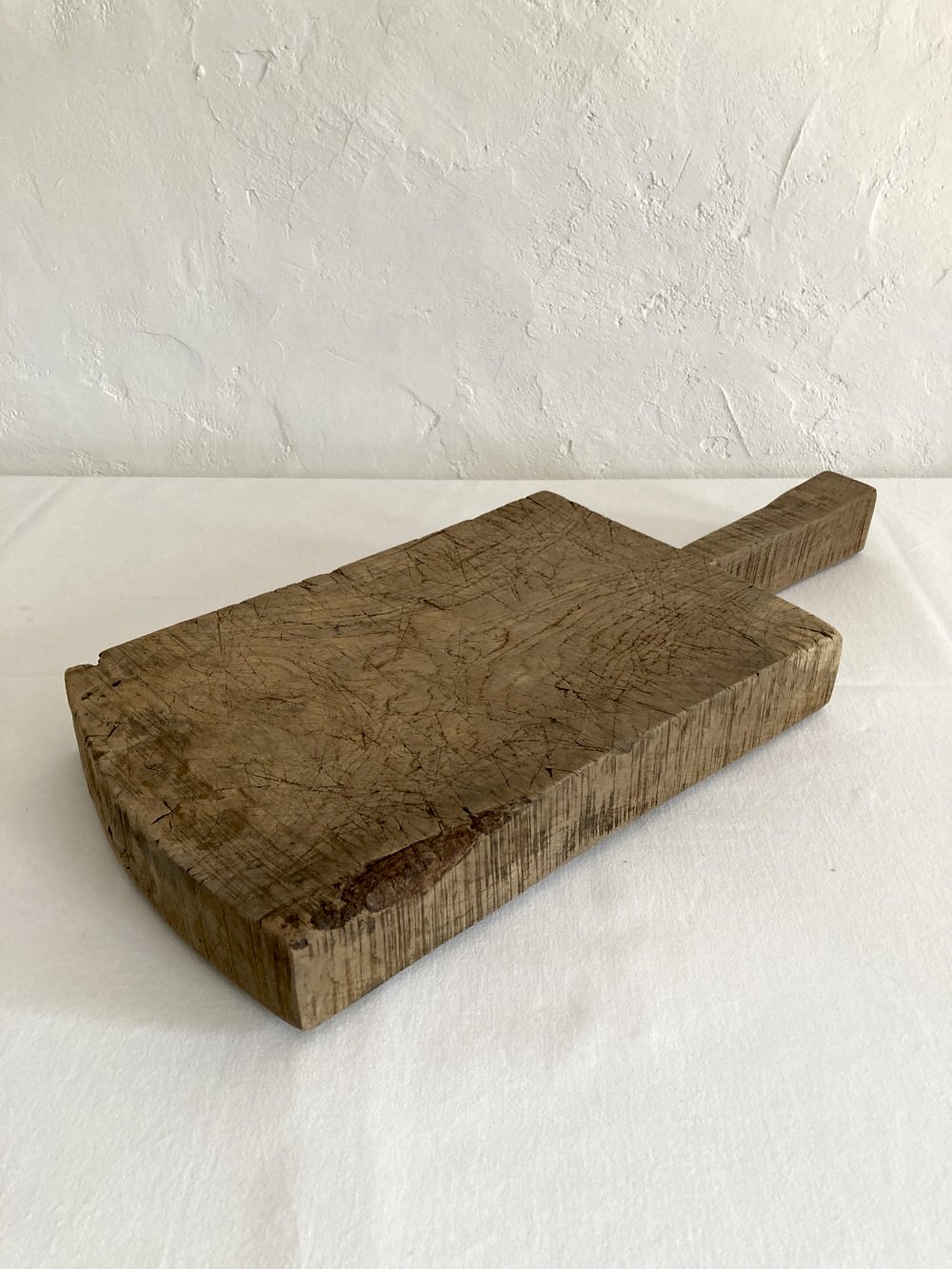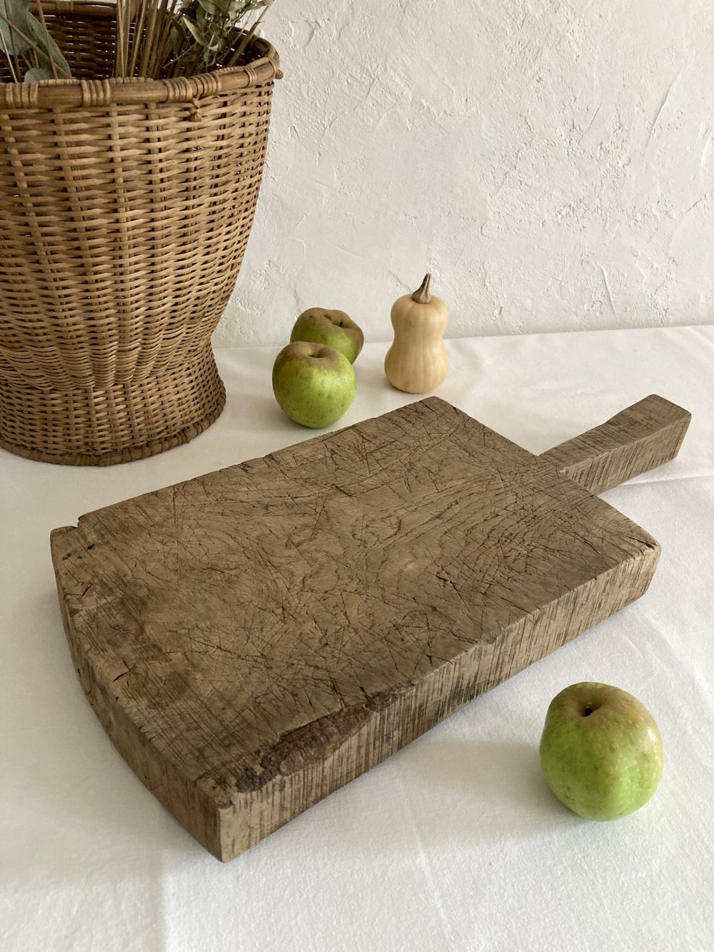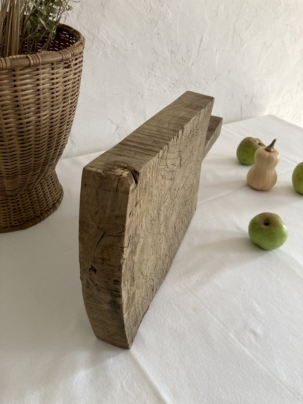 Beautiful large solid wood board/plank made from a single piece. It is thick (5 cm thick, dimensions below) and heavy with many cutting marks that give it all its character. One side is slightly warped and has hardly been used (as shown in the photos). It has been thoroughly cleaned and lightly sanded. Untreated.