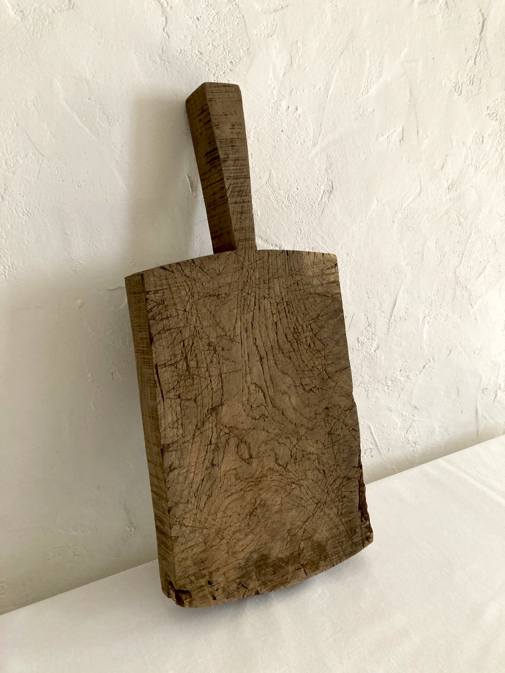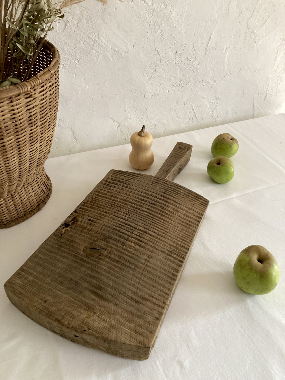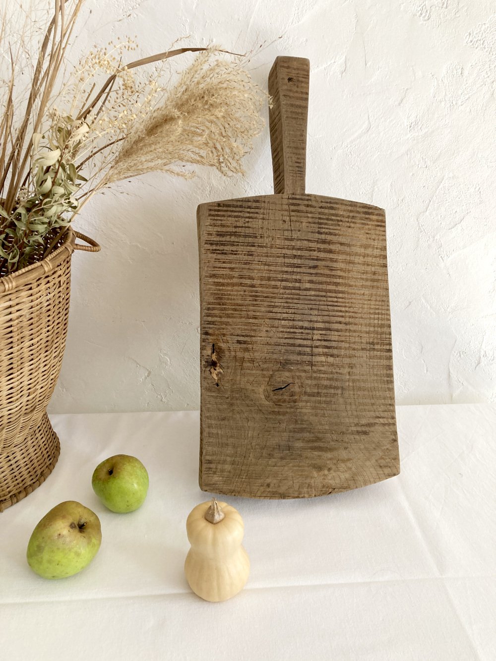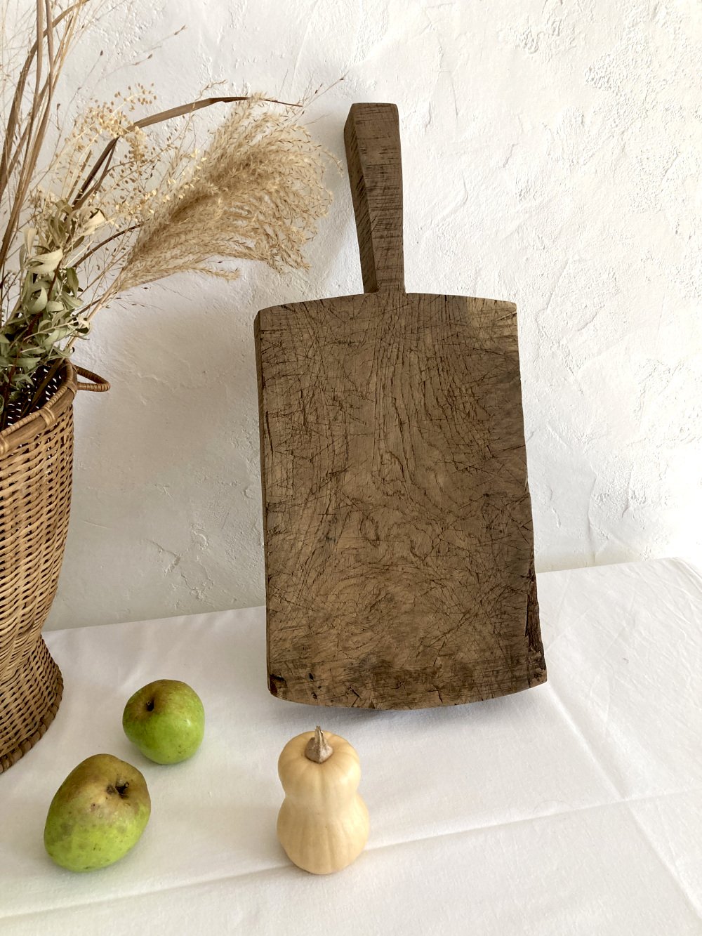 Beautiful large solid wood board/plank made from a single piece. It is thick (5 cm thick, dimensions below) and heavy with many cutting marks that give it all its character. One side is slightly warped and has hardly been used (as shown in the photos). It has been thoroughly cleaned and lightly sanded. Untreated.
