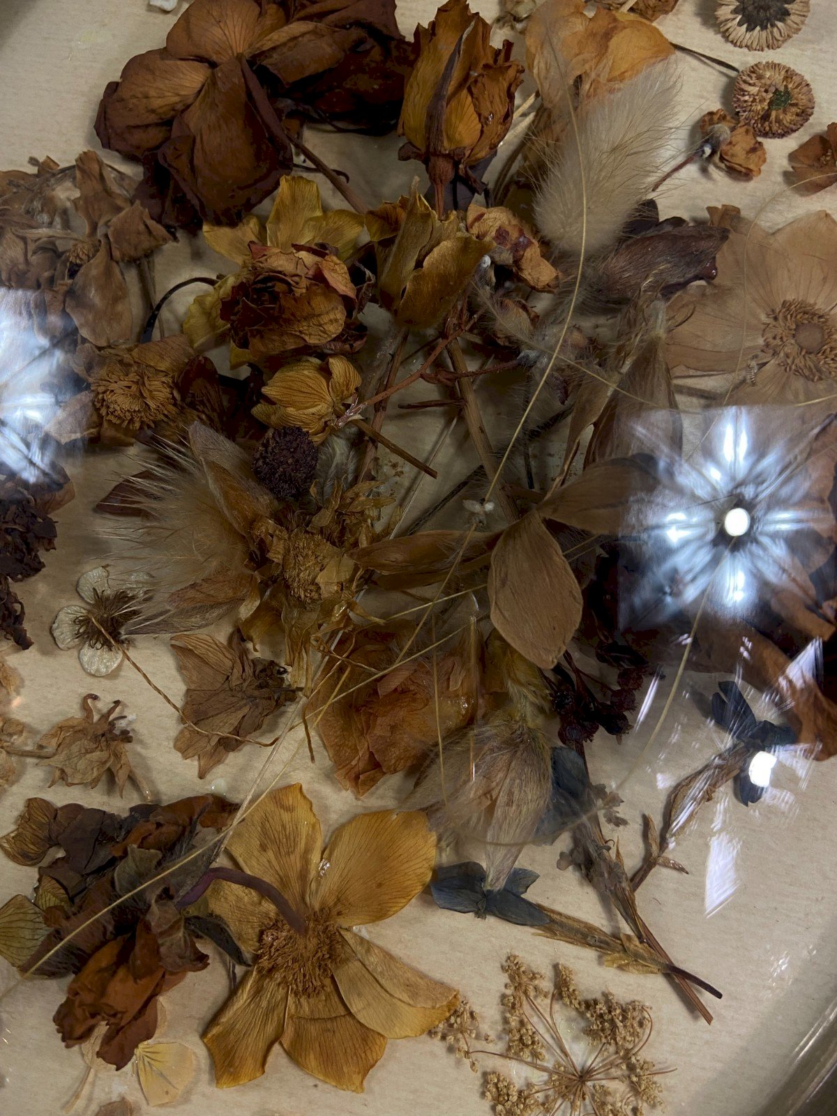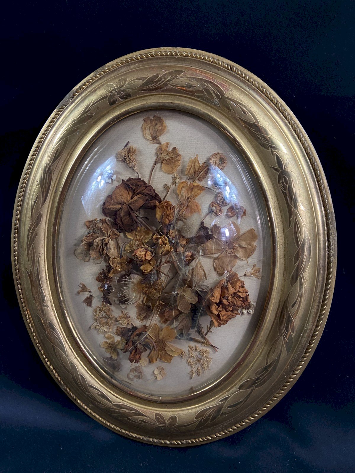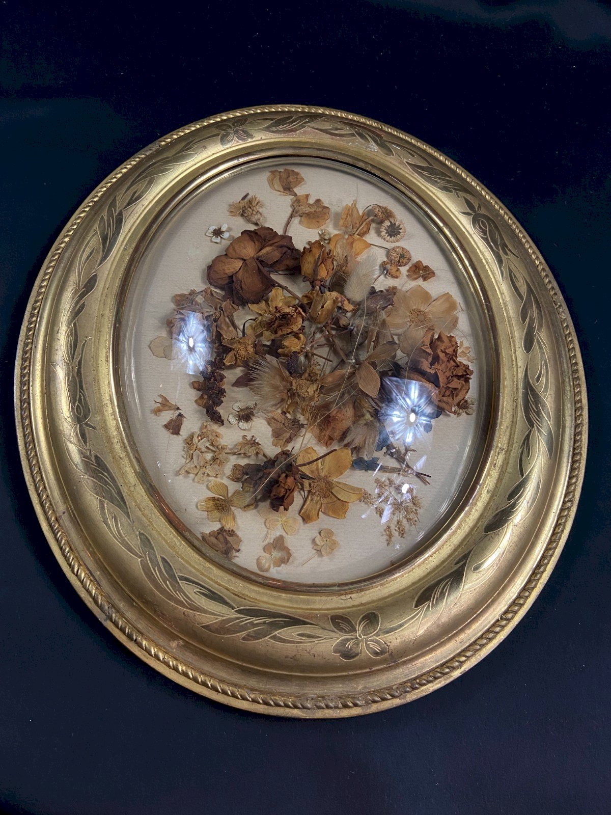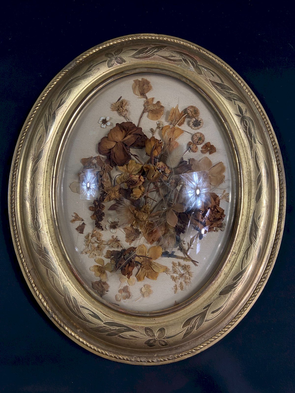 Large gilded wooden wedding frame with an oval view and convex glass from the 19th century, Napoleon III. Interior with dried flowers. Max dimensions: 47 x 39 x Thickness with glass 8 cm. Weight: 1632 grams. Very good condition (I will only mention a few minor signs of wear). Ultra-secure shipping worldwide - Pickup of orders possible by appointment at 7 rue Notre-Dame, 18000 Bourges. - Possibility of grouping within the same package: please contact me beforehand so I can calculate your optimized shipping costs. Color: Gold. Period: 19th century and before. Country of origin: France. Subtype: Frame. Material: Wood. Features: To be hung. Dimension (cm): 40x50.