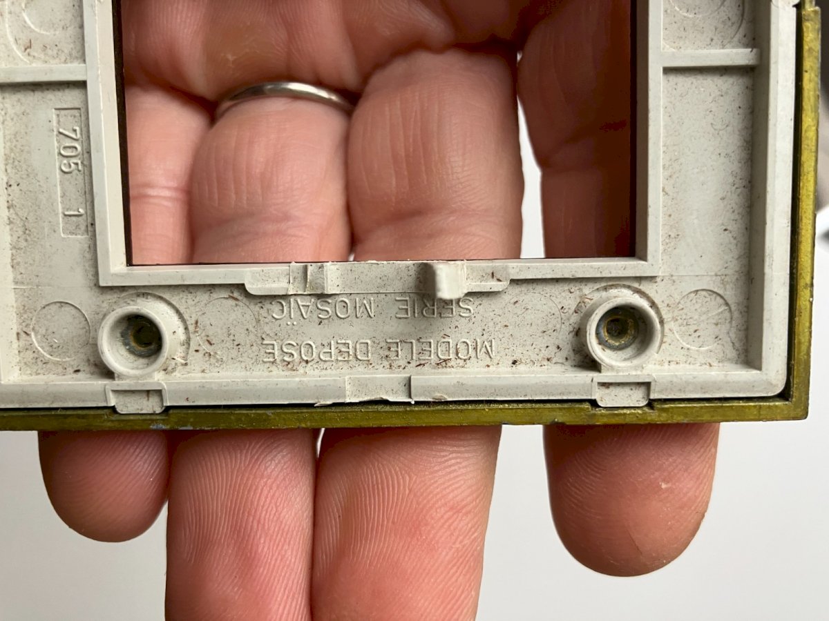 Legrand Mosaic 50 golden bronze cover plate with one broken mounting clip, see photo. Shipping via MONDIALRELAY. Condition: Used. Item has been used. Item shows some superficial signs of wear, fully operational and functioning correctly. It may be a demonstration model or an item returned to the store after a short period of use. Possible imperfections. Color: Gold. Brand: Legrand.