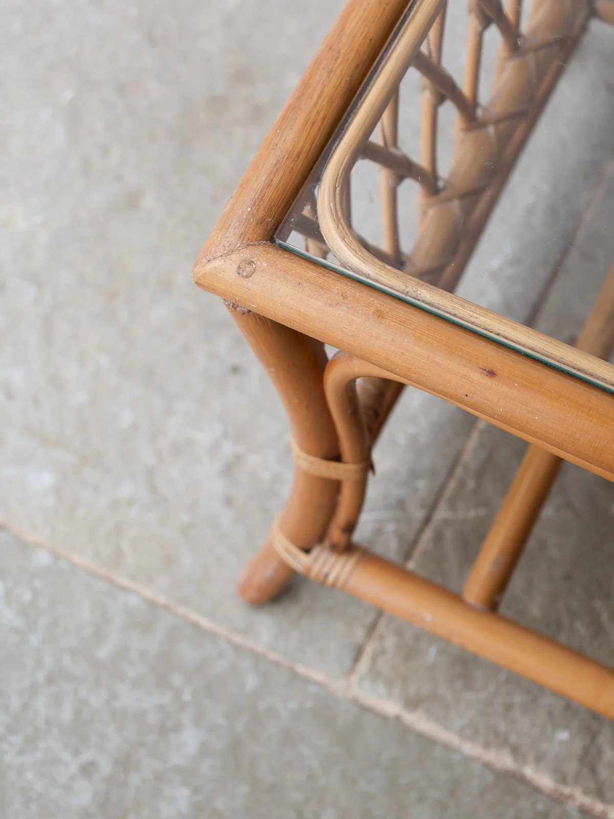 Adopt this coffee table made of rattan and glass, whose combination of rattan, bamboo, and a transparent top offers a light and warm silhouette. The bamboo edge frames the glass, and the natural weaving on the sides adds texture and character, perfect for a bohemian-chic or Scandinavian style living room. The generous size accommodates cups, books, and decorative objects, while the low height gives it a discreet presence, creating a friendly and bright atmosphere. Light signs of wear from time. Length: 95 cm Width: 50 cm Height: 48 cm Height under the top: 12 cm Condition: Used: Item has been used. Item shows some superficial signs of wear, ...Used: Item has been used. Item shows some superficial signs of wear, fully operational and functioning correctly. It may be a demonstration model or an item returned to the store after a short period of use, including any potential imperfections. Brand: Debongout Type: Thrifted product Material: Wood, Bamboo, Glass Style: Country Personalized: Coffee tables