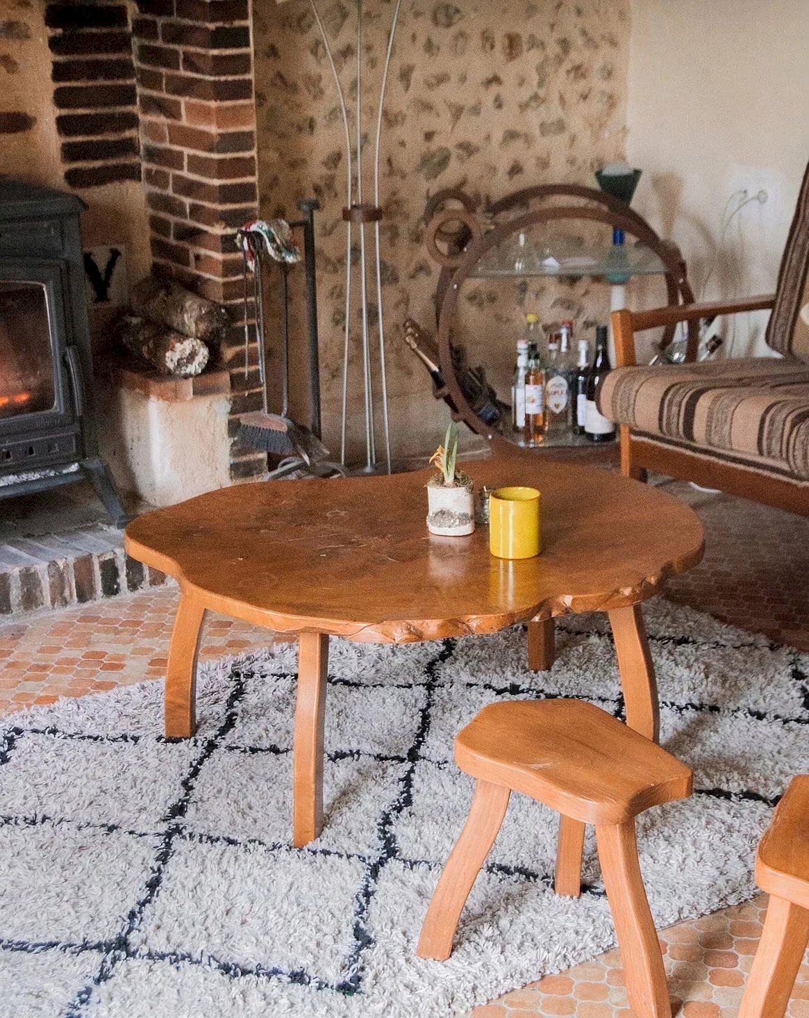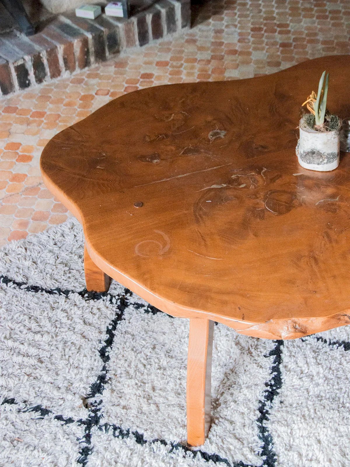 Enhance your living room with this brutalist coffee table made of solid wood, crafted from a burl of elm or maple with shimmering veins. Resting on four curved legs, its silhouette sculpts the space with presence and elegance, offering a generous surface for books, lamps, and decorative objects. Ideal for creating a warm and contemporary atmosphere blending artisanal character and graphic lines, it evokes the sensitive spirit of the second half of the 20th century. Length: 95 cm Width: 90 cm Height: 42 cm Condition: Used: Item has been used. Item shows some signs of superficial wear, fully operational and functioning correctly. It may be a demonstration model or an item returned to the store after a short period of use. Possible imperfections. Brand: Debongout Type: Vintage product Material: Wood Style: Country Custom: Coffee tables