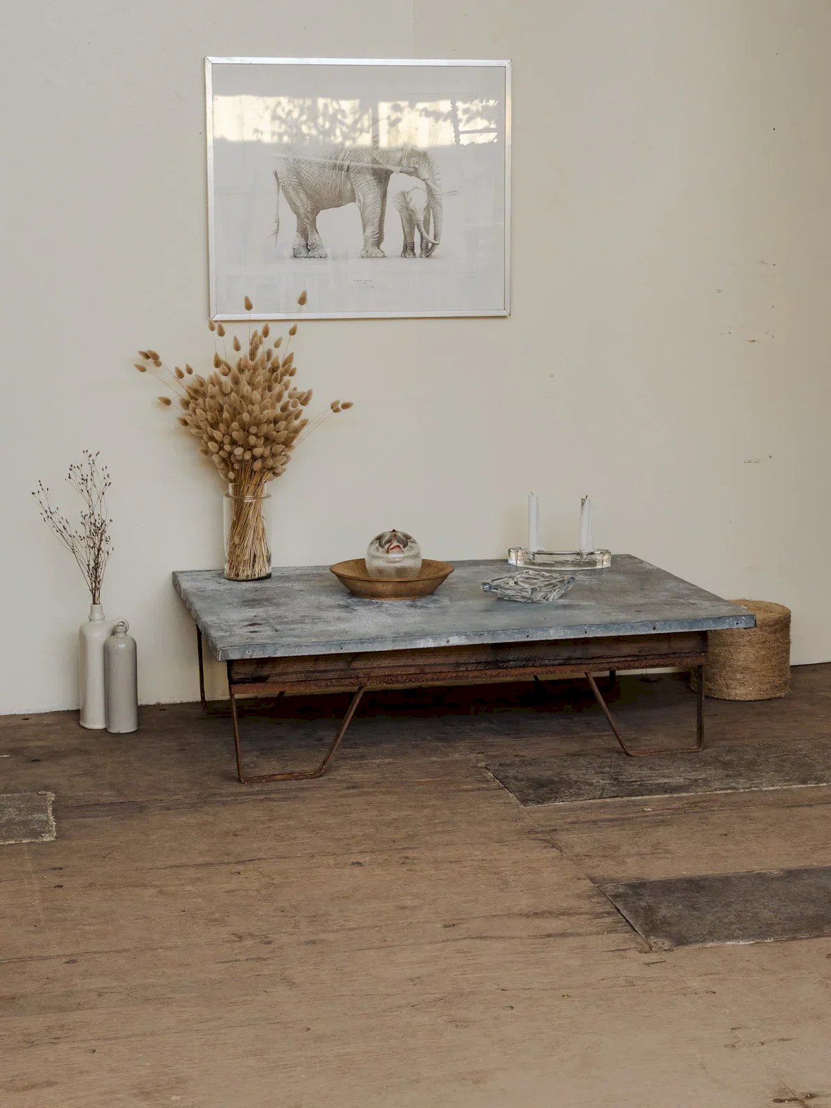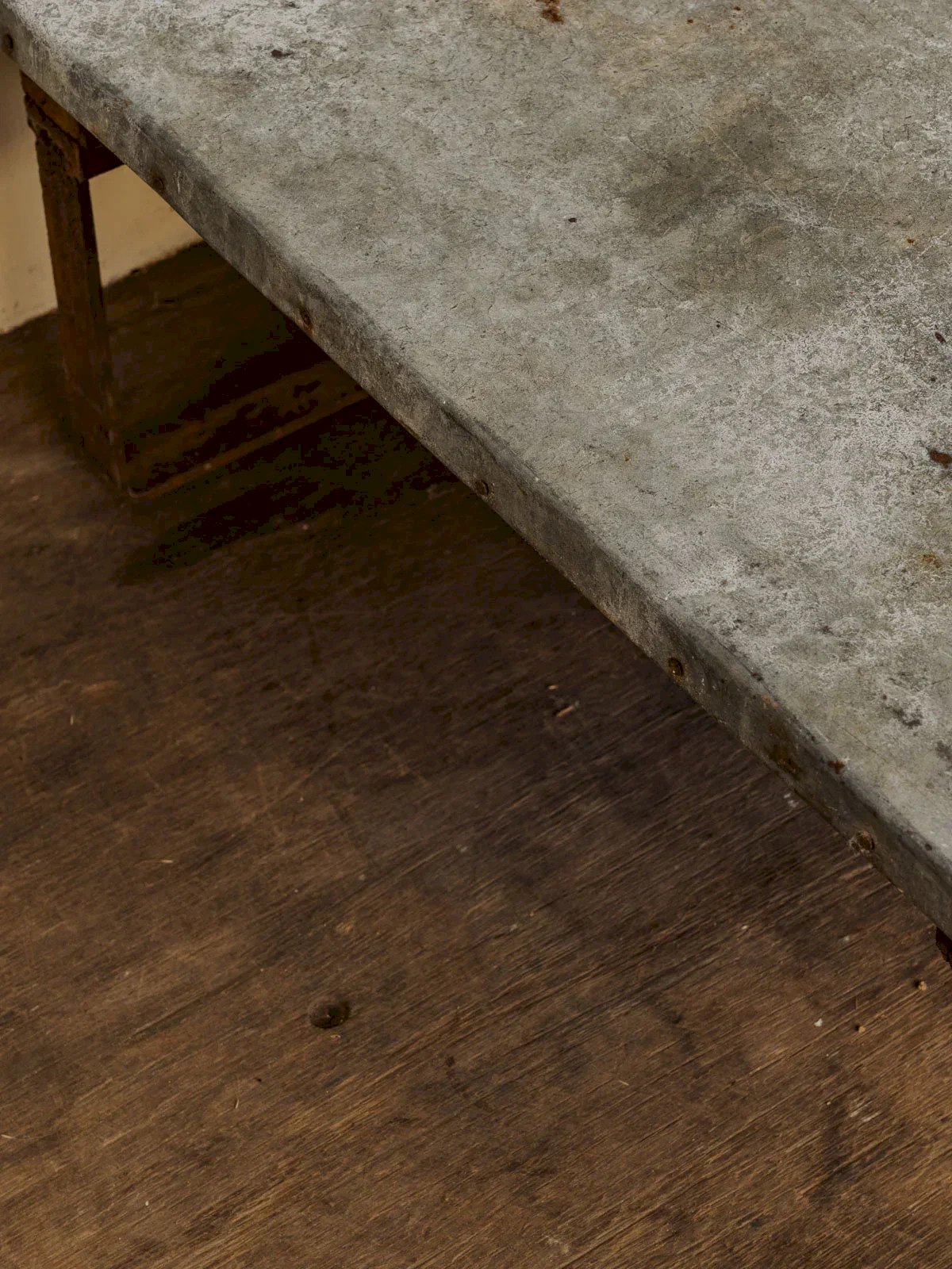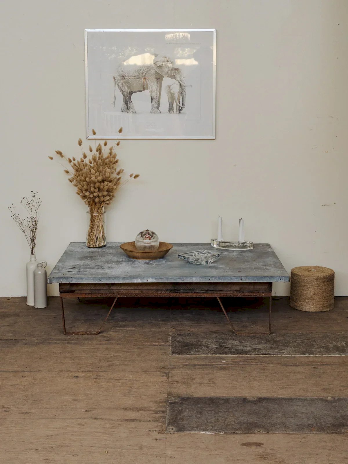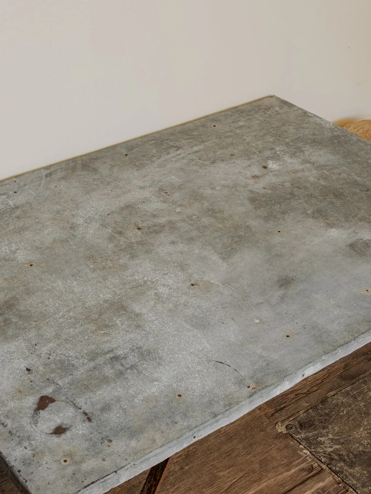 Enhance your stay with this industrial-style coffee table, combining a patinated zinc top with iron and pine legs for a blend of sturdiness and warmth. Its gray and brown hues easily fit into a contemporary or workshop interior, while its wide surface accommodates books, objects, and shared moments. Some signs of use and aging. Length: 111 cm Width: 79 cm Height: 31 cm Condition: Used: An item that has been used. Item showing some superficial wear marks... Used: An item that has been used. Item showing some superficial wear marks, fully operational and functioning correctly. It may be a demonstration model or an item returned to the store after a short period of use. Any possible imperfections. Brand: Debongout Type: Vintage product Material: Zinc, Iron, Pine Style: Country Customized: Coffee tables