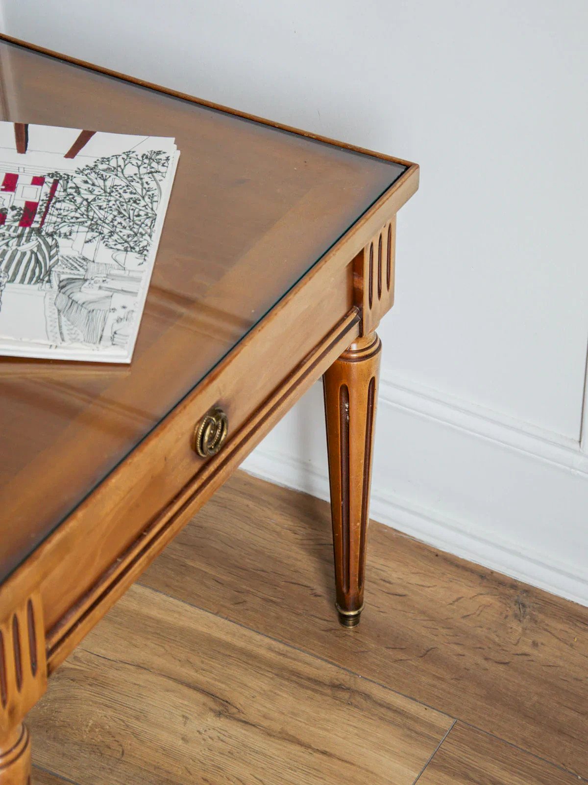 With its glass top and wooden structure, this coffee table strikes a balance between lightness and contrast. Its minimalist design fits easily into a contemporary or more classic living room, and its lower shelf is perfect for sliding in a few books, magazines, or decorative items. Ideal for structuring a relaxation corner while maintaining an airy and elegant atmosphere. Length: 107 cm Height: 44 cm Drawer height: 3.8 cm Depth: 52 cm Extension depth: 27.5 cm Condition: Used: Item has been used. Item shows some superficial signs of wear, ...Used: Item has been used. Item shows some superficial signs of wear, fully operational and functioning correctly. It may be a display model or an item returned to the store after a short period of use. any imperfections. Brand: Debongout Type: Vintage product Material: Wood, Glass Style: Country Customized: Coffee tables