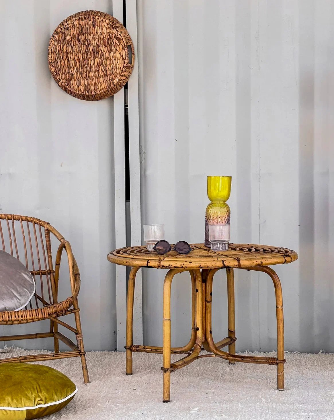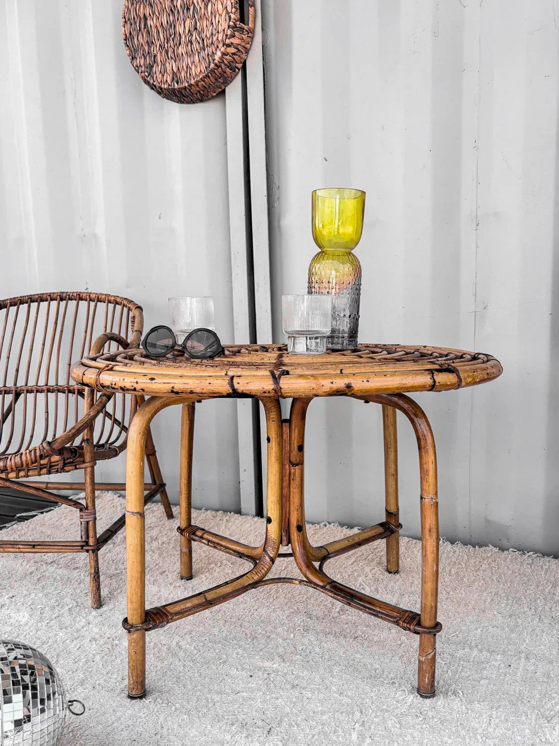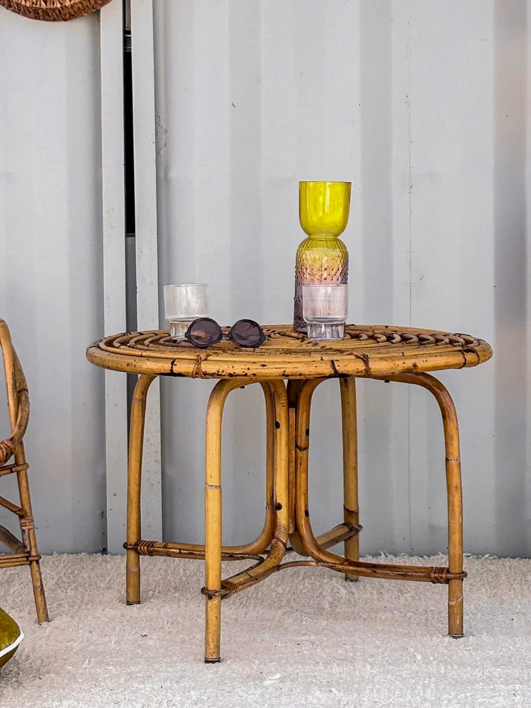 Bring a retro touch to your interior with this round rattan coffee table, perfect for vintage style enthusiasts. Its elegant design and natural rattan construction give it a timeless charm. Ideal for holding your drinks or favorite books, it easily fits into any type of decor. Discover a blend of practicality and aesthetics that will make this table a must-have in your living room. Height: 52 cm Diameter: 74 cm Condition: Used: Item that has been used. Item showing some superficial signs of wear... Used: Item that has been used. Item showing some superficial signs of wear, fully operational and functioning correctly. It may be a display model or an item returned to the store after a short period of use, with possible imperfections. Brand: Debongout Type: Thrifted product Material: Rattan Style: Country Customized: Coffee tables