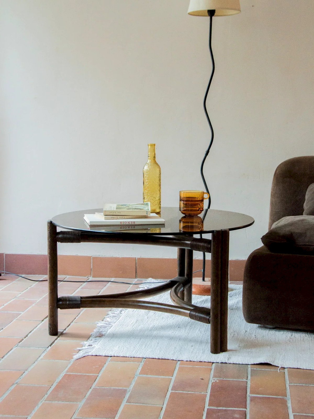 Discover this vintage coffee table with sculptural bent rattan legs and a smoky glass top, perfectly embodying the seventies aesthetic. Its organic design blends lightness and transparency, evoking the iconic creations of the era. Ideal for a vintage or contemporary interior, this decorative and functional piece adds a warm and elegant touch to your living room. The rattan shows a beautiful patina, testament to its history, while the glass top is in excellent condition. A coffee table full of character that will appeal to lovers of unique style. Height: 45 cm Diameter of the top: 81 cm Condition: Used: Item that has been used. Item showing some superficial signs of wear, fully operational and functioning properly. It may be a demonstration model or a returned item after a short period of use. Any imperfections. Brand: Debongout Type: Curated product Material: Rattan, Glass Style: Rustic Customized: Coffee tables