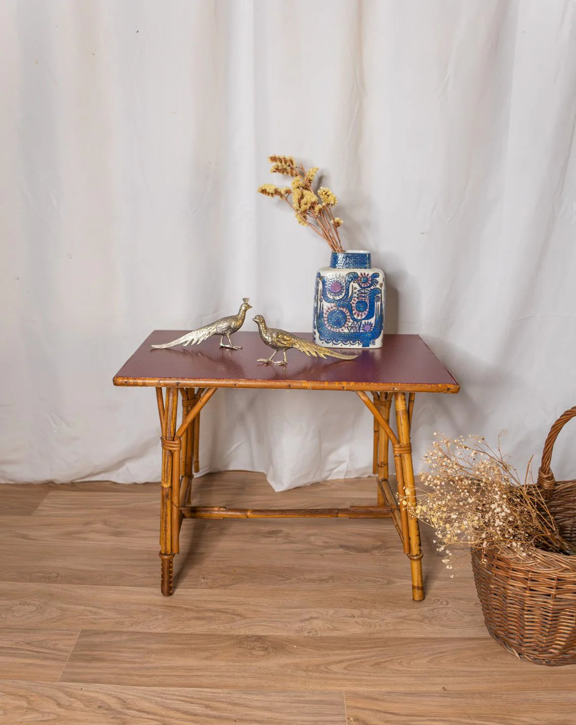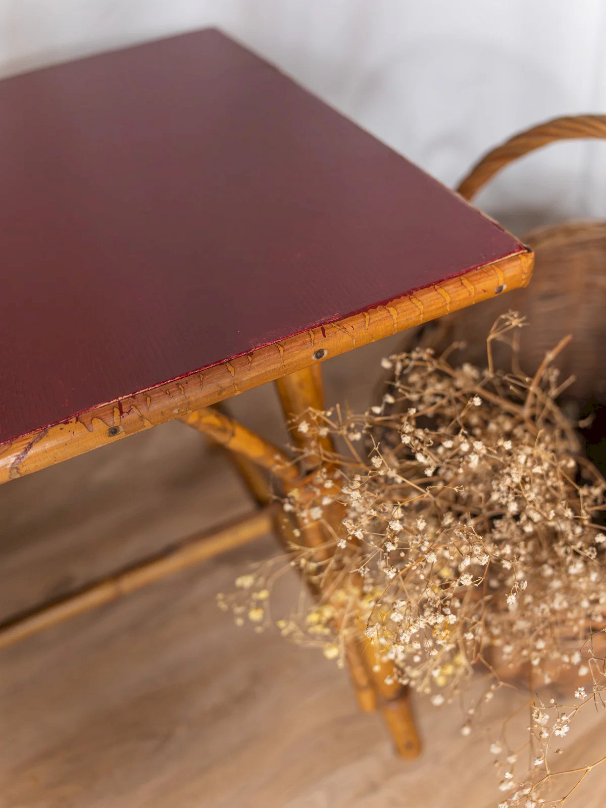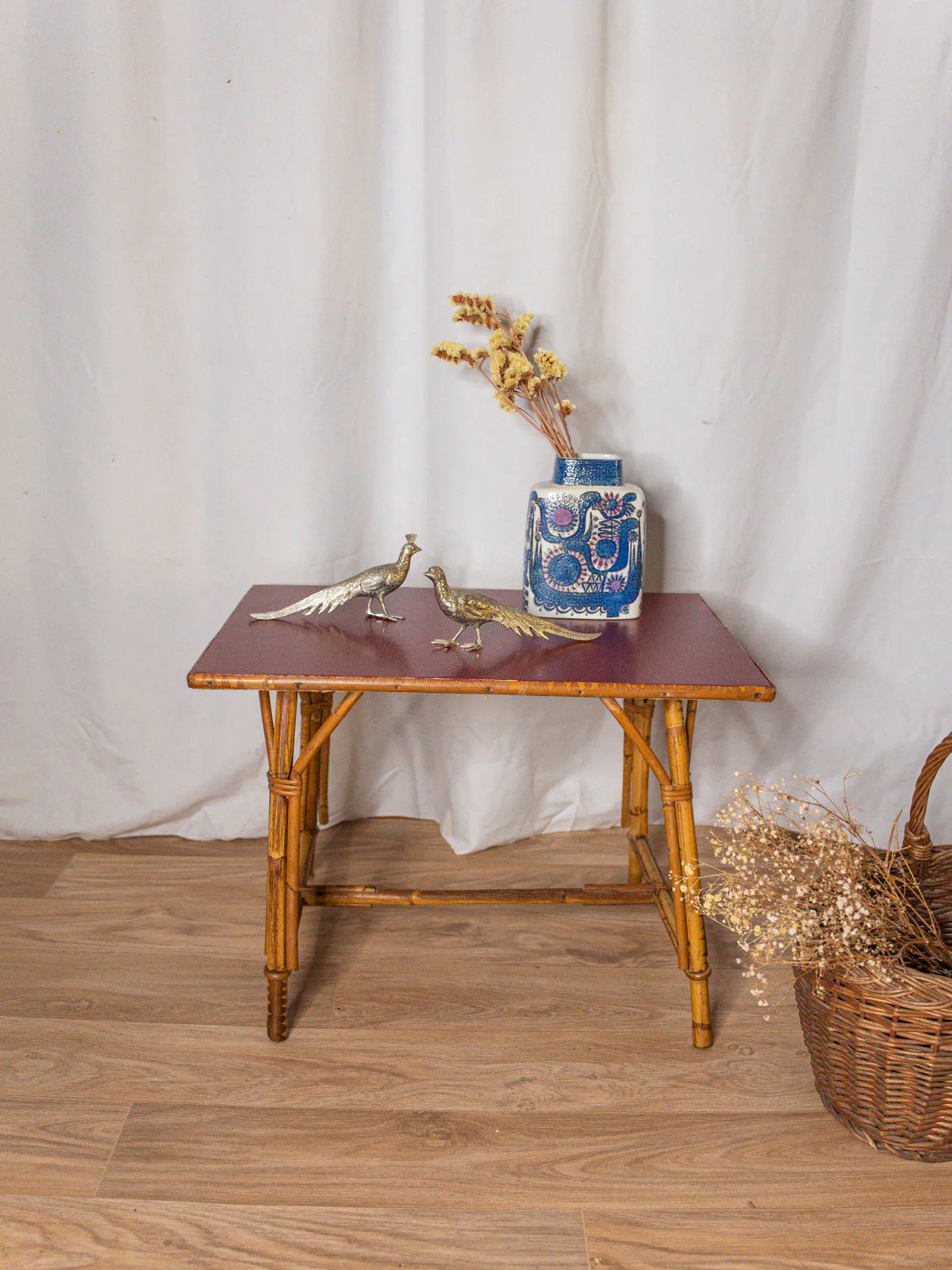 Adopt this rattan coffee table, enhanced by a raspberry red painted top that adds a colorful touch to the whole piece. Its airy proportions make it a functional piece for a cozy living room or balcony, accommodating cups, books, and plants without weighing down the space. The natural weaving adds texture and warmth, while the modern color creates a bohemian-chic, elegant, and friendly atmosphere. Signs of wear are present. Length: 61 cm Width: 41 cm Height: 44.5 cm Height under the top: 40 cm Condition: Used: Item that has been used. Item shows some superficial signs of wear, fully operational and functioning correctly. It may be a display model or an item returned to the store after a short period of use. any potential imperfections. Brand: Debongout Type: Vintage product Material: Rattan, Wood Style: Country Custom: Coffee tables