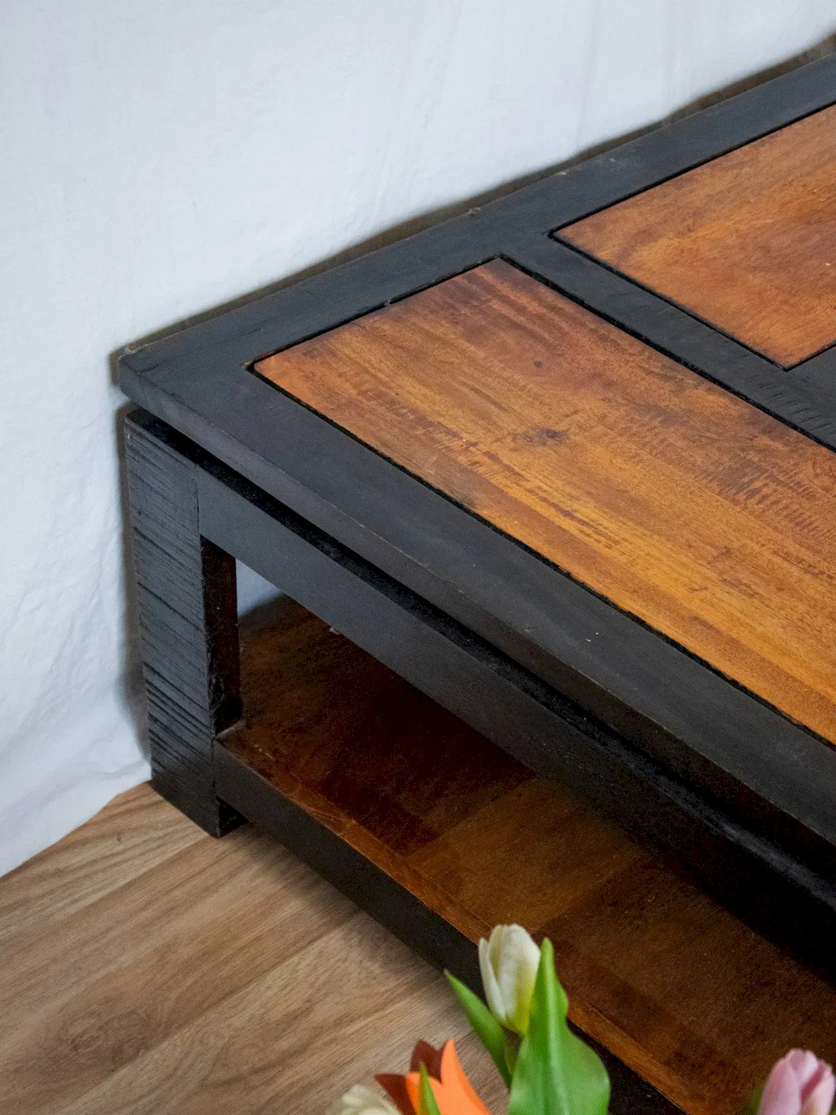 Elevate your living room with this large square wooden coffee table, featuring a camel top resting on a dark wood structure for a warm and graphic contrast. Its low top and lower shelf provide ample space for cups, books, and decorative items while maintaining a low and welcoming silhouette. The combination of shades and wood types evokes a contemporary and friendly atmosphere, perfect for a minimalist or chic bohemian interior. Length: 110 cm Width: 110 cm Height: 41 cm Niche height: 19.5 cm Condition: Used: An item that has been used. Item showing some superficial wear marks, fully operational and functioning correctly. It may be a demonstration model or a returned item after a short period of use. Any imperfections may apply. Brand: Debongout Type: Thrifted product Material: Wood Style: Country Custom: Coffee tables
