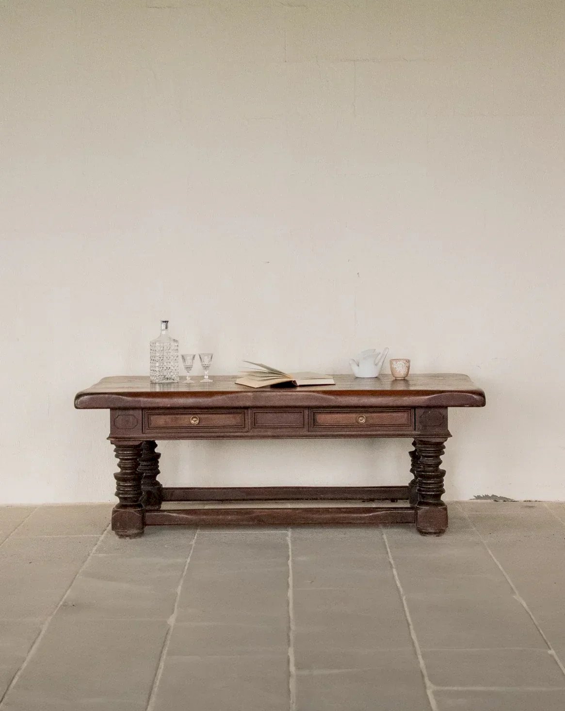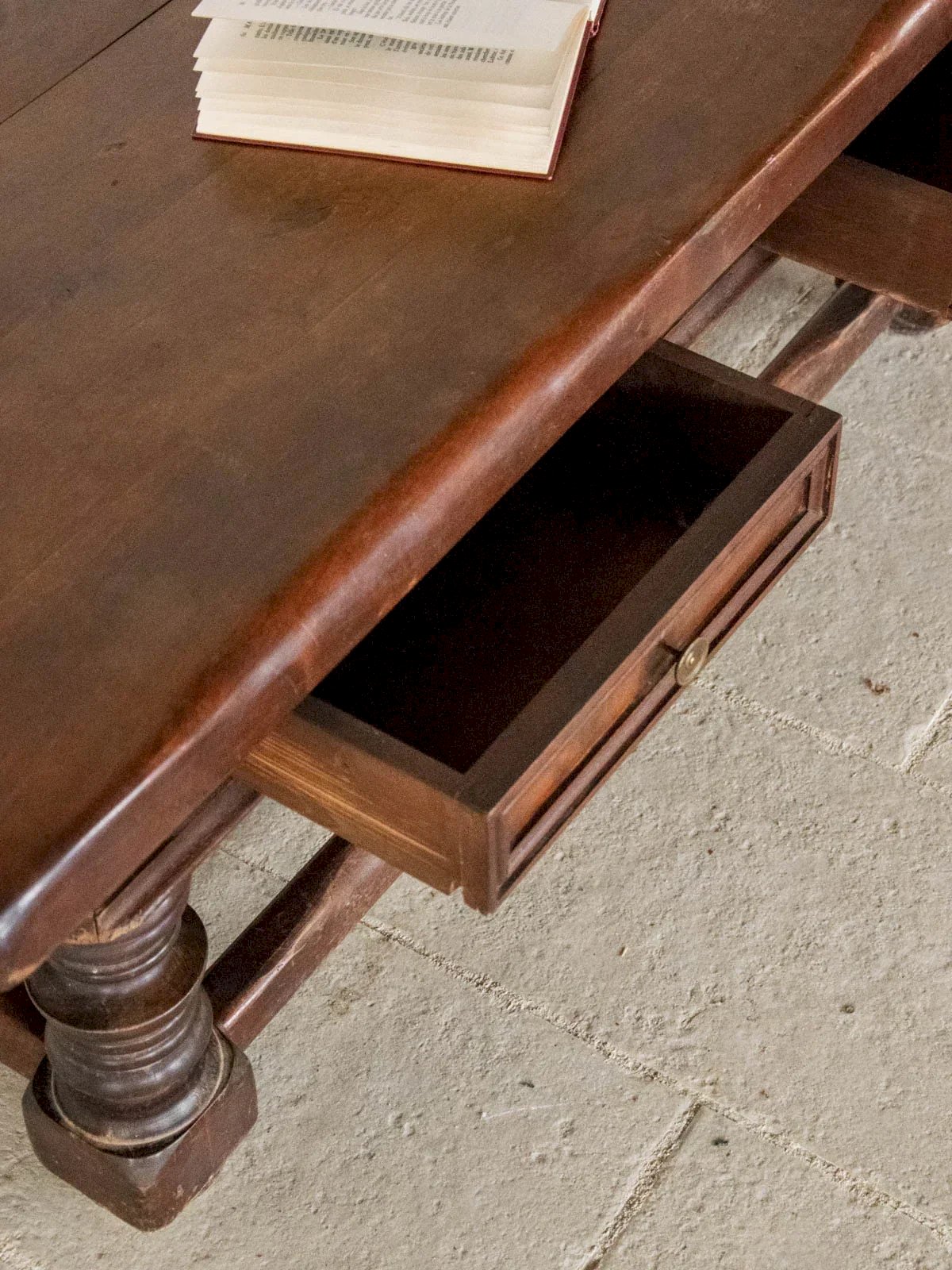Enhance your interior with this country-style coffee table made of solid oak, stained with a dark patina that highlights the richness of the wood and the sculpted sides. Its two drawers with brass knobs offer discreet storage for remote controls and magazines, while the turned legs lend an authentic silhouette with generous proportions. Perfect for creating a warm and friendly atmosphere, it fits well in both a rustic living room and a contemporary interior, bringing character and elegance. Length: 130 cm Width: 65 cm Height: 48 cm Drawer height: 6.5 cm Condition: Used: Item that has been used. Item showing some superficial signs of wear, fully operational and functioning correctly. It may be a demonstration model or a product returned to the store after a short period of use, with possible imperfections. Brand: Debongout Type: Vintage product Material: Wood, Brass Style: Country Custom: Coffee tables