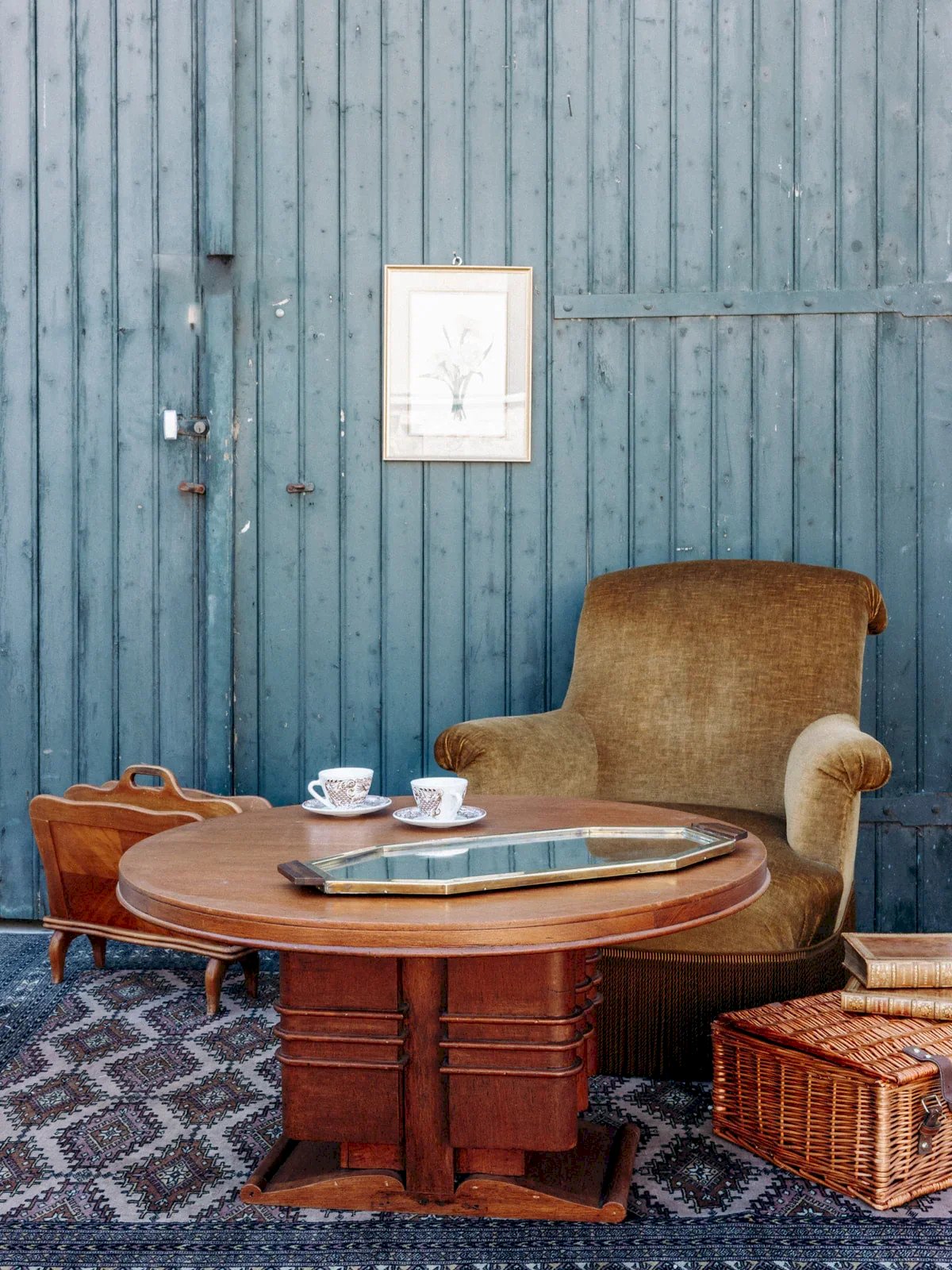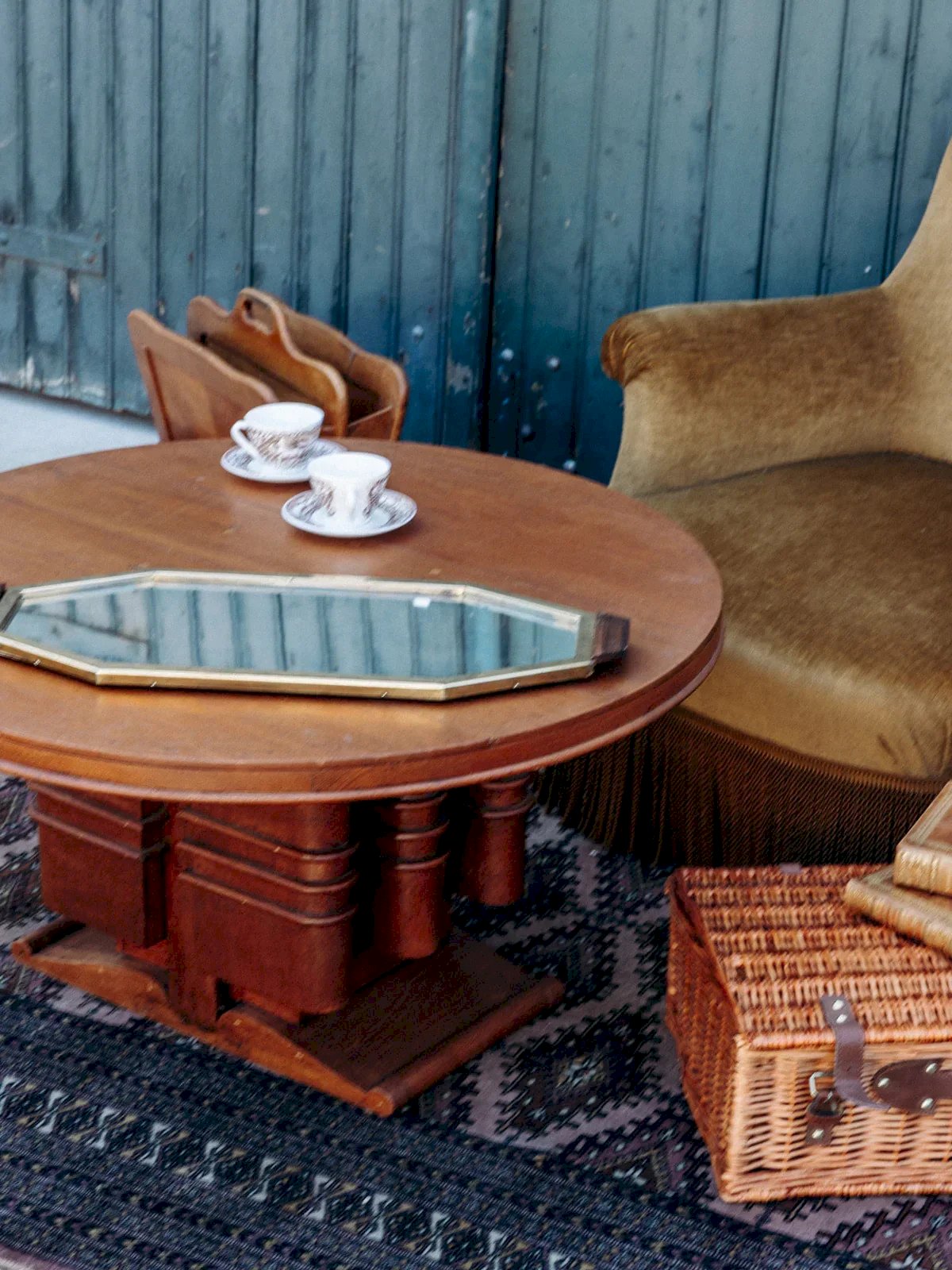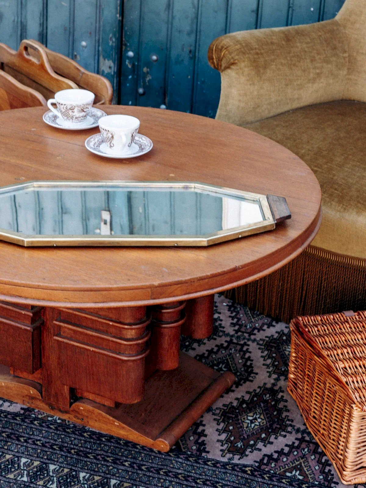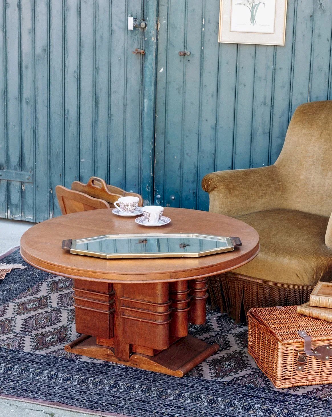 Enhance your living room with this round wooden coffee table featuring an original base, combining a soft silhouette with artisanal character. Its warm top invites you to place cups and books, while its balanced proportions fit well in both small living rooms and more spacious areas. The base adds a graphic and unique touch, creating a friendly and elegant atmosphere. Some signs of wear are present. Height: 45 cm Diameter: 85 cm Condition: Used: An item that has been used. Item showing some signs of superficial wear... Used: An item that has been used. Item showing some signs of superficial wear, fully operational and functioning correctly. It may be a demonstration model or a product returned to the store after a short period of use. the possible imperfections. Brand: Debongout Type: Vintage product Material: Wood Style: Country Customized: Coffee tables