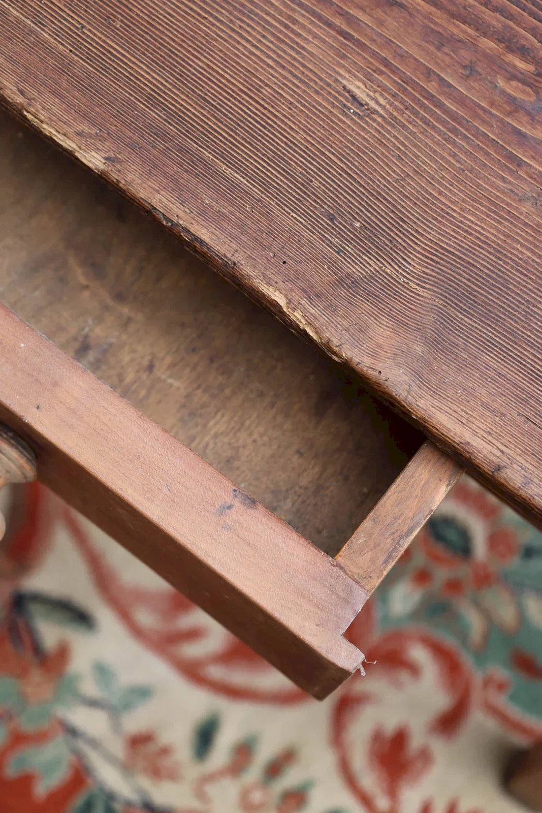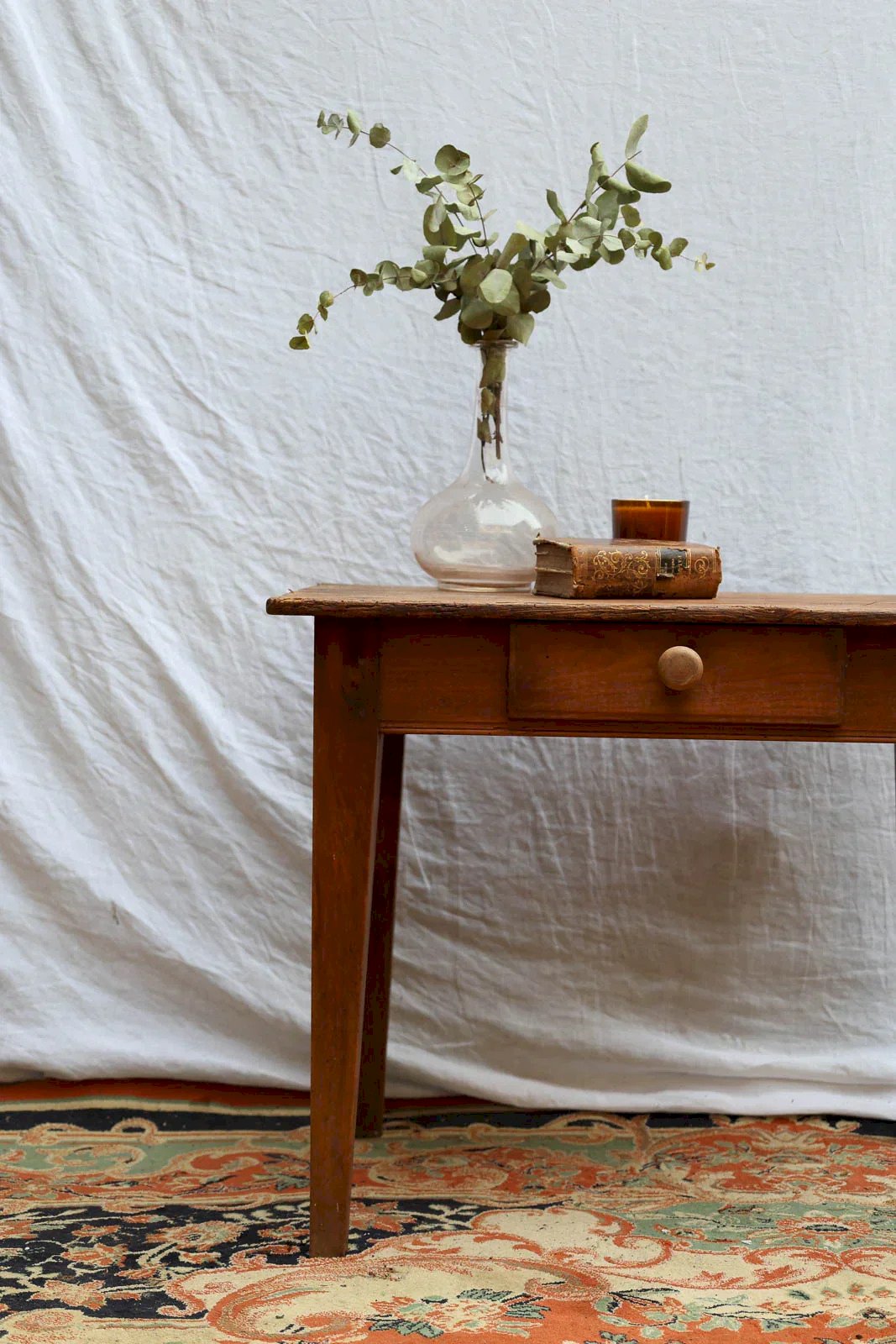 Add a warm and understated touch to your living room with this small dark wood farmhouse coffee table, featuring a discreet drawer adorned with a round handle that makes it easy to store small items. Its proportions make it ideal for a cozy corner or an entryway, while the deep wood tone and the fine lines fit both contemporary and vintage interiors. Some signs of wear add to its authenticity, including slightly worn wood at the bottom of one leg. Length: 68 cm Width: 55 cm Height: 57 cm Drawer height: 8 cm Drawer length: 27 cm Condition: Used: Item that has been used. Item showing some superficial signs of wear...Used: Item that has been used. Item showing some superficial signs of wear, fully operational and functioning correctly. It may be a display model or a returned item to the store after a short period of use. any possible imperfections. Brand: Debongout Type: Thrifted product Material: Wood Style: Country Customized: Coffee tables