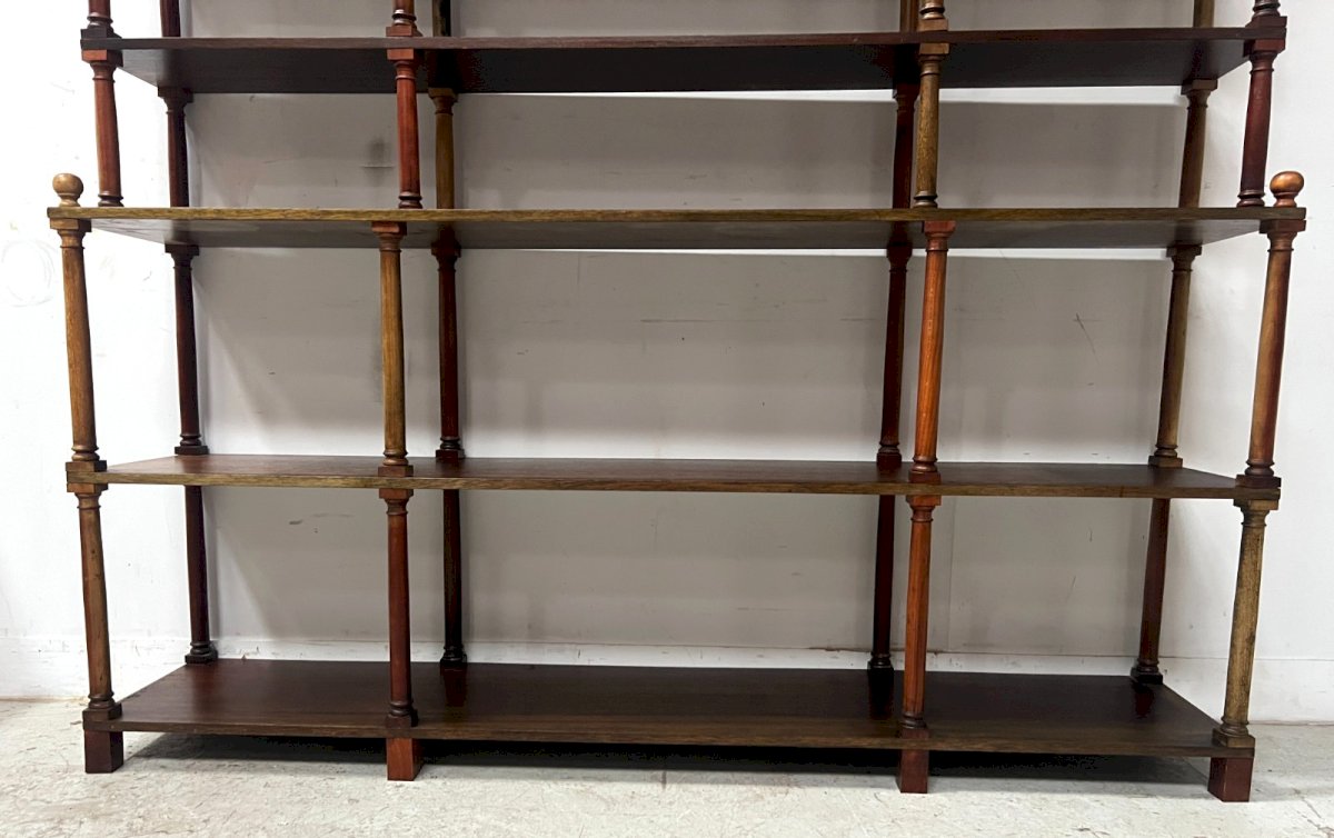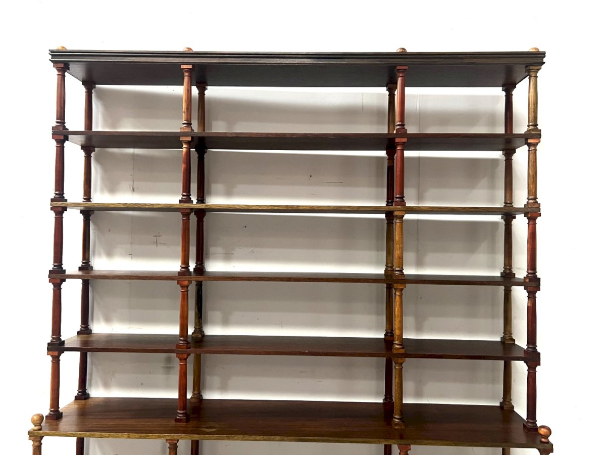 Open library with central riser Seven shelves supported by turned wooden columns Fully dismantable library Some color nuances see photos Good condition Dimensions H 227 x W 180 x 35 cm XX century Type: Showcase Origin: France Country of origin: France Subtype: High Style: classical Material: natural wood