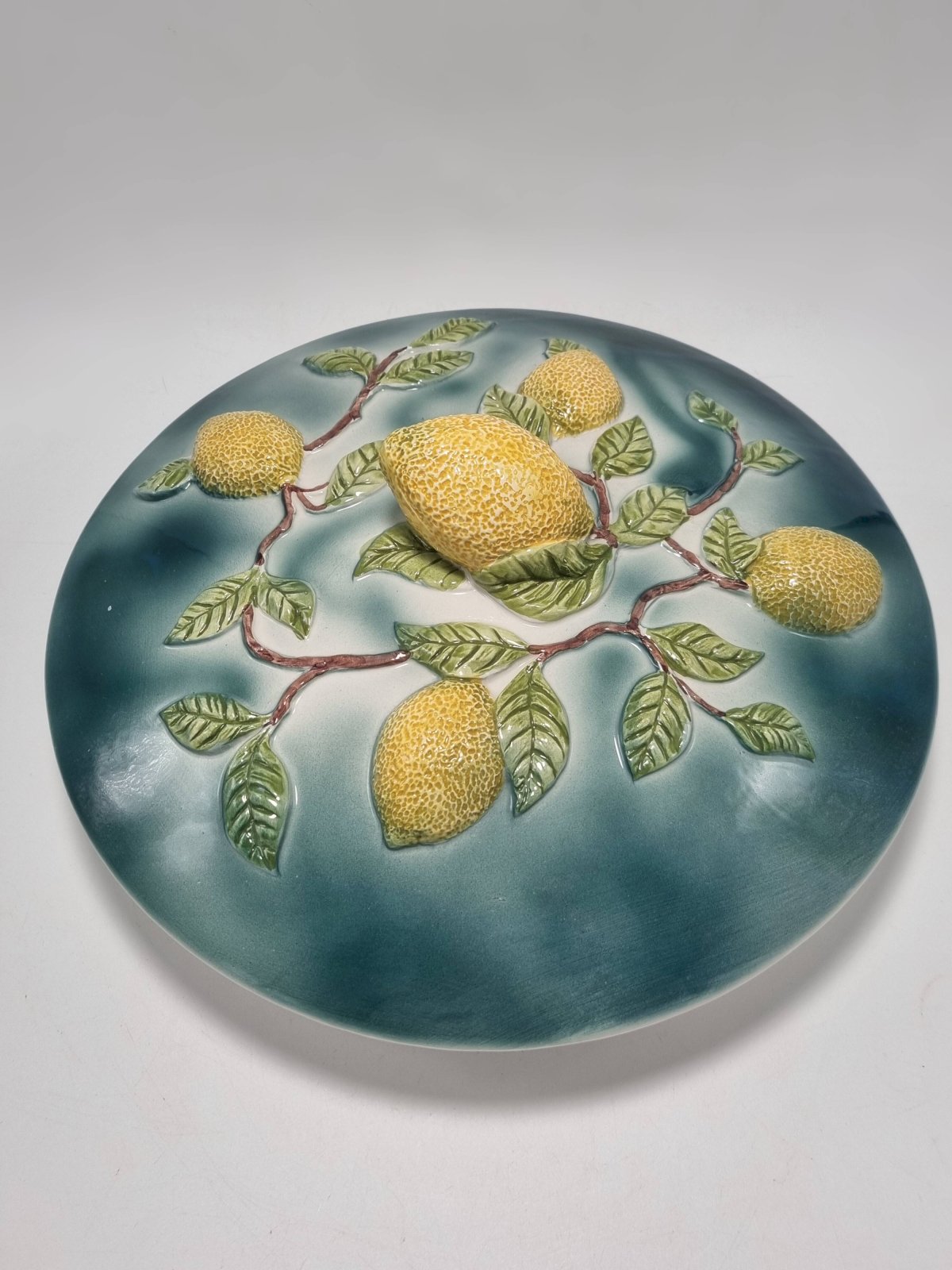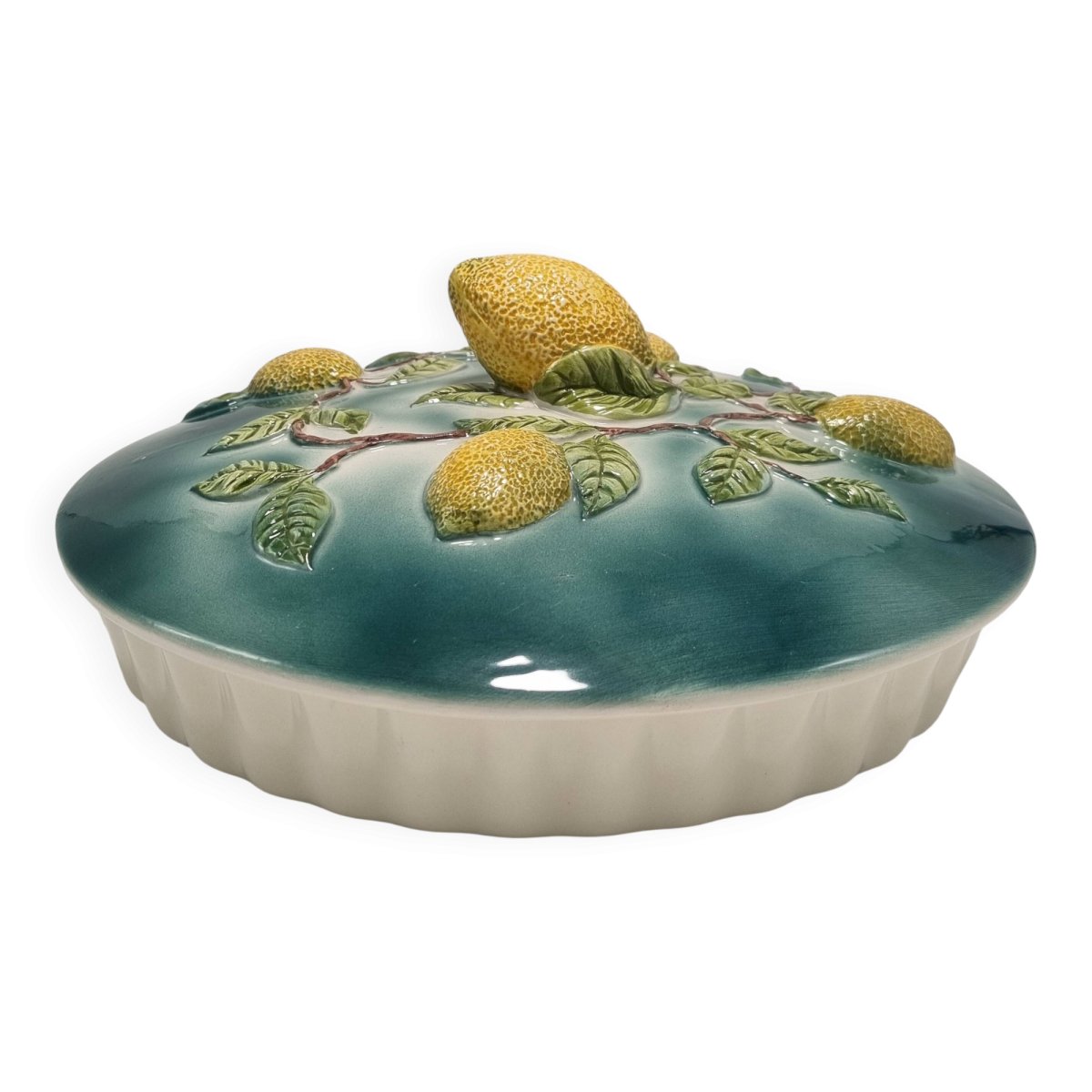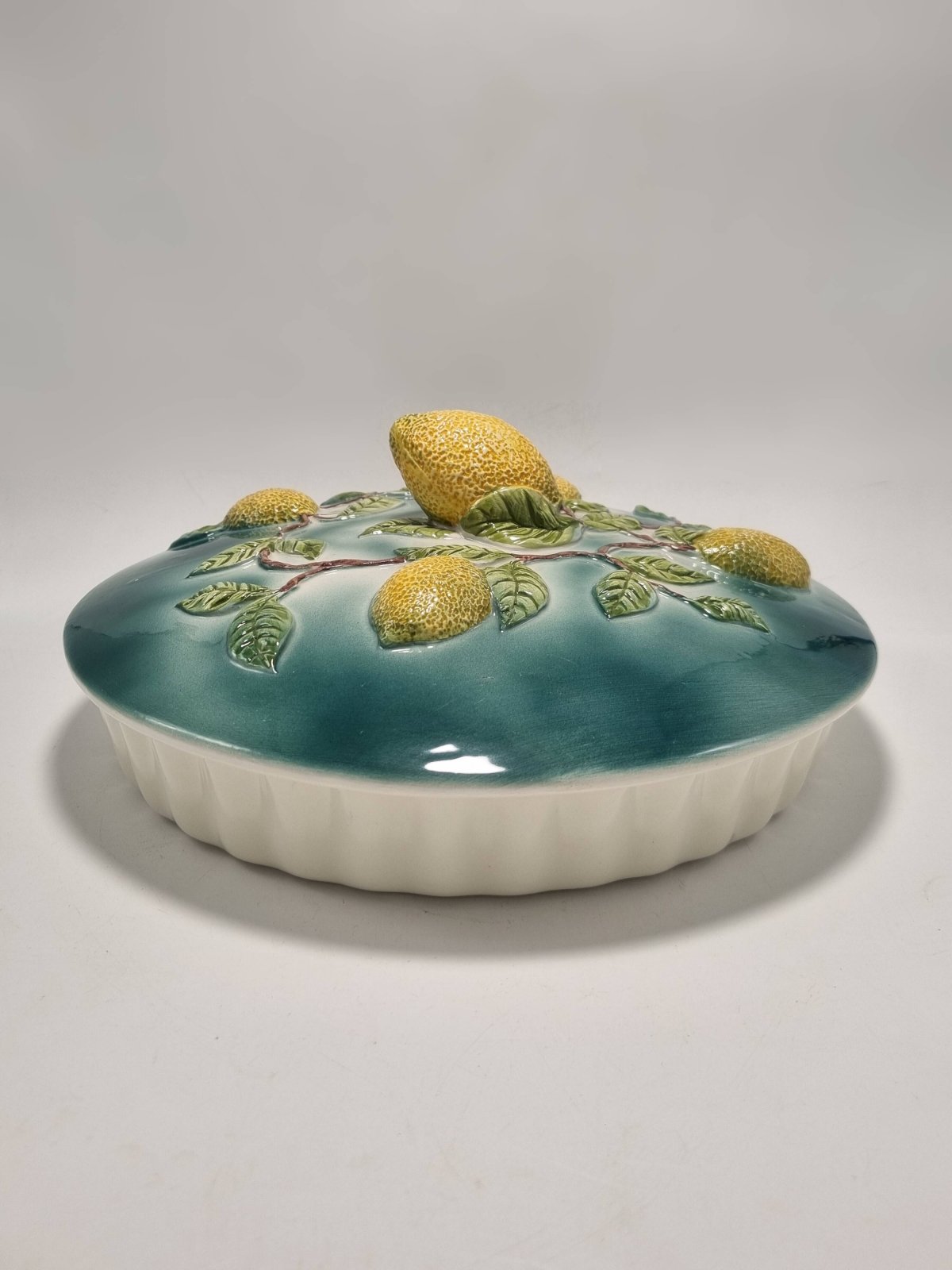 Lidded pie dish in barbotine style, signed GV. Decorated with yellow lemons on a blue background. This dish is in very good condition. Dimensions: 29 x 12 cm Weight: 2.3 kg L: 29 W: 29 H: 12