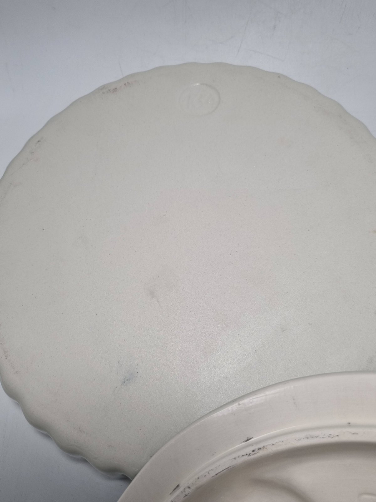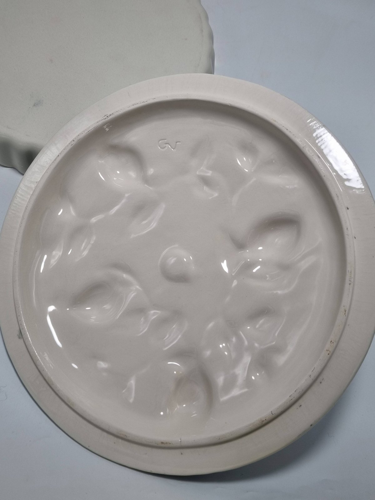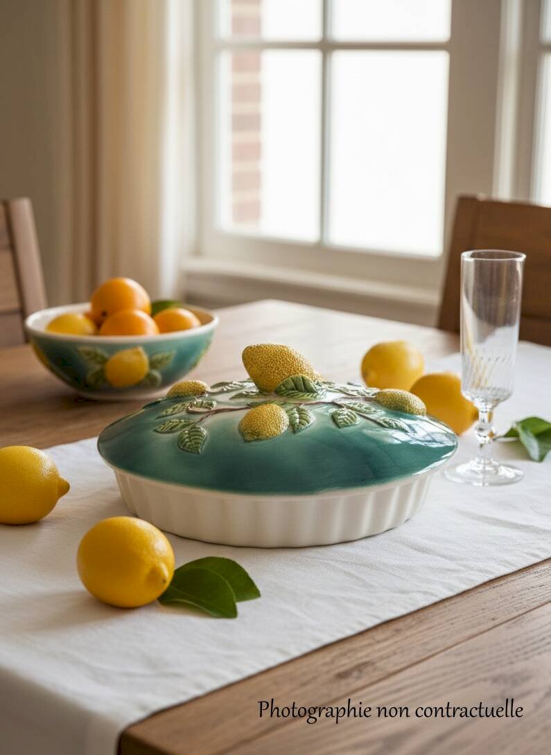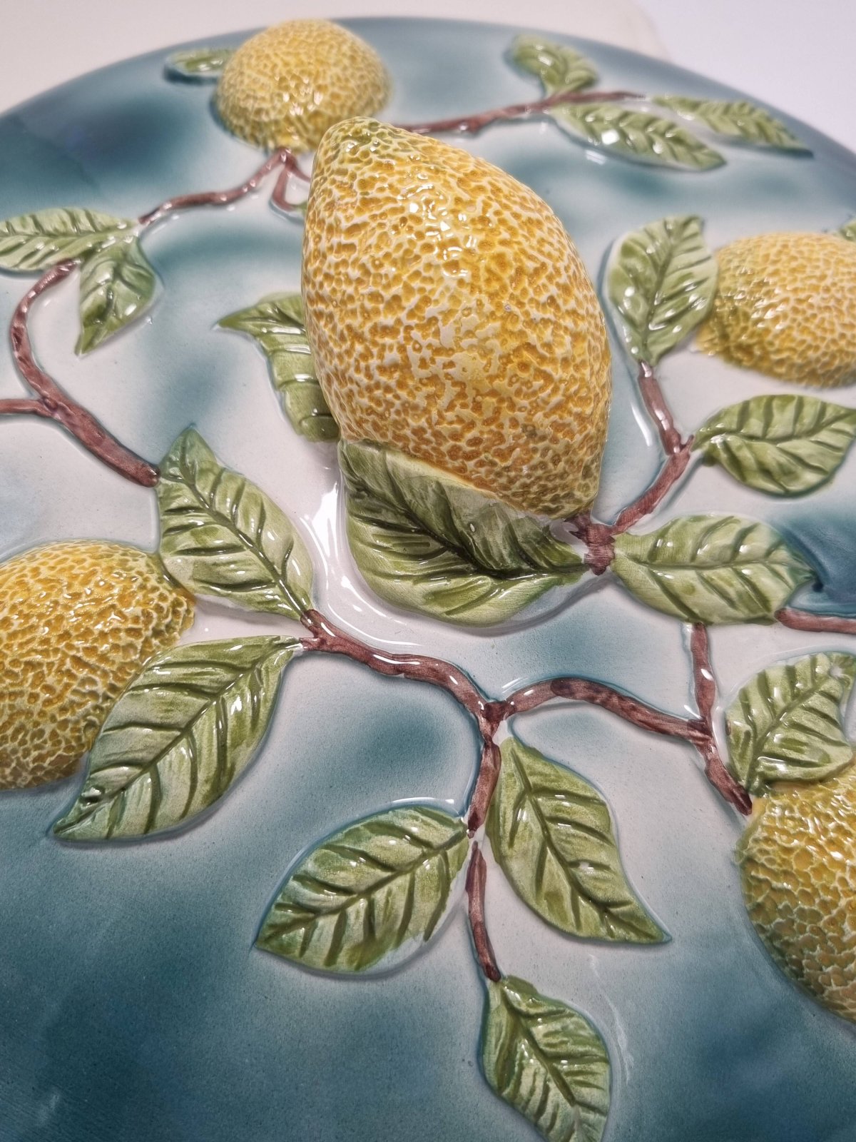 Lidded pie dish in barbotine style, signed GV. Decorated with yellow lemons on a blue background. This dish is in very good condition. Dimensions: 29 x 12 cm Weight: 2.3 kg L: 29 W: 29 H: 12