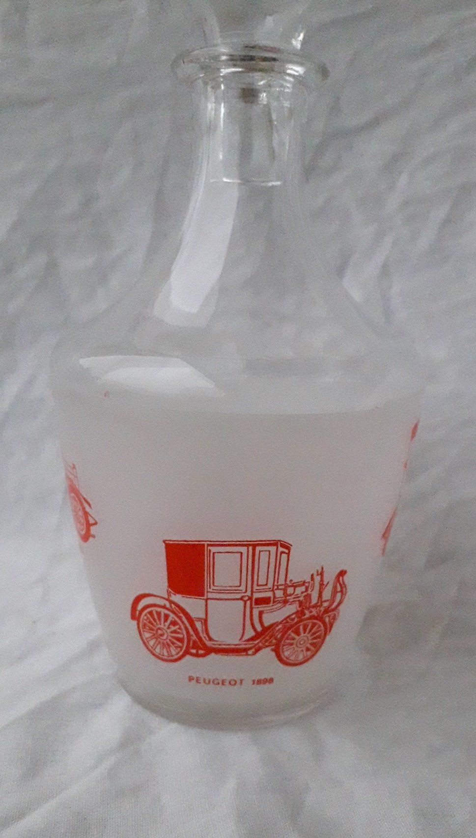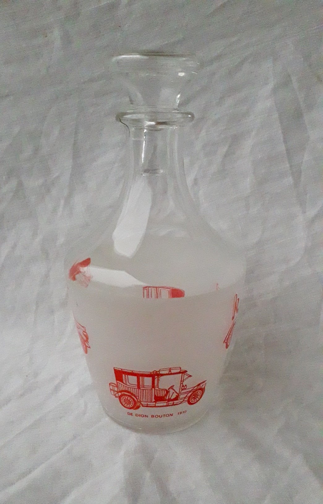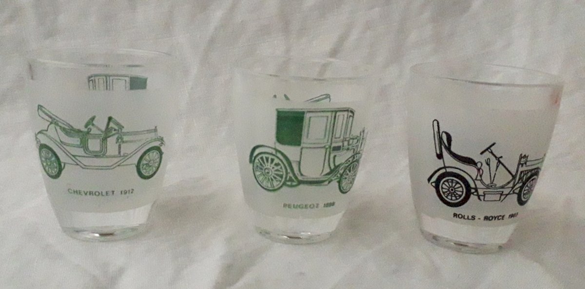 Glass liqueur set including a decanter and 6 glasses, decorated with vintage cars, made in France. Overall in good condition, with slight signs of use, no breakage or chips. Dimensions: height of decanter 18 cm, maximum diameter 9 cm. Total weight 0.650 kg. Please feel free to contact us for any additional information and/or to make your offers. See my other items for sale.