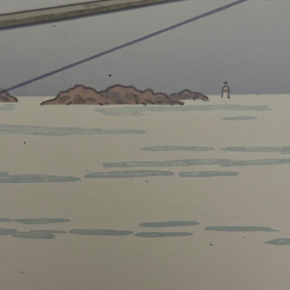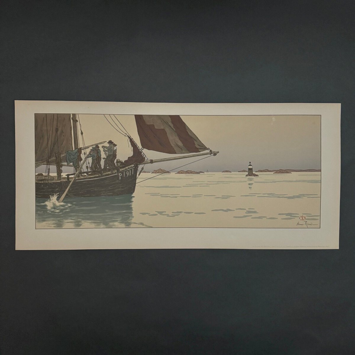 Lithograph by Henri Rivière The Fairy Tale of the Hours - The Flat Calm A5343 This lithograph "The Fairy Tale of the Hours - The Flat Calm" is signed Henri Rivière and has a red stamp seal at the bottom right. The work is authentic and old. In terms of condition, there is a slight crease in the bottom right margin and some light marks. On the lithograph, there is a small tear in the sky on the right and some minor spots. The lithograph is very fresh in color; once framed, most of the defects will be less visible. We have taken a maximum of photos of the defects so you can assess the condition. Sold as presented. Henri Rivière (1864-1951) is a French painter, engraver, and illustrator. He began his career with drawing, then moved to printmaking in soft-ground and specifically etching in 1882. At the same time, he embarked on a career as a director and set designer, in 1886, for the shadow theater at the Chat Noir cabaret, enhancing performances by creating innovative colored sets. He later devoted himself exclusively to painting and engraving, establishing a significant place in the history of etching, printmaking, wood engraving, lithography, and watercolor (he painted around a thousand watercolors). Our numerous photos allow you to appreciate the quality of this lithograph. For the condition, please examine the photos closely. Feel free to zoom in. The photos are an integral part of the description. Dimensions: Height: 31 cm Width: 68.1 cm Artwork Height: 24 cm Width: 60 cm I remain at your disposal for any questions. Authenticity: Unknown Type: Lithograph Support: On paper Height: 31 cm Characteristics: Signed Theme: Marine landscape, Boat Width: 68.1 cm