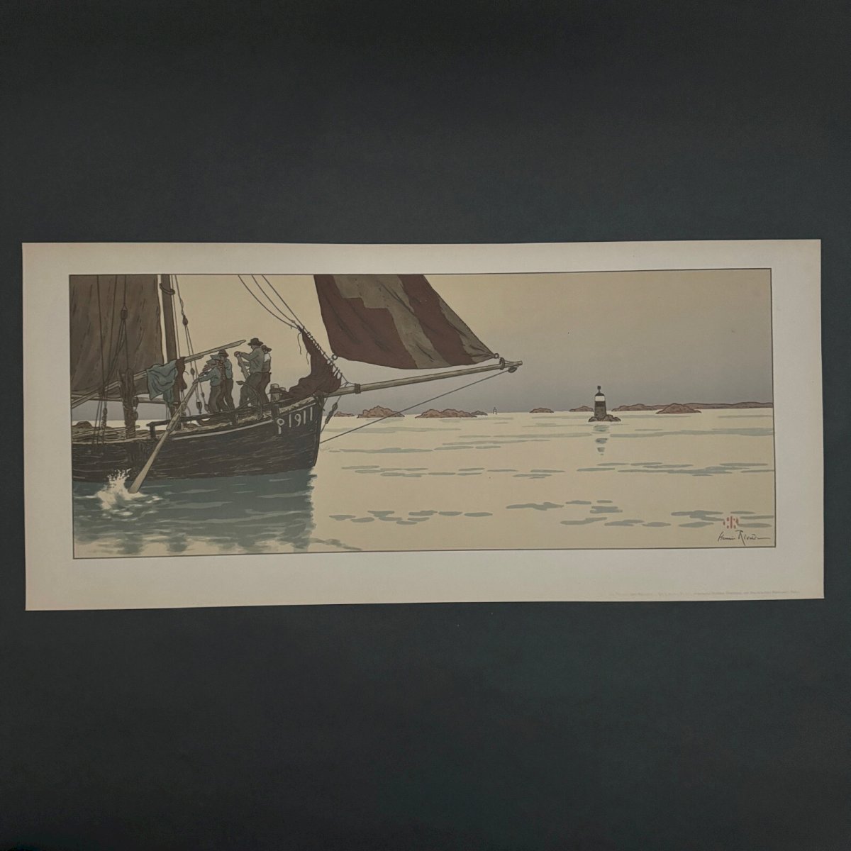 Lithograph by Henri Rivière The Enchantment of the Hours - The Calm A5344 This lithograph "The Enchantment of the Hours - The Calm" is signed by Henri Rivière and bears a red stamp in the lower right corner. The work is authentic and antique. Regarding its condition, there are small spots in the margin and a slight crease in the lower right. The lithograph is very fresh in color; once framed, most of the defects will be less visible. We have taken as many photos as possible of the defects so that you can assess the condition. Sold as presented. Henri Rivière (1864-1951) is a French painter, engraver, and illustrator. He began his career with drawing, then moved on to soft-ground engraving and specifically etching in 1882. At the same time, he started a career as a director and set designer in 1886, for the shadow theater at the Chat Noir cabaret, enhancing performances with the creation of very innovative colored sets. He then devoted himself exclusively to painting and engraving, solidifying his place in the history of etching, printmaking, wood engraving, lithography, and watercolor (he painted approximately one thousand watercolors). Our numerous photos allow you to appreciate the quality of the lithograph. Regarding its condition, please examine the detailed photos. Don't hesitate to zoom in. The photos are an integral part of the description. Dimensions: Height: 31 cm Width: 68.1 cm Work Height: 24 cm Width: 60 cm I remain at your disposal for any questions. Authenticity: Unknown Type: Lithograph Support: On paper Height: 31 cm Features: Signed Theme: Marine Landscape, Boat Width: 68.1 cm Country of origin: Metropolitan France