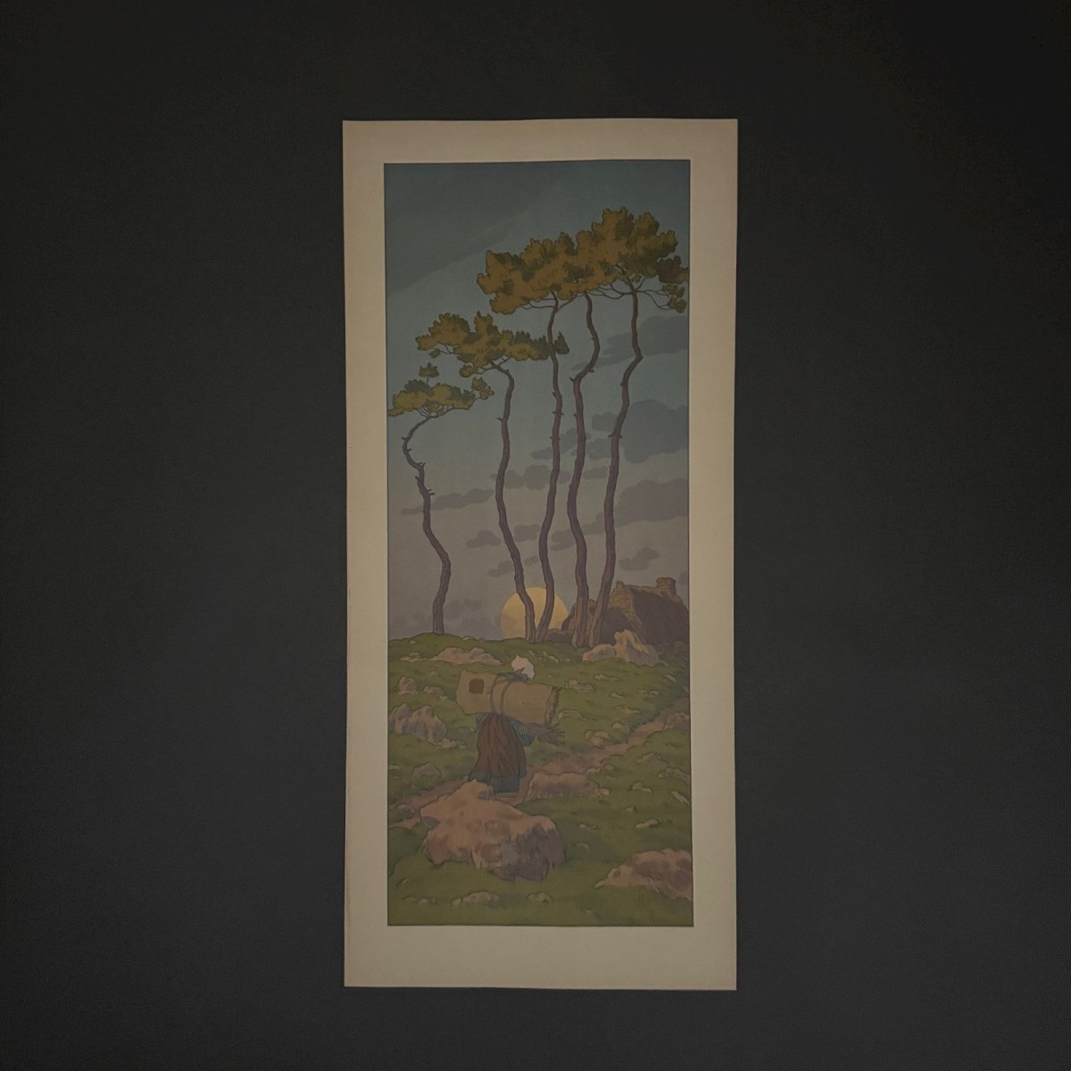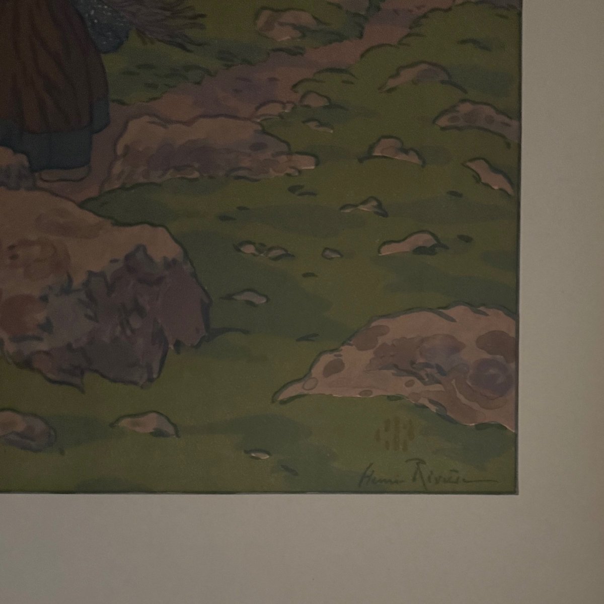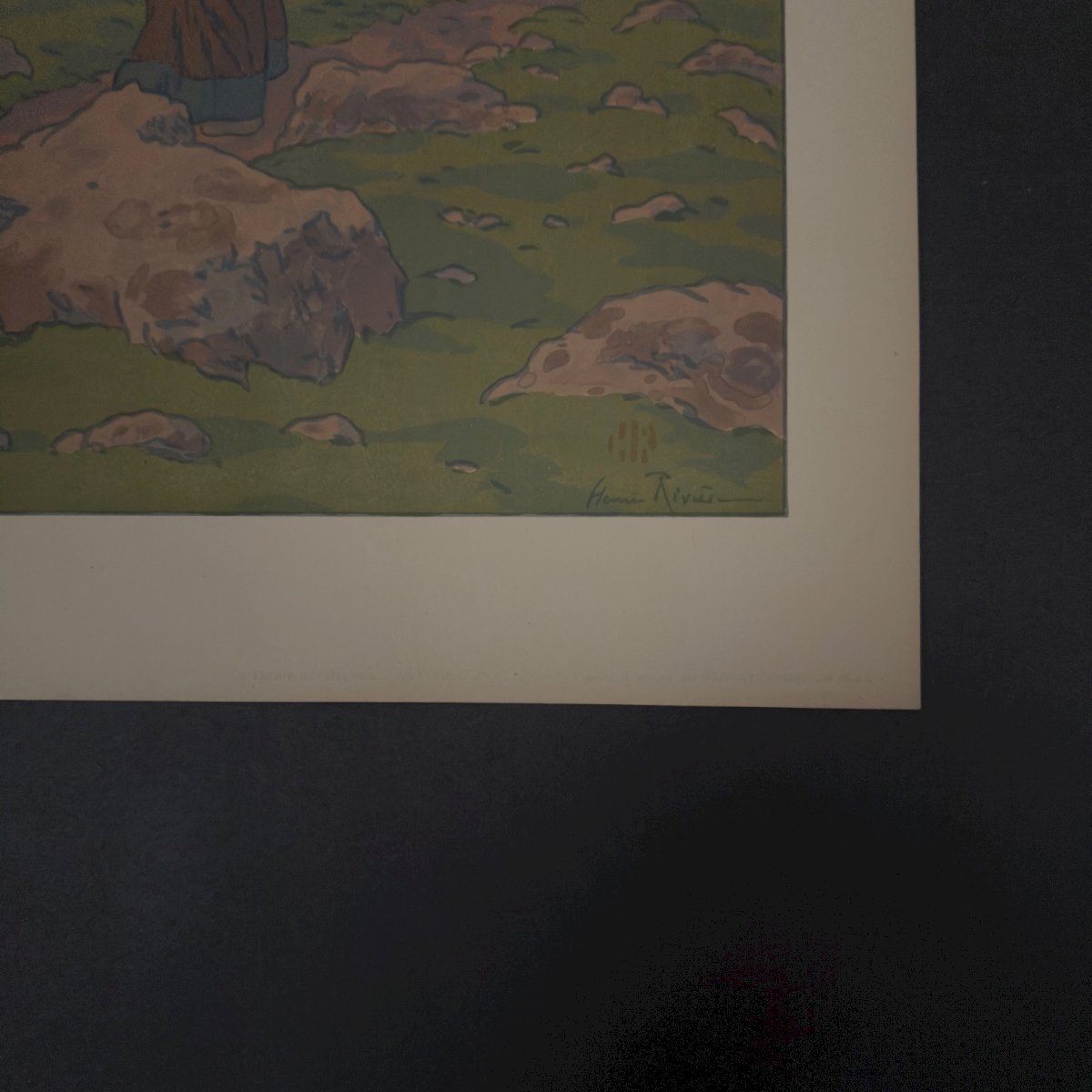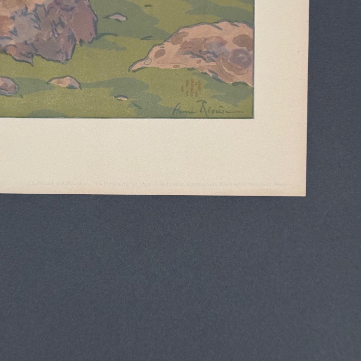 Lithograph by Henri Rivière The Fairytale of the Hours - The Full Moon A5819 This lithograph “The Fairytale of the Hours - The Full Moon” is signed by Henri Rivière and has a red stamp in the lower right corner. We note small ink marks in the margin. The colors are perfect, and once framed, these defects will be barely noticeable. We have taken a maximum of photos so you can assess the condition. Sold as presented. Henri Rivière (1864-1951) was a French painter, engraver, and illustrator. He began his career with drawing, then with soft-ground etching, specifically aquatint, in 1882. He also started a career as a director and stage designer in 1886, at the shadow theater of the Chat Noir cabaret, enhancing the performances by creating very innovative color sets. He then dedicated himself exclusively to painting and engraving, establishing himself in the history of etching, printmaking, wood engraving, lithography, and watercolor (he painted around a thousand watercolors). Our numerous photos allow you to appreciate the quality of this lithograph. For the condition, please refer to the detailed photos. Do not hesitate to zoom in. The photos are an integral part of the description. Dimensions: Height: 68 cm Width: 30.7 cm Artwork Height: 59.9 cm Width: 24 cm I remain at your disposal for any questions. Authenticity: Unknown Type: Lithograph Support: On paper Country of origin: Metropolitan France Height: 68 cm Features: Signed Theme: Landscape Width: 30.7 cm
