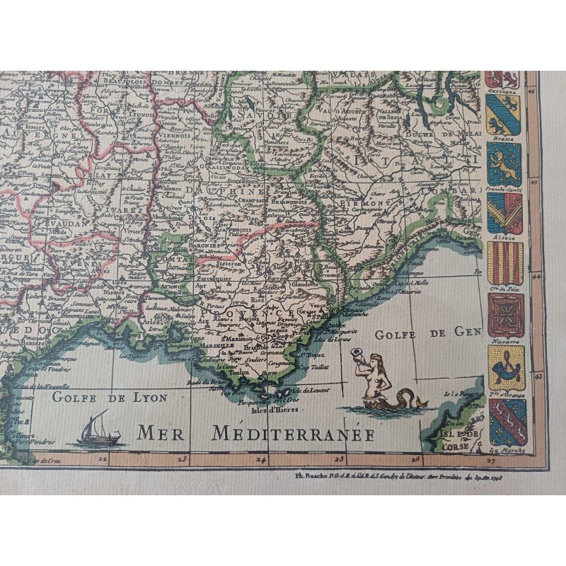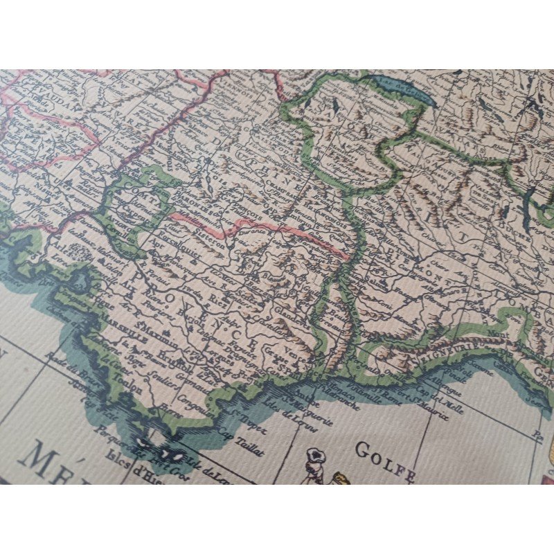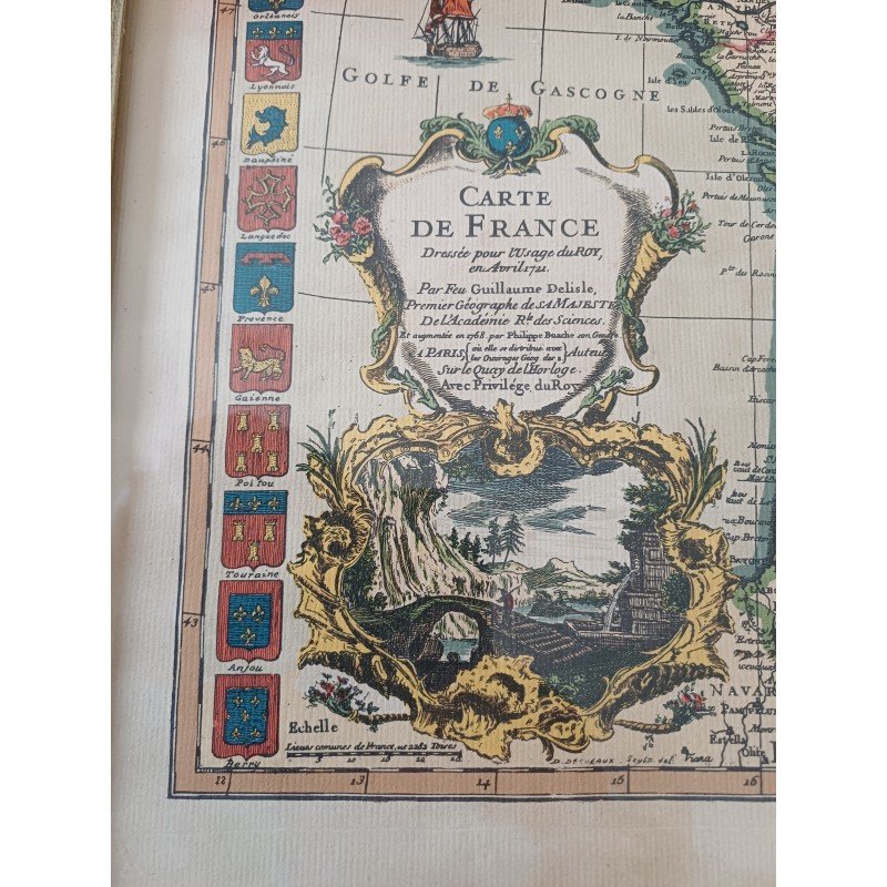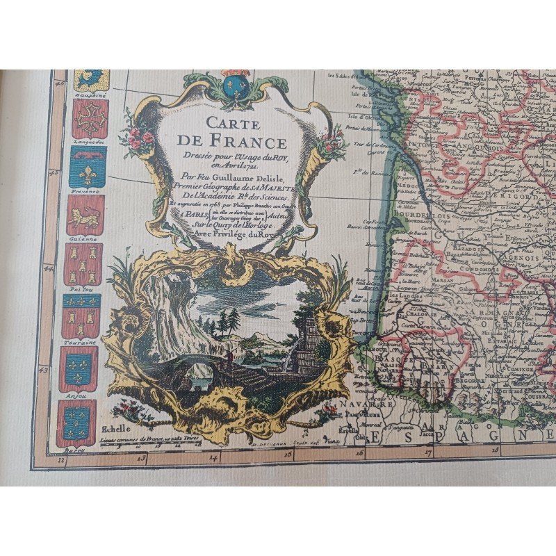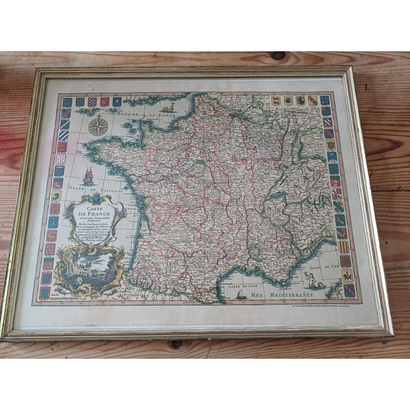Lithograph Map of France by Ph. Ruache 1745, prepared for the use of the King in April 1721 by Guillaume de l'Isle, framed under glass, Dimensions: 54 cm by 43 cm, very good condition.