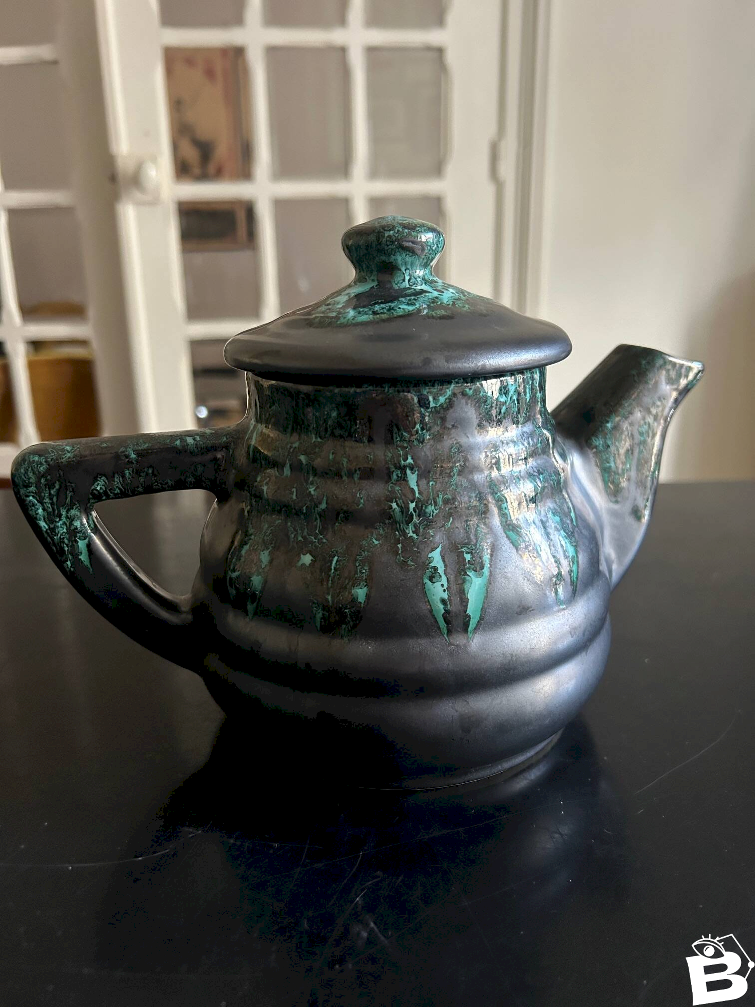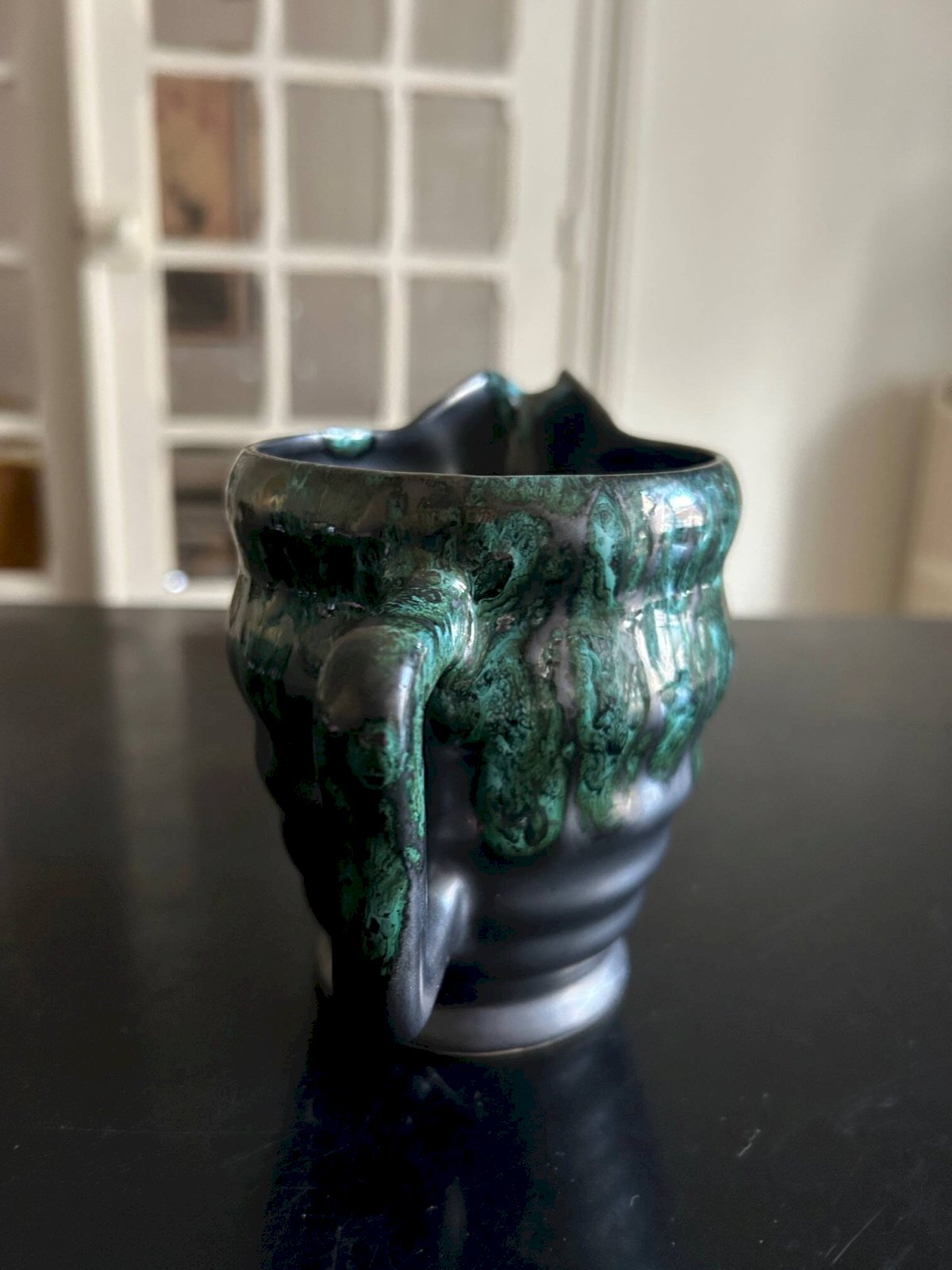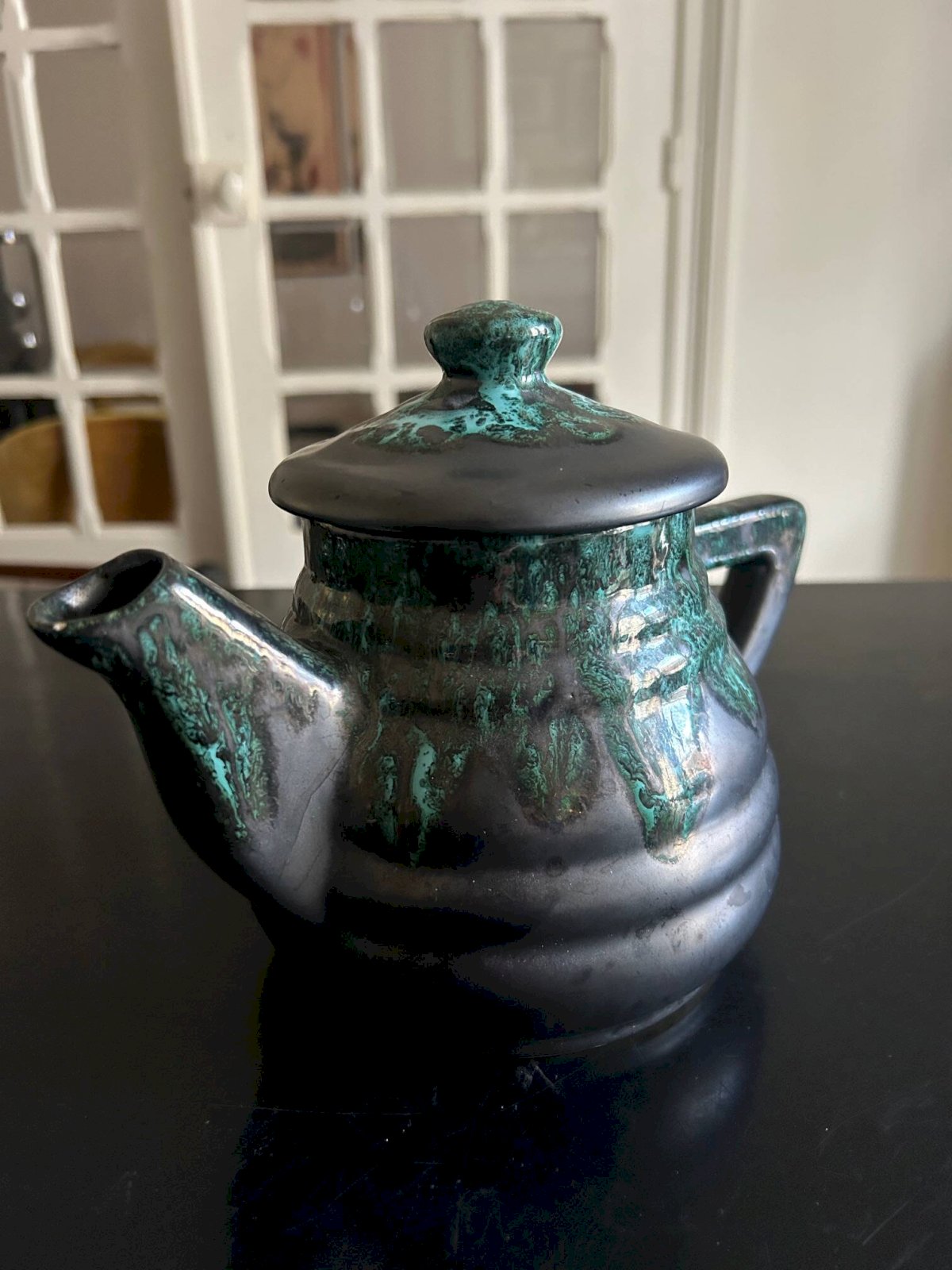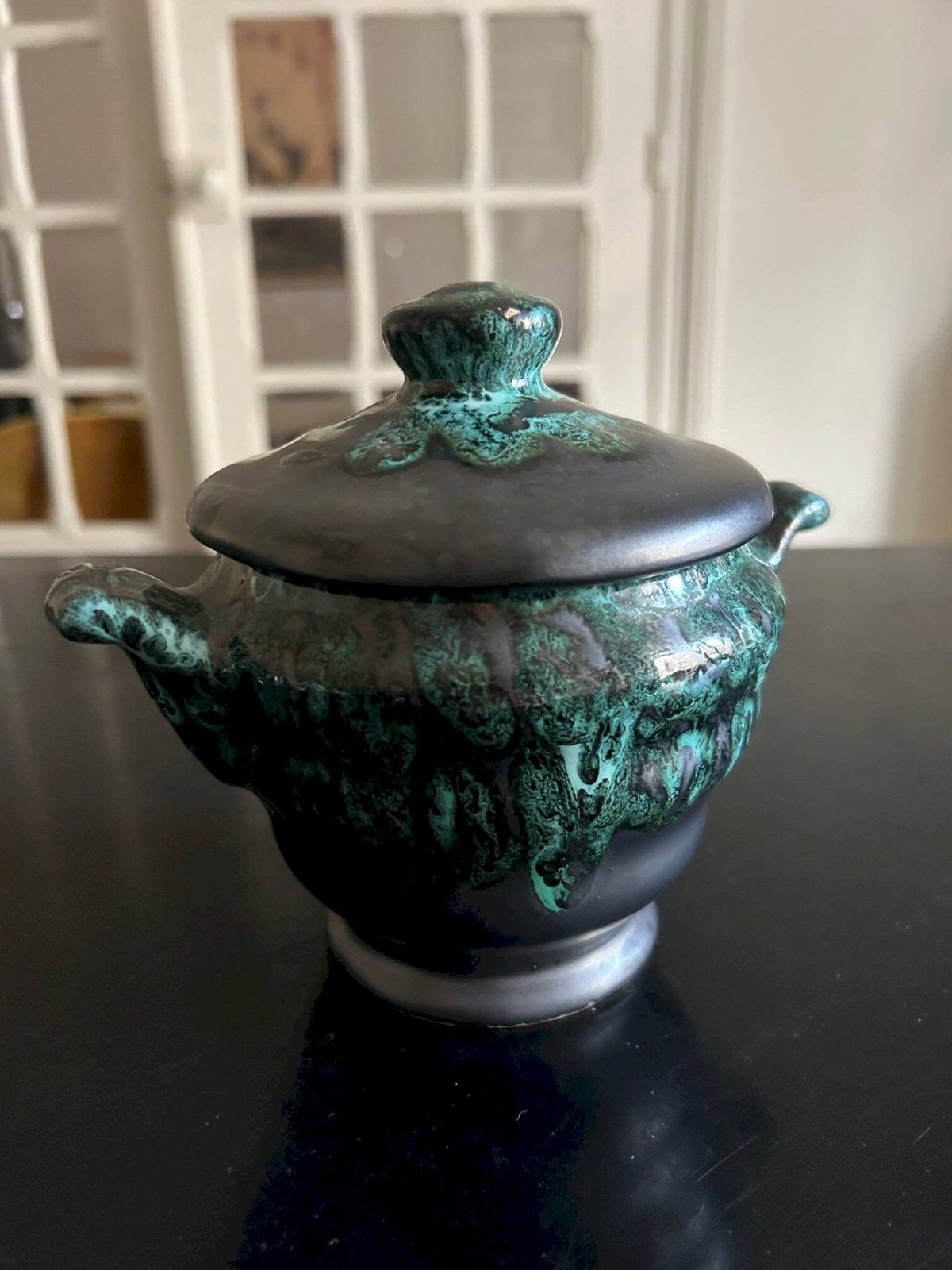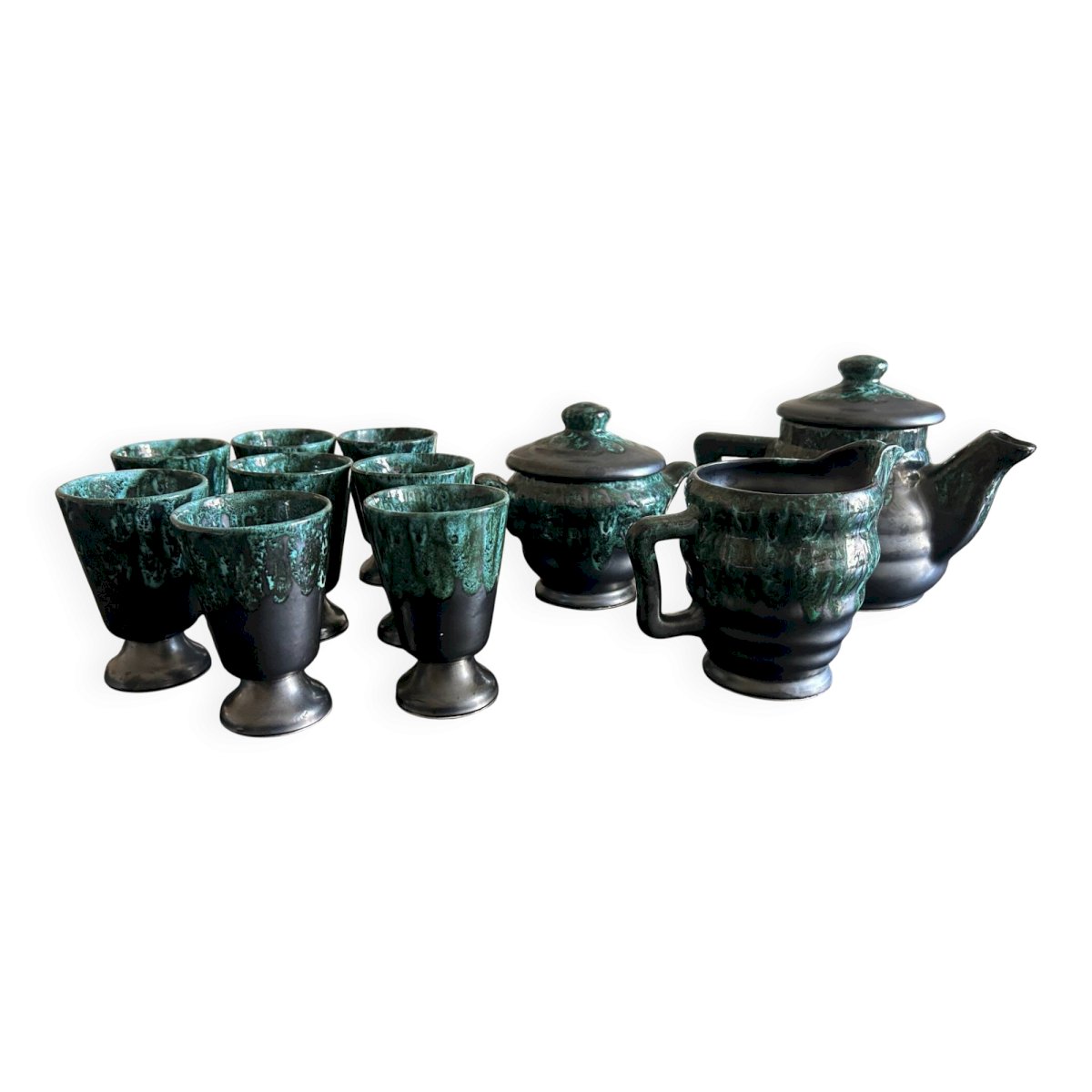 Complete 1950s/60s lava-style ceramic set signed Petit Massé Morvan. Teapot H 18cm L 22cm Diameter 15cm. Sugar bowl H 15cm Width 16cm Depth 12cm. Milk jug H 13cm L 16cm Depth 10cm. 8 Cups H 11cm Diameter 7cm. L: 22 W: 15 H: 18