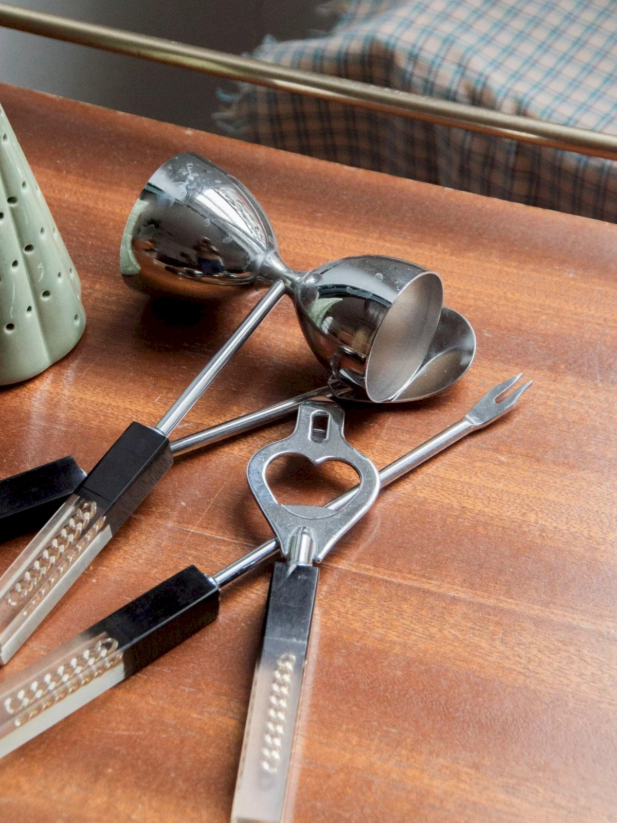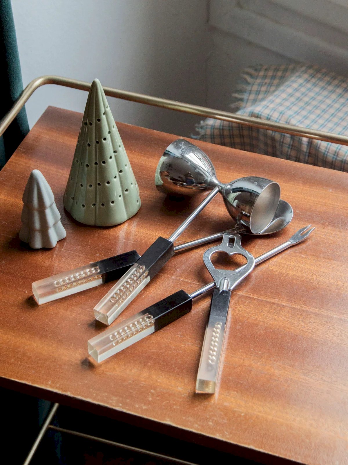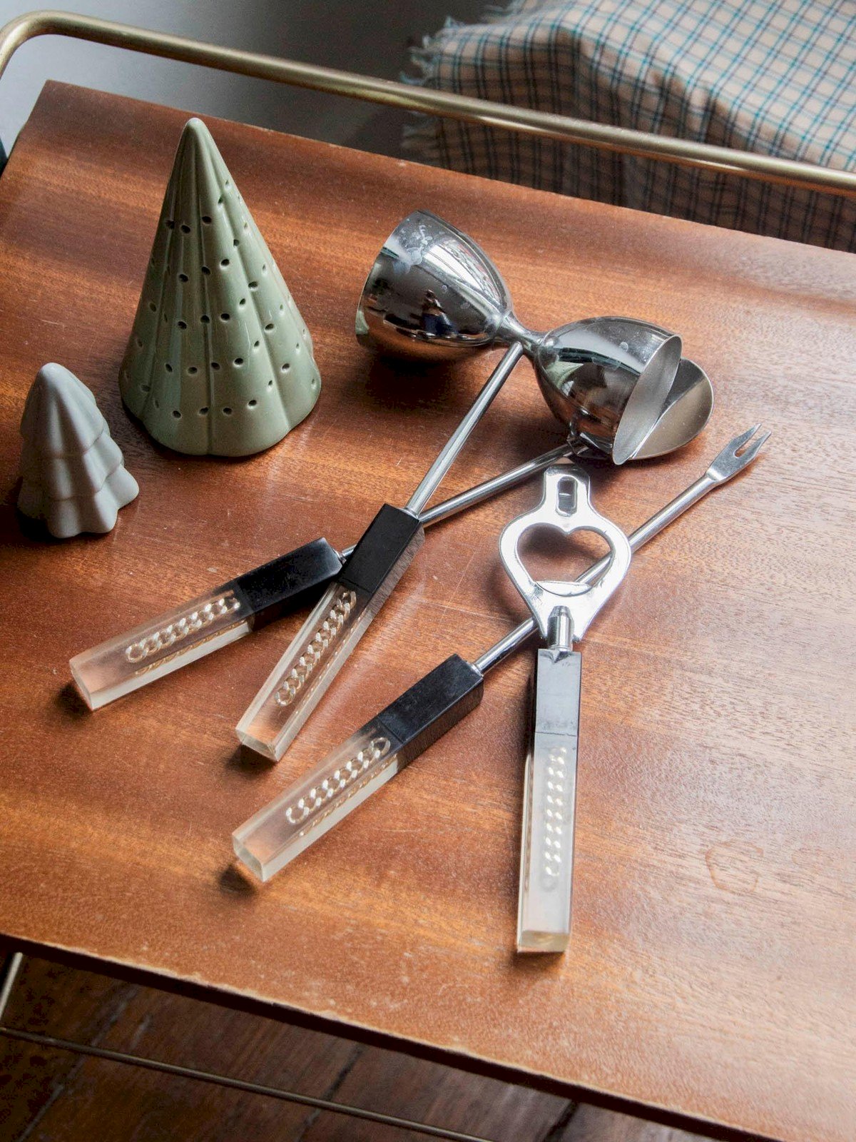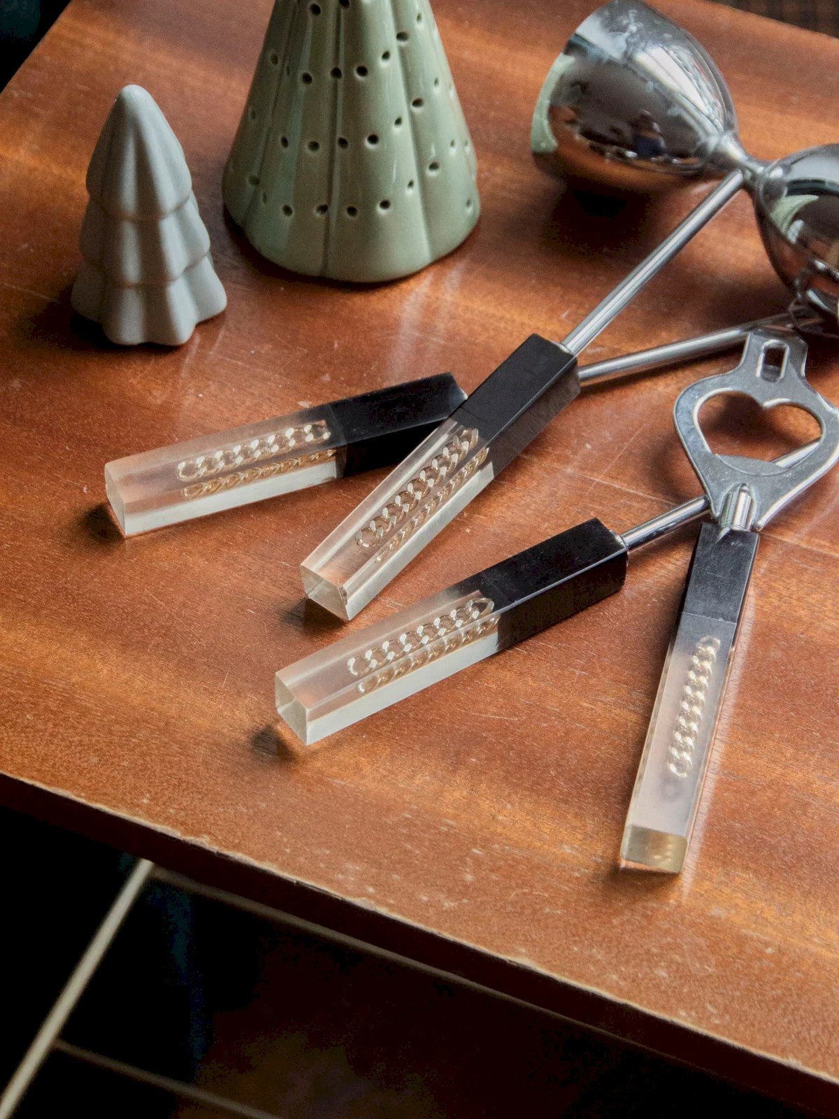 Add this set of four cocktail utensils made of resin and stainless steel, combining modernity and elegance. The set includes a pick, spoon, jigger, and bottle opener, designed for smooth use during your gatherings. The blend of warm resin and polished steel offers a pleasant grip and a refined visual appeal, perfect on a bar or serving trolley. Their compact size and balanced proportions make serving and measuring precise, creating a friendly and tidy atmosphere. Jigger: Length: 9 cm Width: 4.5 cm Height: 16 cm Height: Pick: 22 cm Spoon: 22 cm Bottle opener: 16 cm Condition: Used: Item has been used. Item shows some signs of superficial wear... Used: Item has been used. Item shows some signs of superficial wear, fully operational and functioning correctly. It may be a demonstration model or an item returned to the store after a short period of use. potential imperfections. Brand: Debongout Type: Thrifted product Material: Stainless steel, Resin Style: Country