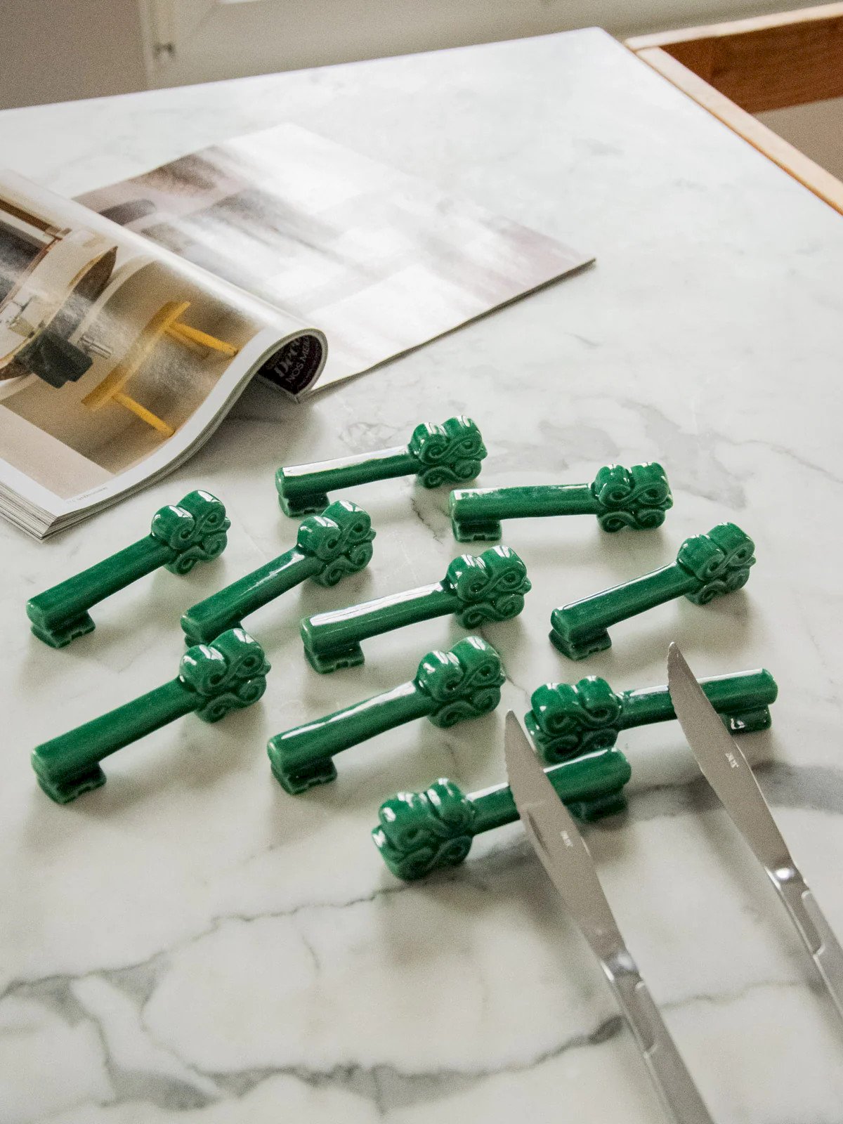 Add a touch of color and elegance with this set of ten green ceramic knife rests, delicately shaped like keys and inspired by Vallauris ceramics. Their glossy material and discreet size lend themselves well to both everyday tables and refined dinners, providing stable support for cutlery. They enliven the presentation with their unique silhouette and vibrant hue, creating a friendly and sophisticated atmosphere. Length: 10 cm Width: 2 cm Height: 3 cm Condition: Used item with some superficial wear marks, fully operational and functioning properly. It may be a demonstration model or an item returned to the store after a short period of use, including any possible imperfections. Brand: Debongout Type: Thrifted Product Material: Ceramic, Enamel Style: Country