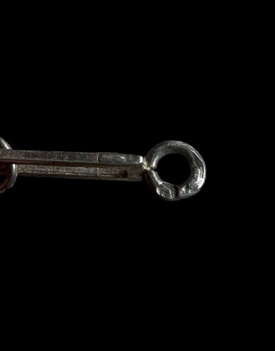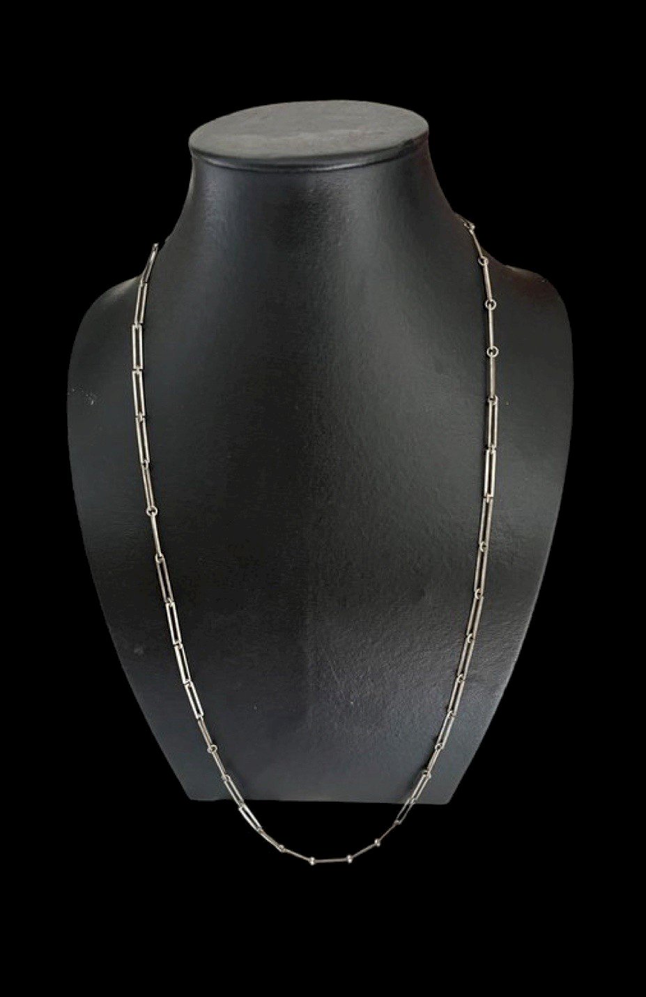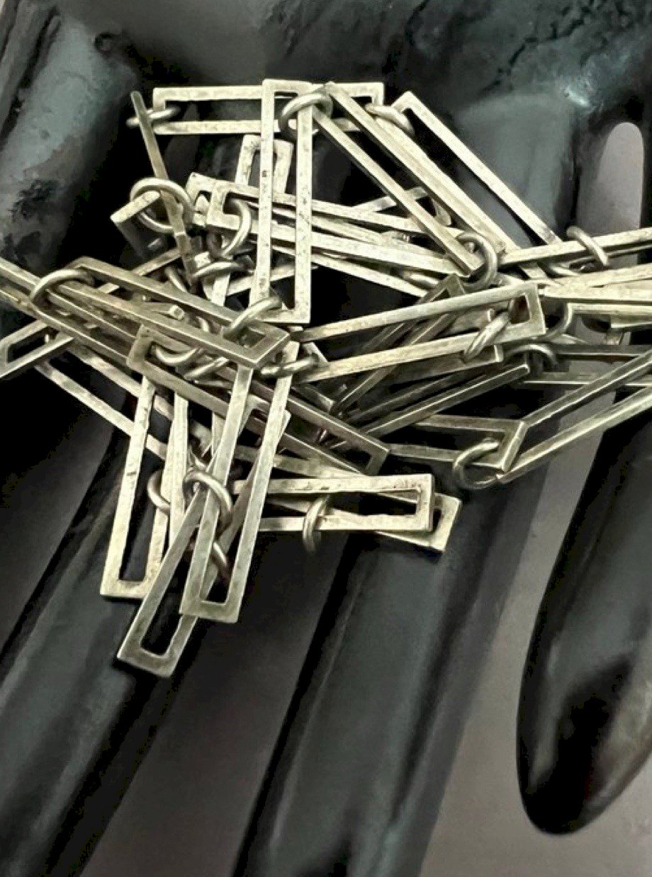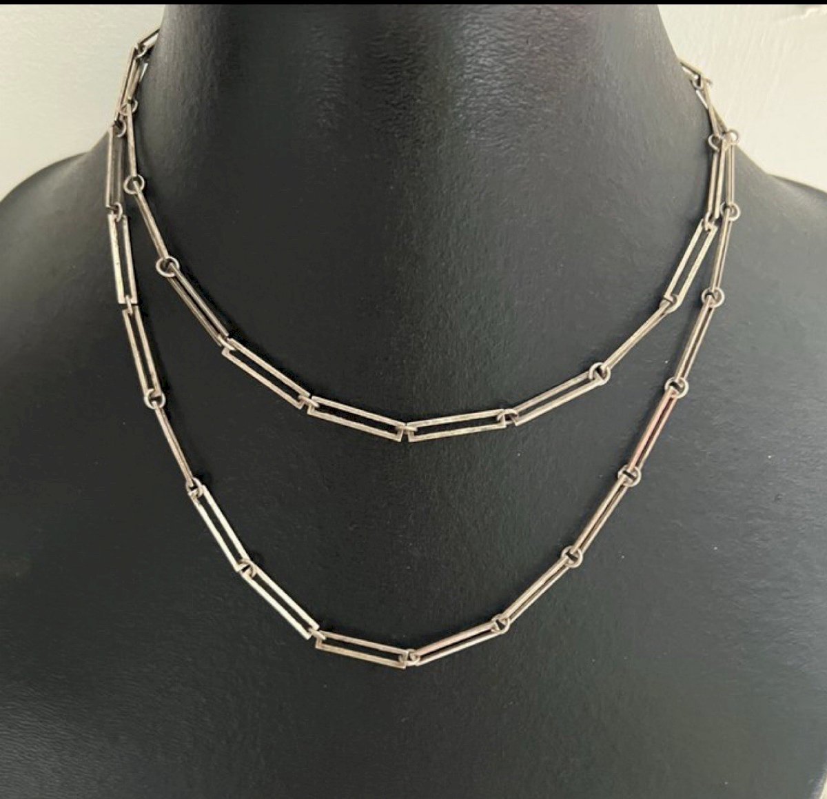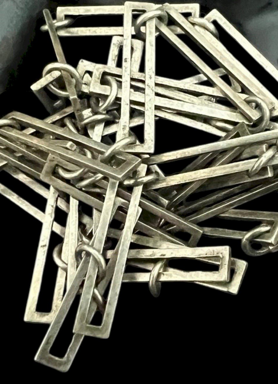 Long geometric silver chain vintage design Unisex rectangular link. Very long design pendant necklace from the 1970s, made of sterling silver, stamped with a crab hallmark. French craftsmanship. Total length approximately 86.5 cm, width of the motif approximately 3 cm, weight approximately 16.8 g. Vintage patina. Condition: Pre-owned: Item that has been worn. Any potential imperfections. Type: Long chain. Theme: Designer. Dominant color: Silver. Dominant stone: None. Brand: Vintage. Country of origin: France. Material: Non-metal: Sterling silver. Length: 81-90 cm.