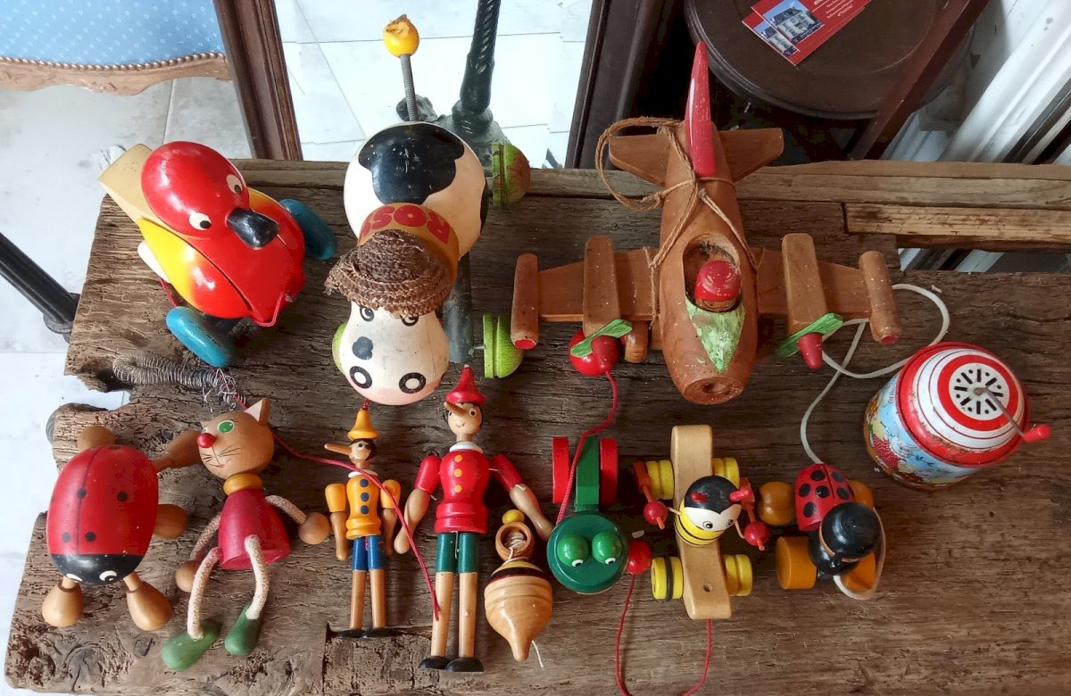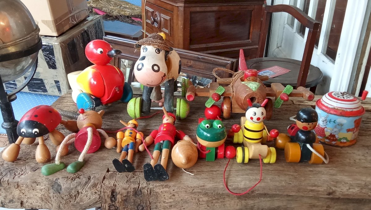 Lot of Vintage Wooden Toys. 12 pieces including Pinocchio, cat, ladybug, frog, cow, duck, airplane... Collection in good condition. Missing the airplane propeller and 1 ladybug antenna. Condition: Used item. Please refer to the seller's description for more details regarding any imperfections. Vehicle/item: Airplanes Material: Wood.