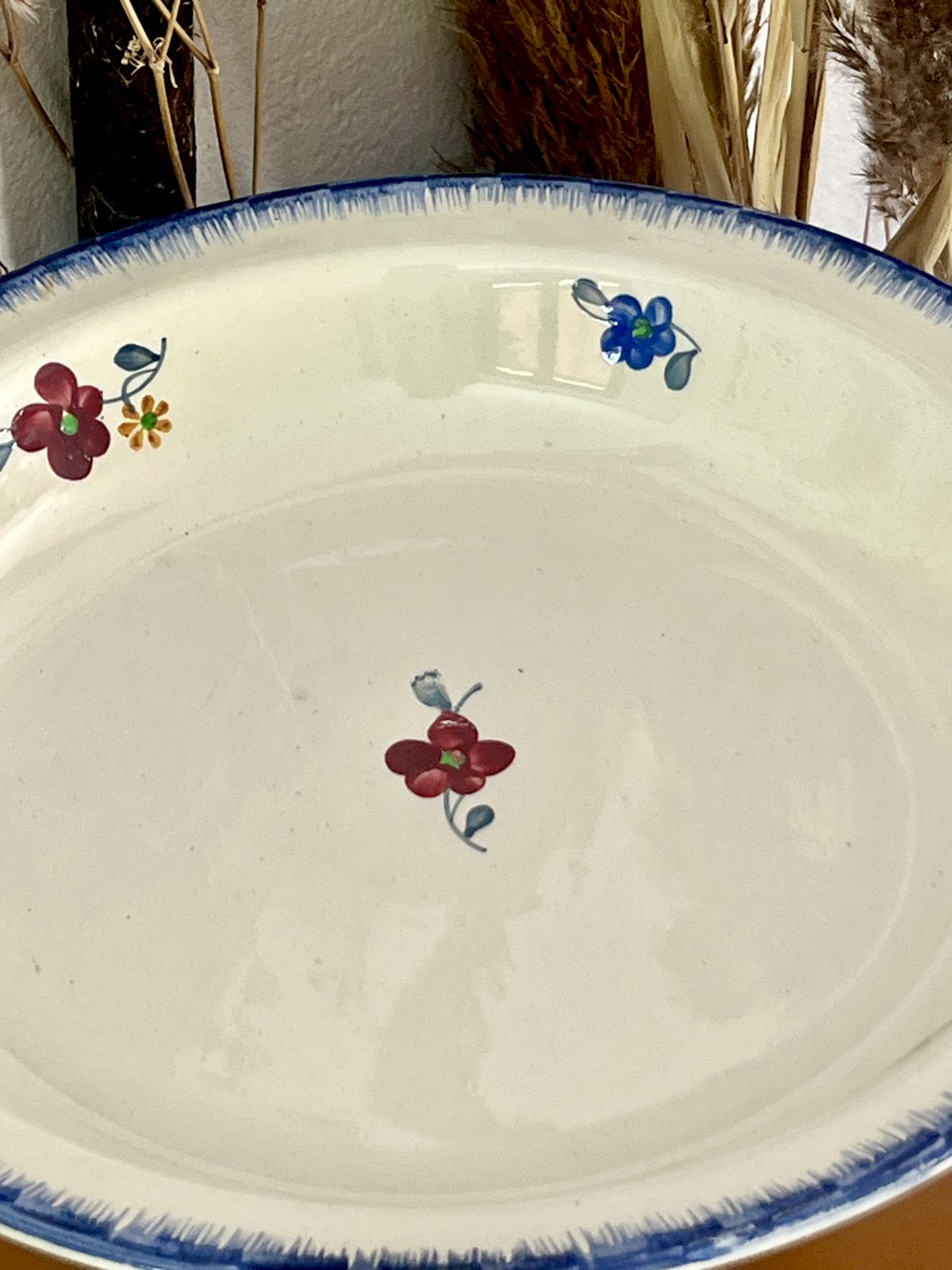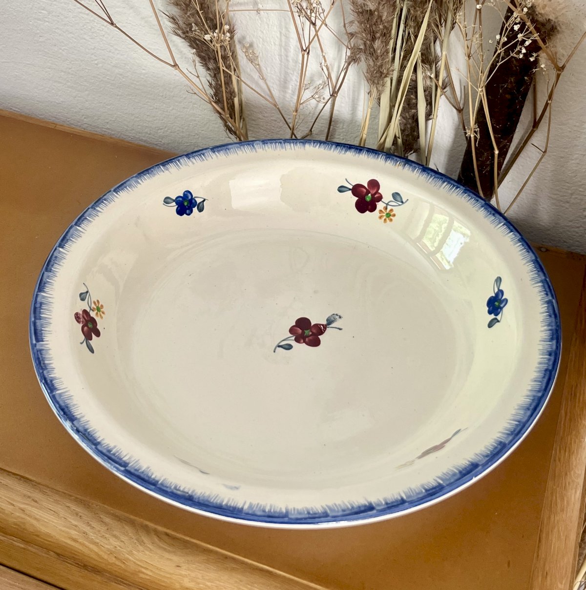 Add a floral touch to your table with this large "Mary Lou" hollow serving platter in opaque porcelain with colorful floral decoration and a blue border on a cream background, hand-painted.