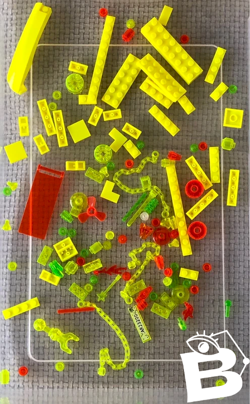 Batch of yellow, orange, and green fluorescent Lego finishing pieces.