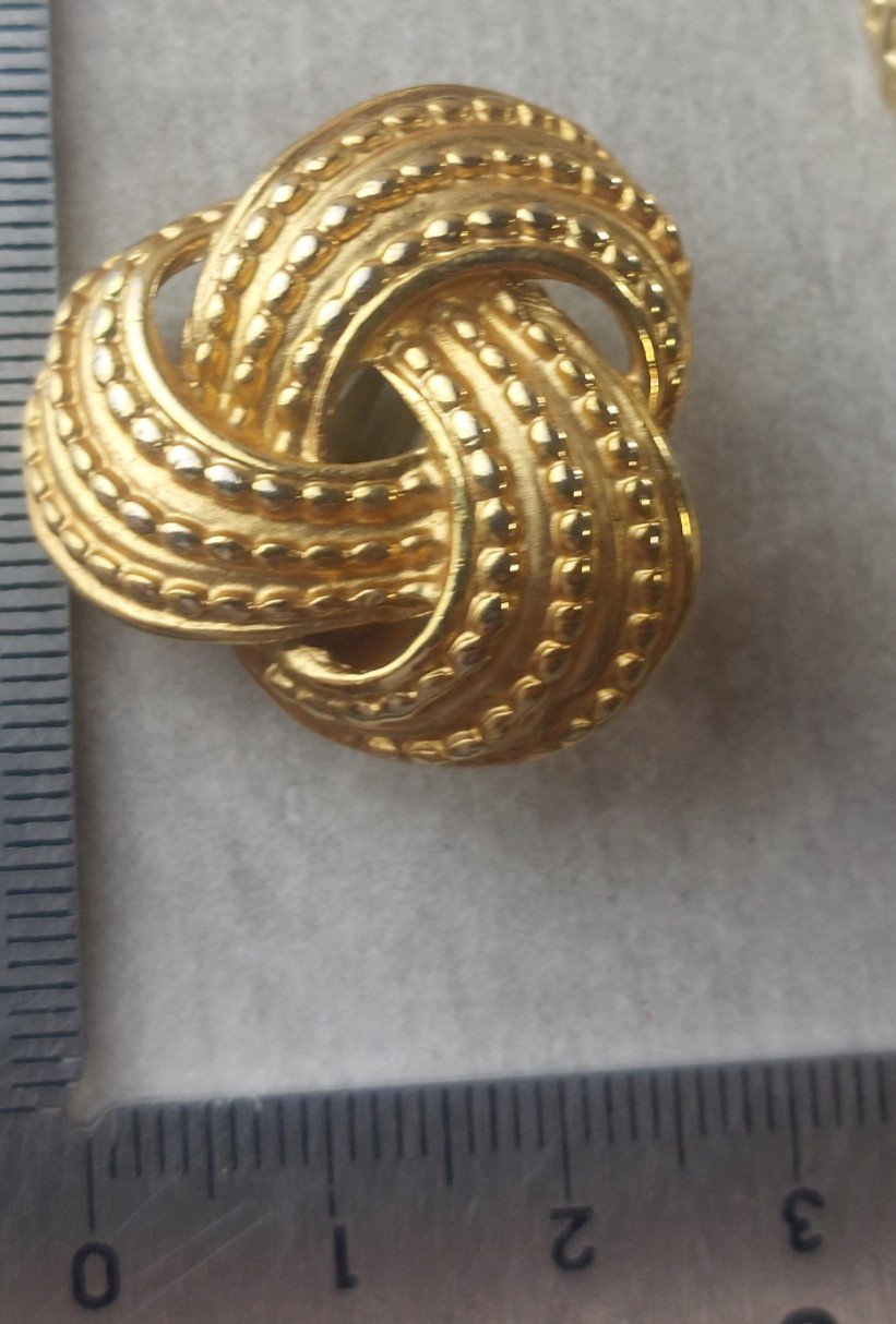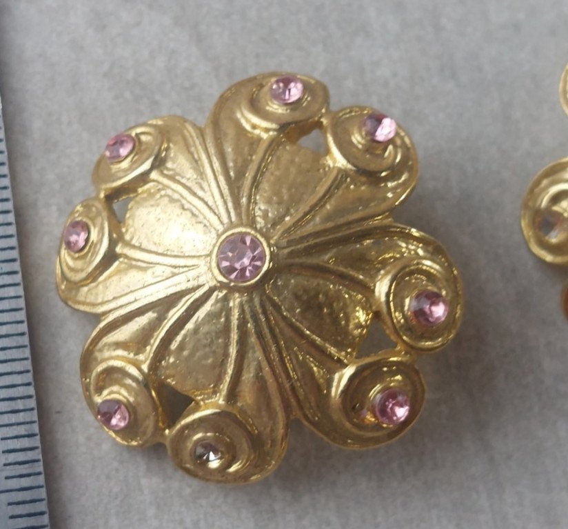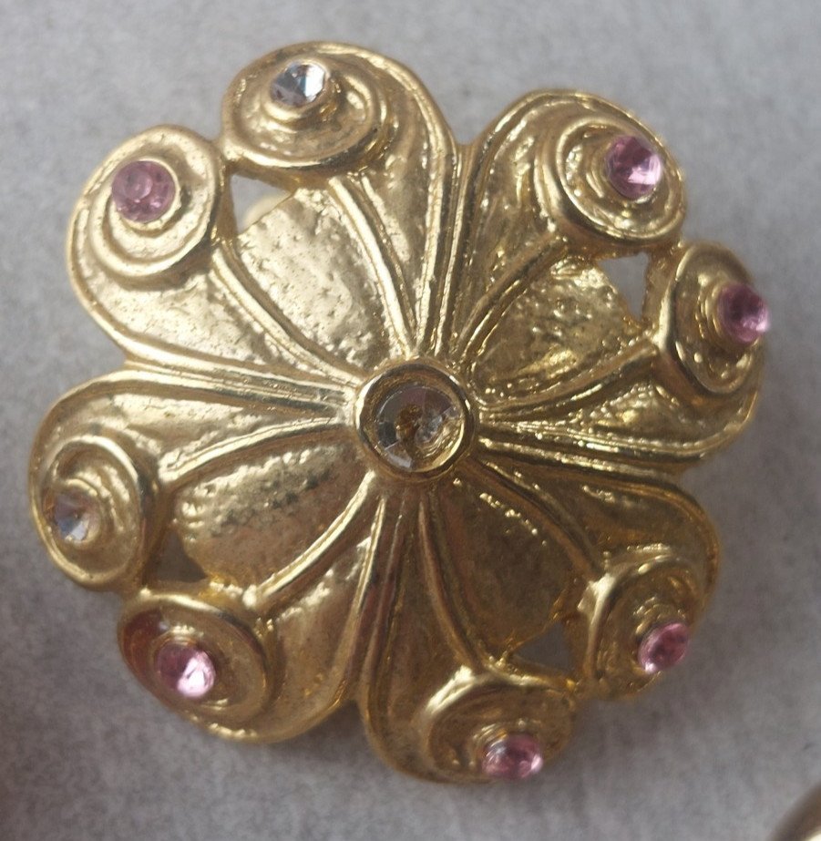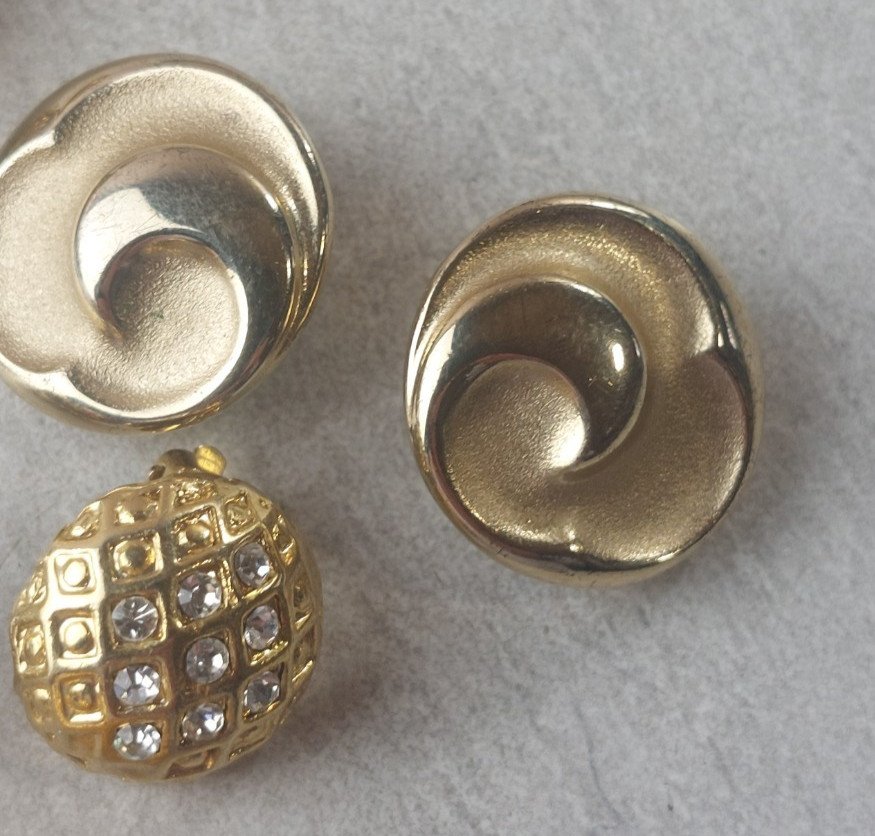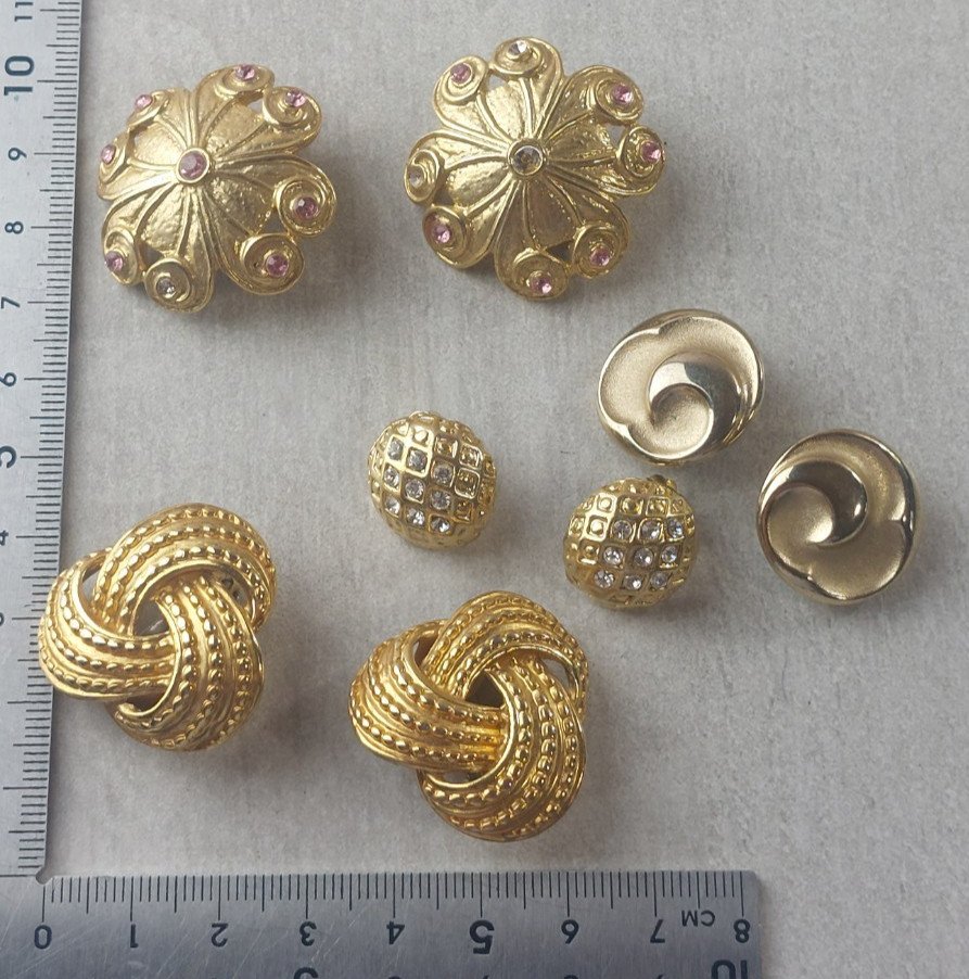 Lot of vintage old clip-on earrings, in gold metal, in good condition, the clips hold well, missing 4 pink rhinestones, one pair marked Soleil, diameter from 1.6 cm to 3.2 cm, see photos. Check out my other items! Shipping discounts for combined purchases. Condition: Used item that has been worn. Possible imperfections. Dominant color: Gold. Closure: Clips.
