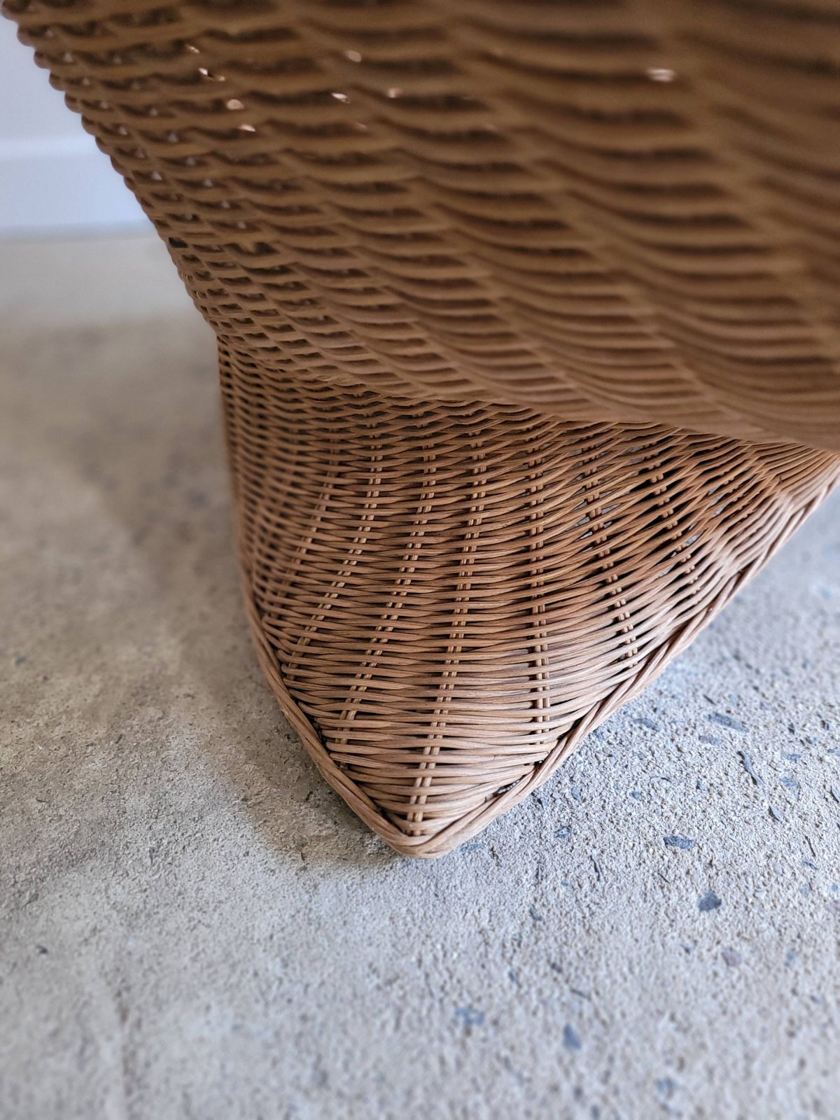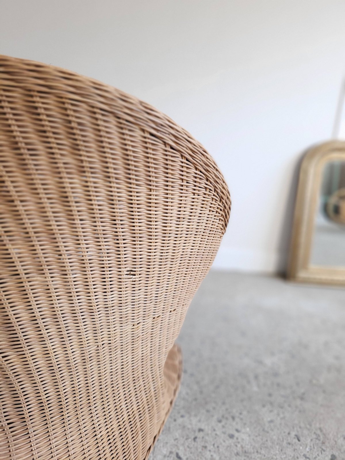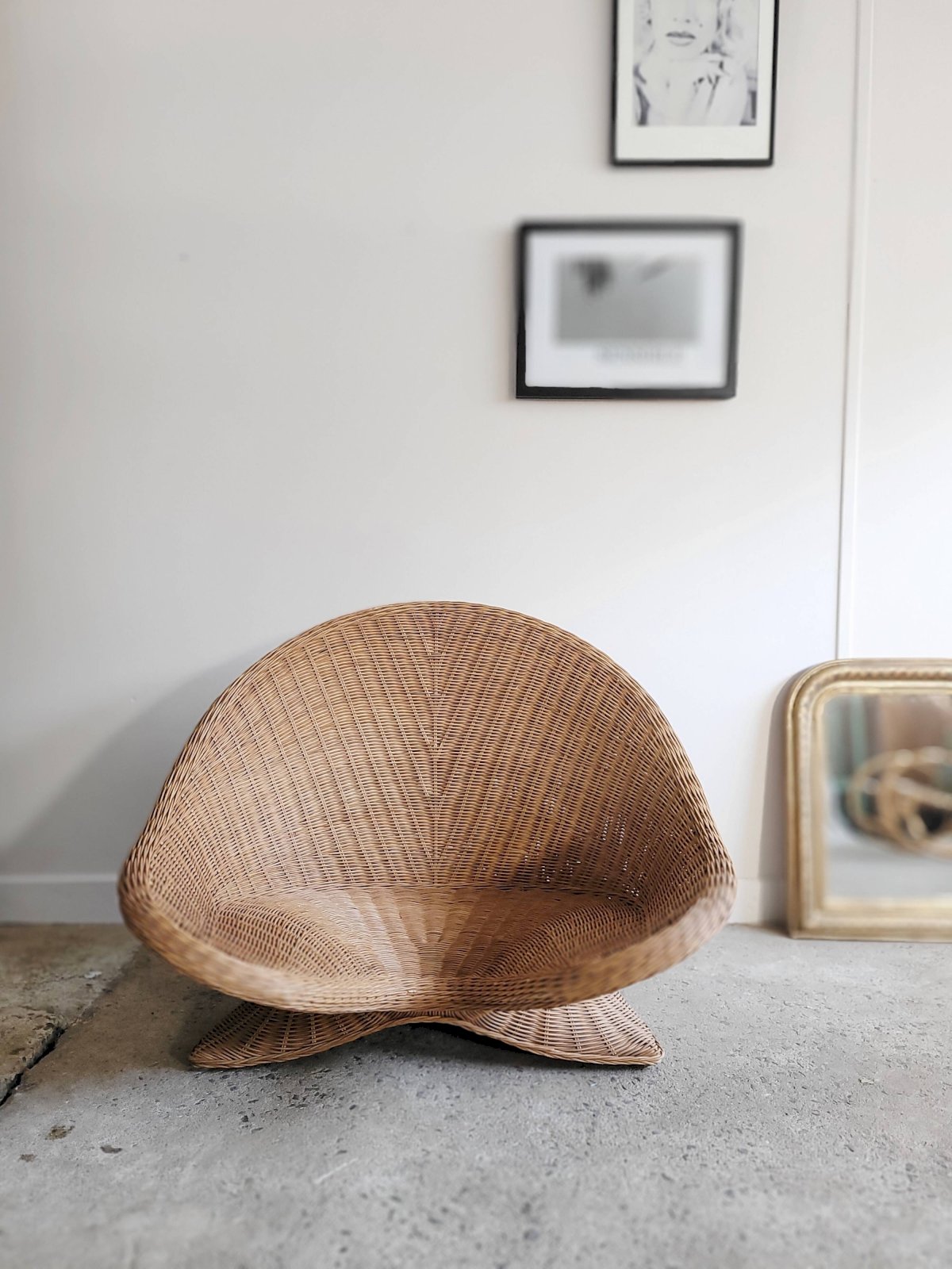 This woven wicker piece showcases remarkable craftsmanship! Its organic style invites tranquility. In overall good condition (see photos). Dimensions: 81 X 68 X 84 cm (L X H X D). L: 81 W: 84 H: 68