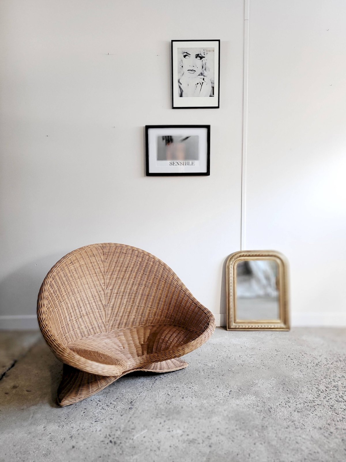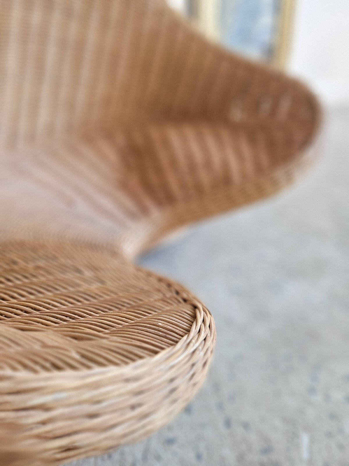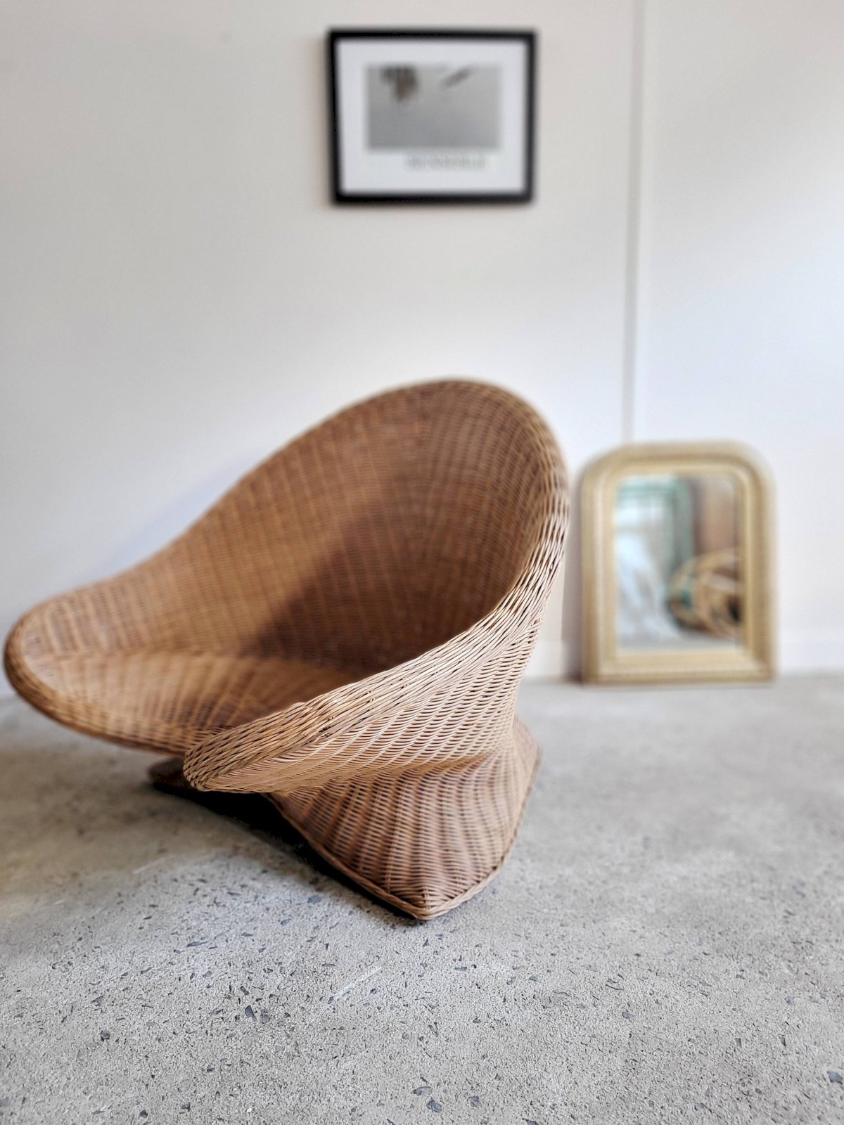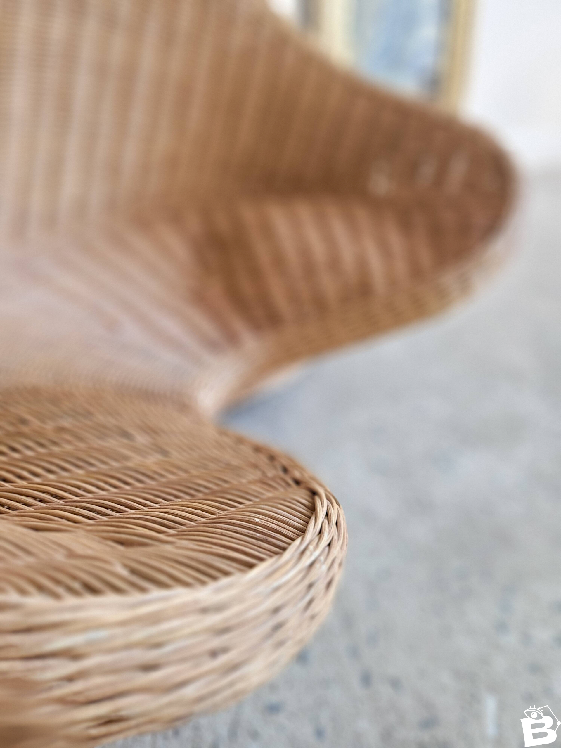 This woven wicker piece showcases remarkable craftsmanship! Its organic style invites tranquility. In overall good condition (see photos). Dimensions: 81 X 68 X 84 cm (L X H X D). L: 81 W: 84 H: 68