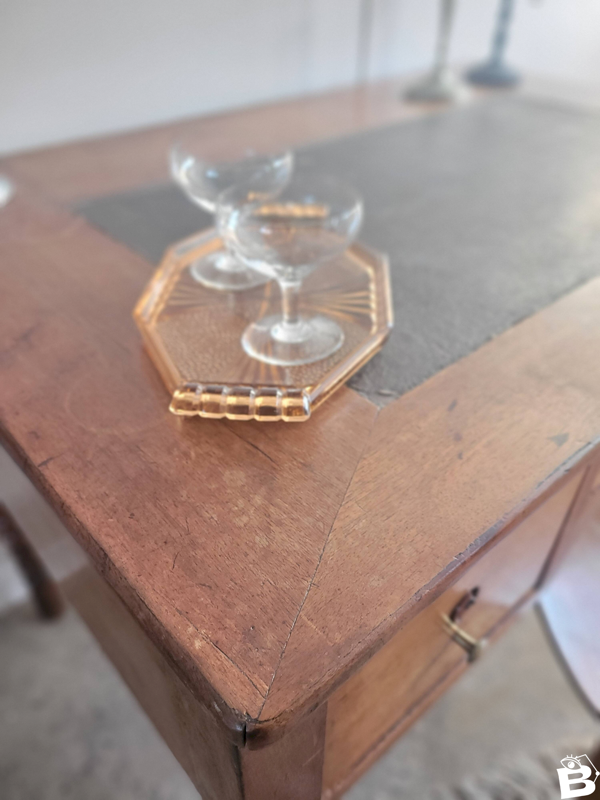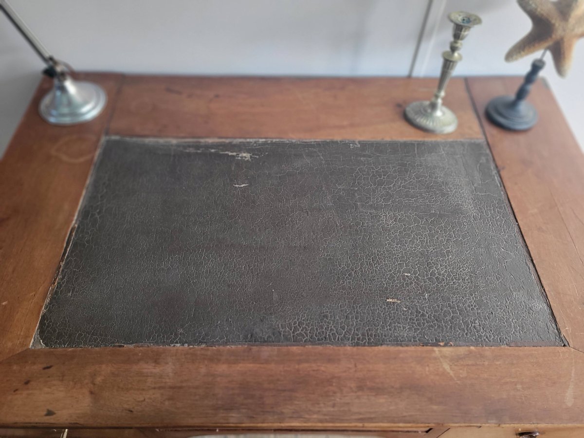 Its turned wooden legs "in rosary" bring a particular aesthetic to this piece. The top is bordered by a wooden frame, which used to protect the wood from ink stains. This antique piece will bring an authentic and chic touch to your interior. In general good condition, with some traces of time here and there (see photos). Dimensions: 115 X 78 X 74 (L X H X D) Height under the top: 63 cm. L: 115 W: 74 H: 78