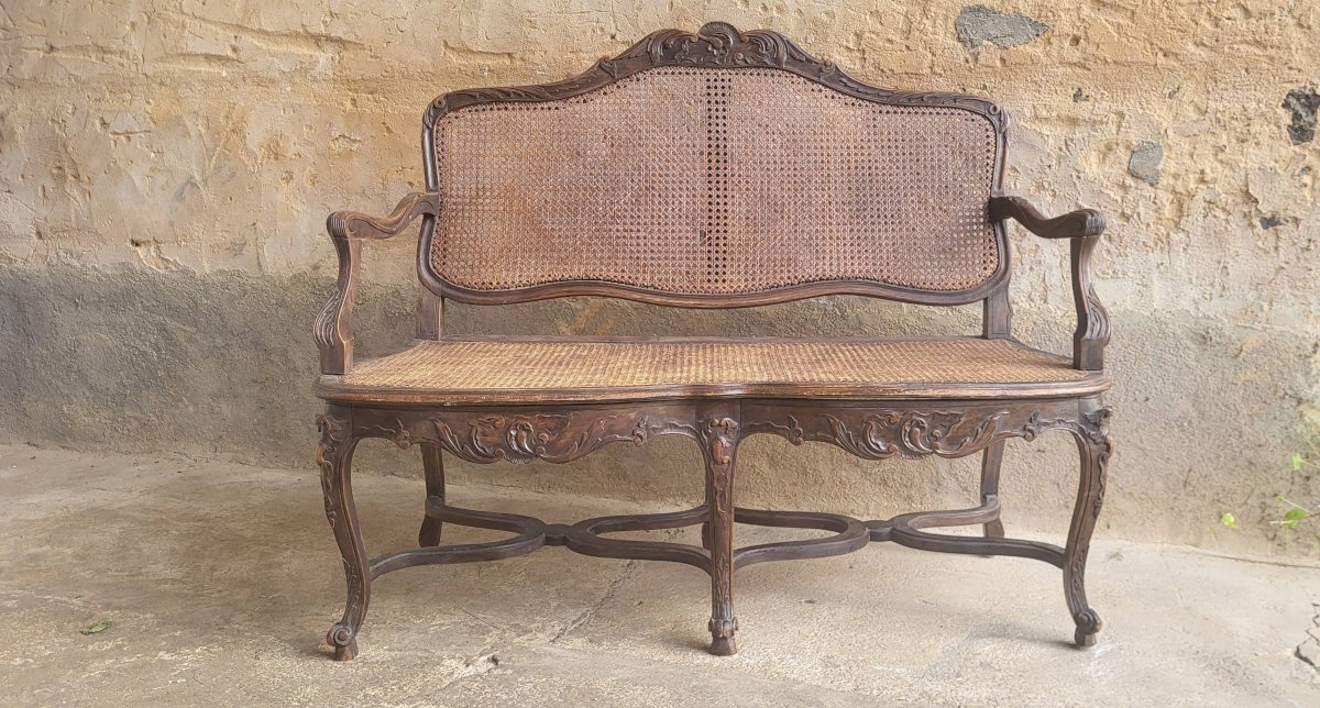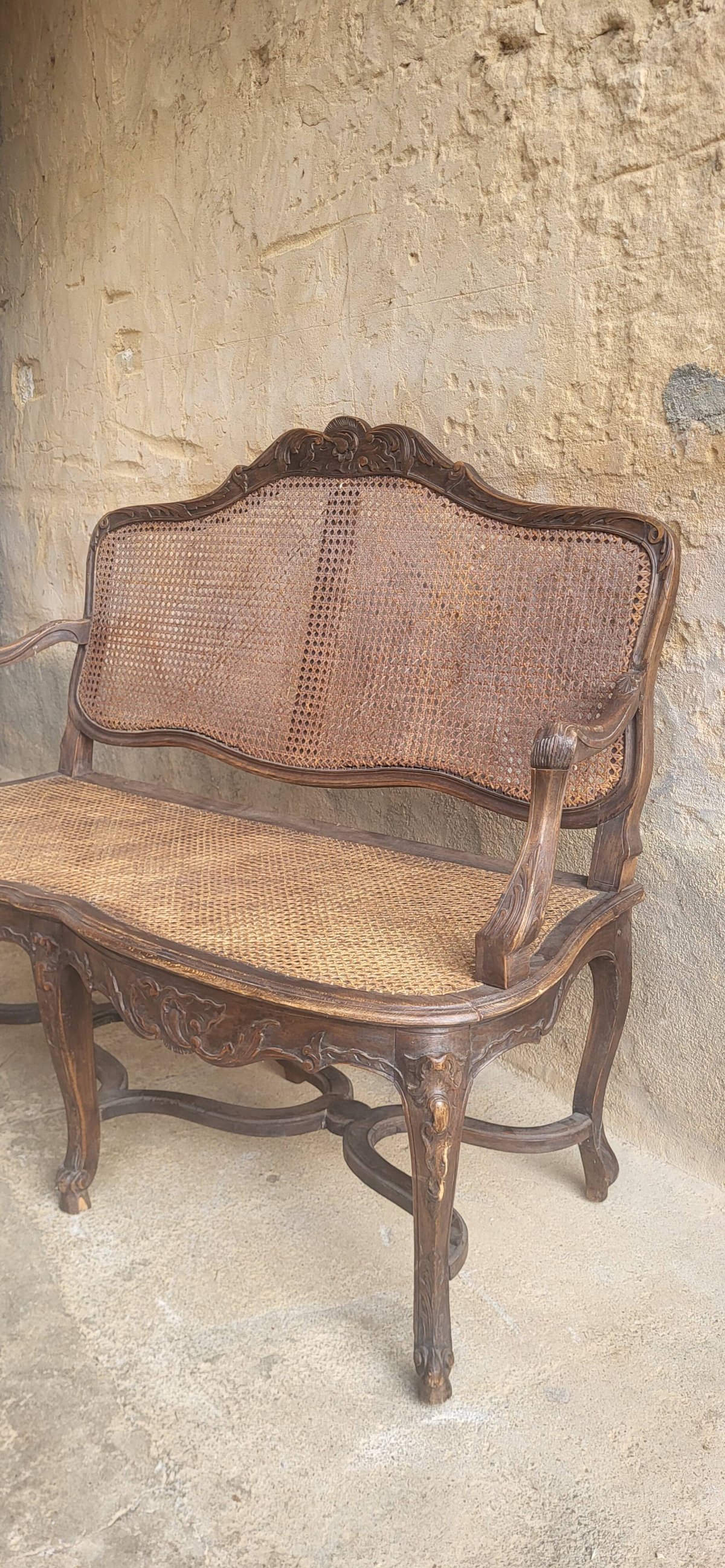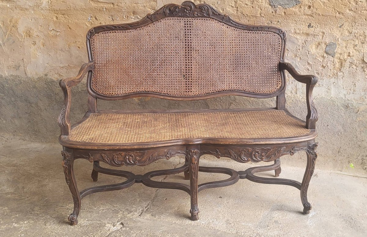 Louis XV caned rattan bench, 19th century. Height 105 cm. Seat height 44.5 cm, width 127 cm, depth 55 cm. The seat is in good condition.