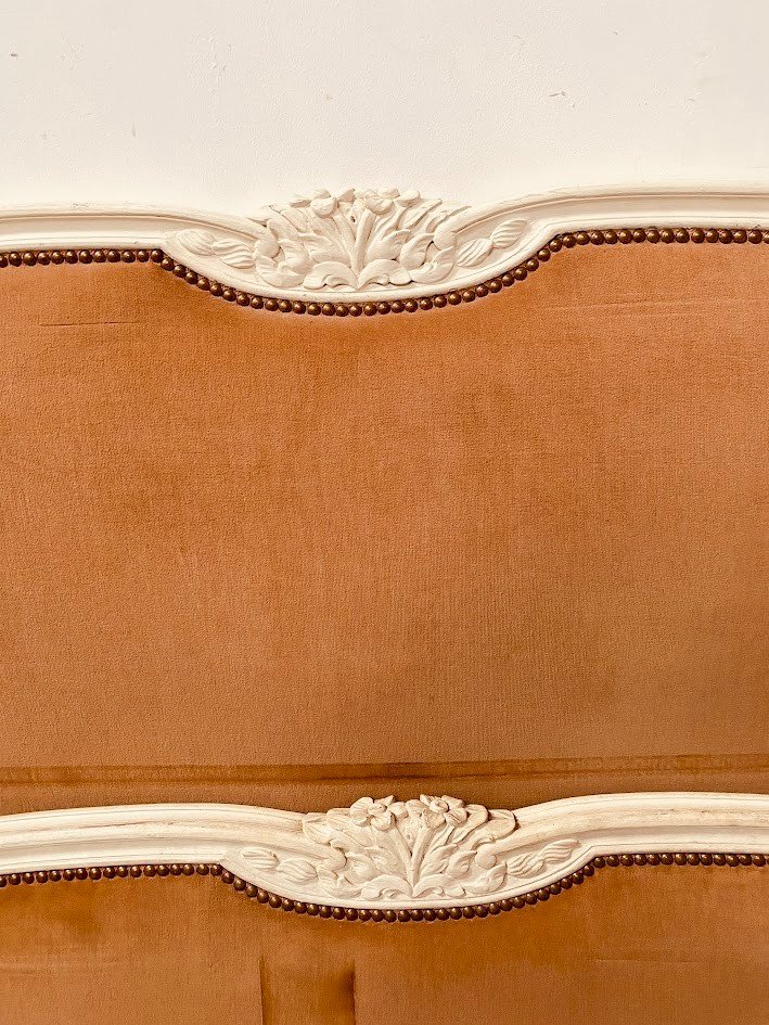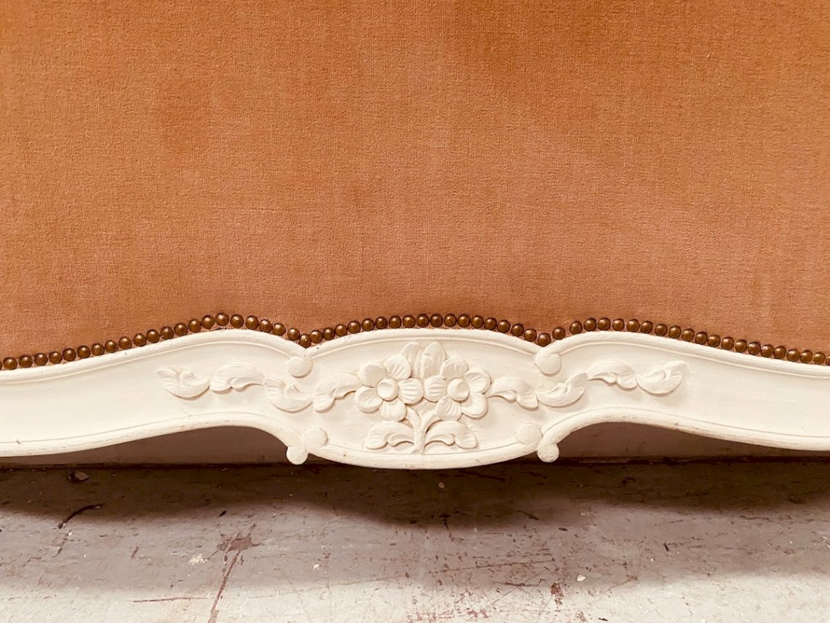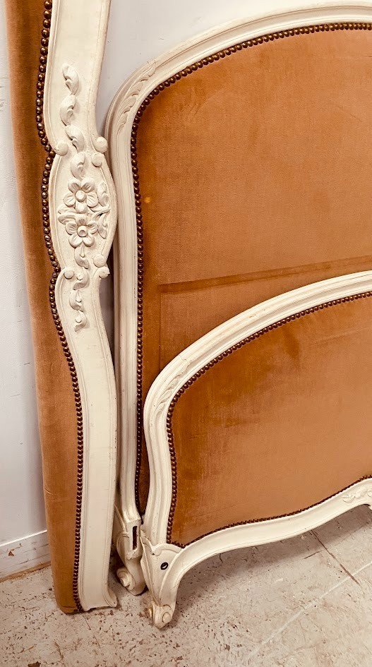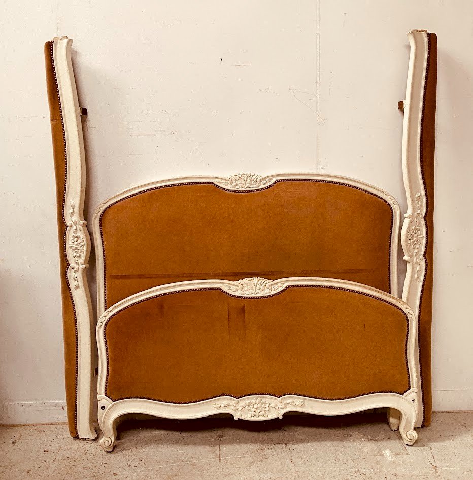 Louis XV style bed in patinated beech Leg with curling Good condition Dimensions H 128 x W 140 x L 190 cm Standard bedding 140 x 190 cm 20th century Color: White Type: Bed frame Period: 20th century design Height: 128 Material: Beech Dimensions (cm): 140x190 Length: 190 Width: 140