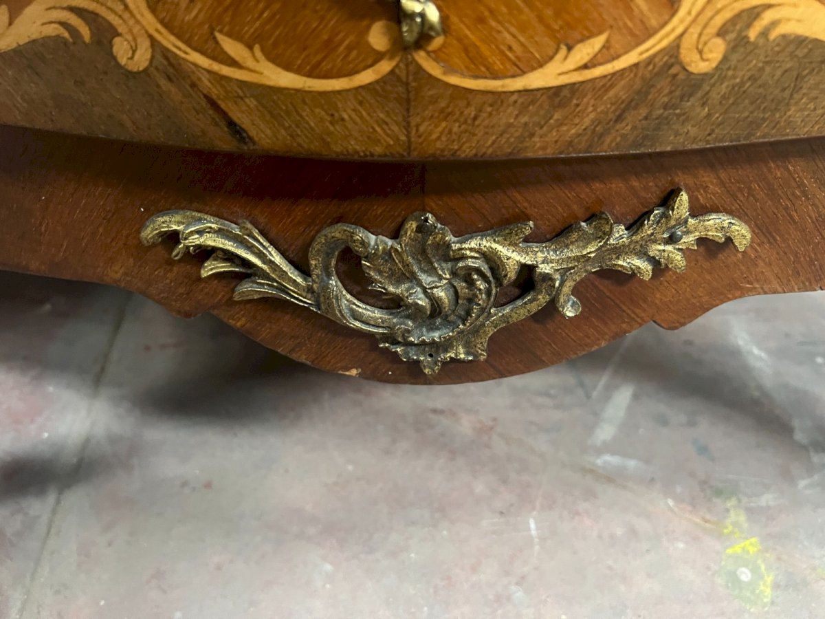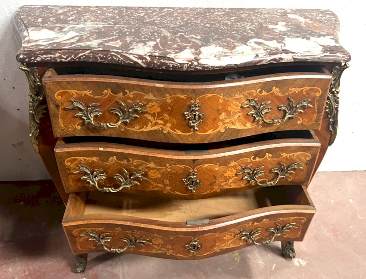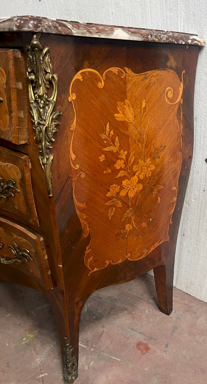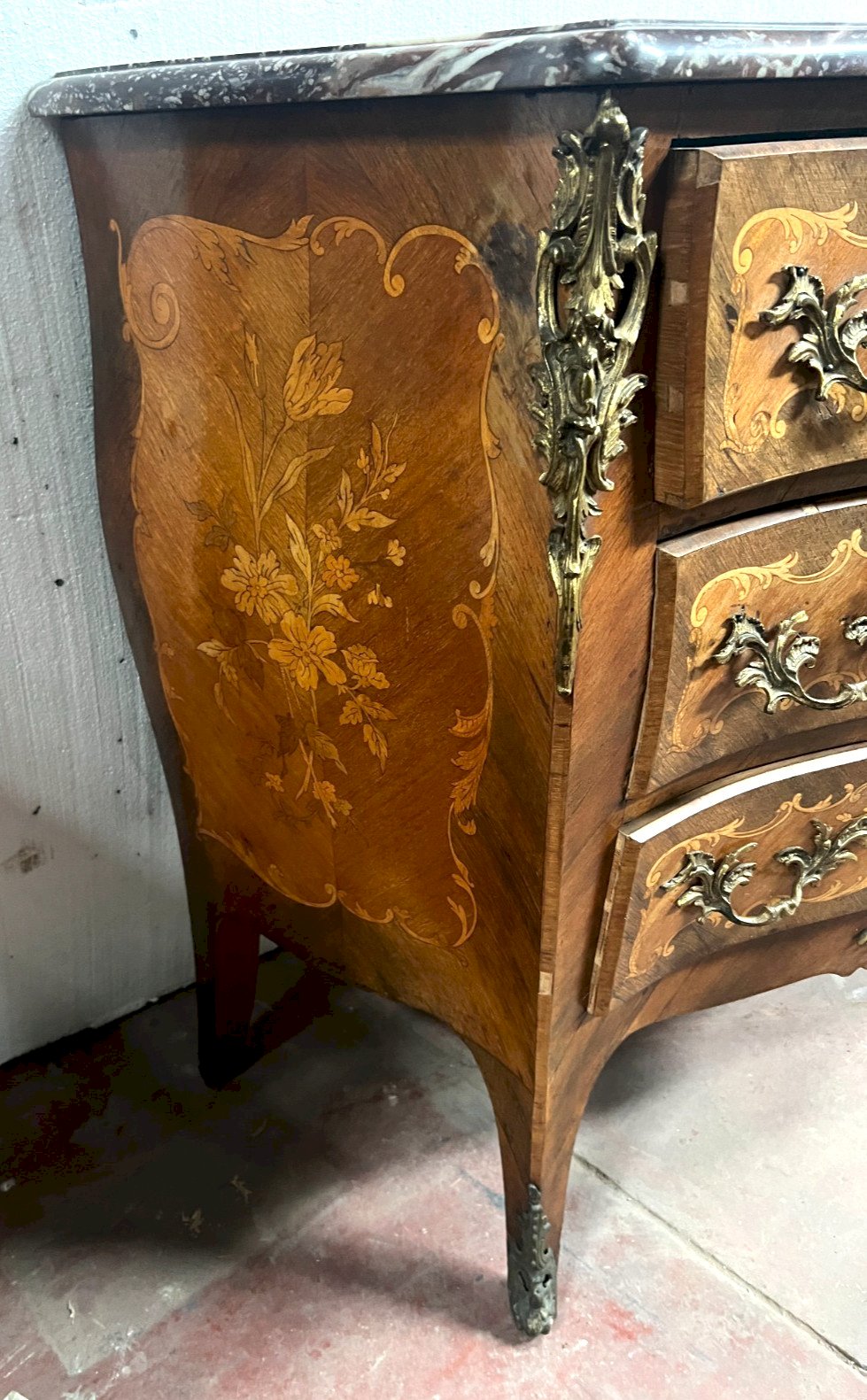 Curved commode on all sides in Louis XV style. Veneer of marquetry on oak background. Marquetry on all sides with floral decor. Top with break marble plateau. Good condition. Dimensions H 92 x W 112 x D 46 cm. 20th century. Color: Multicolored. Type: Commode, Chest of drawers. Period: 20th century design. Origin: France. Subtype: 3 drawers.